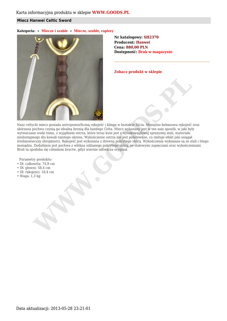 Karta informacyjna produktu w sklepie WWW.GOODS.PL Miecz Hanwei Celtic Sword Kategoria: » Miecze i szable » Miecze, szable, rapiery Nr katalogowy: SH2370 Producent: Hanwei Cena: 880,00 PLN Dostępność: Brak w magazynie S. PL Zobacz produkt w sklepie W .G W W Parametry produktu: • Dł. całkowita: 74,9 cm • Dł. głowni: 58,4 cm • Dł. rękojeści: 18,4 cm • Waga: 1,3 kg O O D Nasz celtycki miecz posiada antropomorficzną rękojeść i klingę w kształcie liścia. Mosiężno hebanowa rękojeść oraz skórzana pochwa czynią go idealną bronią dla każdego Celta. Miecz wykonany jest w ten sam sposób, w jaki były wytwarzane wieki temu, z wyjątkiem ostrza, które teraz kute jest z wysokowęglowej sprężystej stali, materiału niedostępnego dla kowali tamtego okresu. Wykończenie ostrza nie jest polerowane, co imituje efekt jaki osiągał średniowieczny zbrojmistrz. Rękojeść jest wykonana z drewna pokrytego skórą. Wykończenia wykonane są ze stali i litego mosiądzu. Dodatkiem jest pochwa z włókna szklanego pokrytego skórą, ze stalowymi zapięciami oraz wykończeniami. Broń ta spodoba się członkom bractw, gdyż wiernie odtwarza oryginał. Data aktualizacji: 2013-05-28 23:21:01