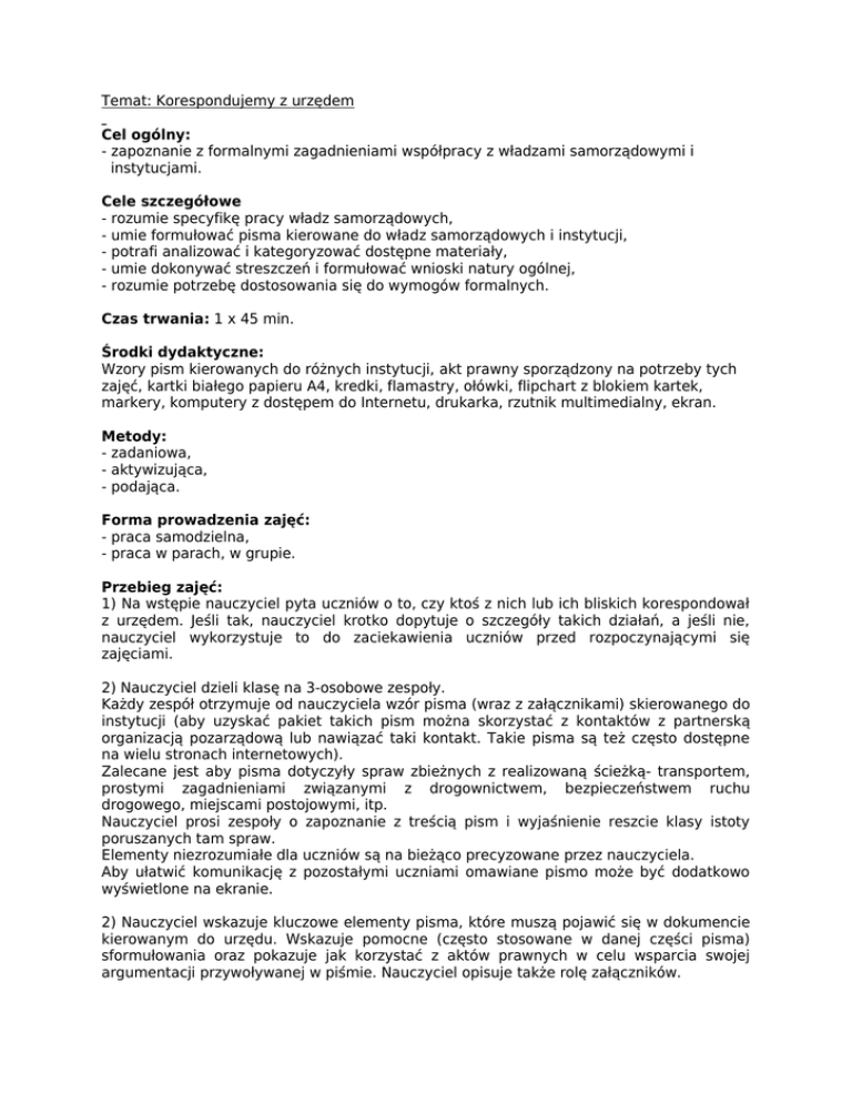 Temat: Korespondujemy z urzędem Cel ogólny: - zapoznanie z formalnymi zagadnieniami współpracy z władzami samorządowymi i instytucjami. Cele szczegółowe - rozumie specyfikę pracy władz samorządowych, - umie formułować pisma kierowane do władz samorządowych i instytucji, - potrafi analizować i kategoryzować dostępne materiały, - umie dokonywać streszczeń i formułować wnioski natury ogólnej, - rozumie potrzebę dostosowania się do wymogów formalnych. Czas trwania: 1 x 45 min. Środki dydaktyczne: Wzory pism kierowanych do różnych instytucji, akt prawny sporządzony na potrzeby tych zajęć, kartki białego papieru A4, kredki, flamastry, ołówki, flipchart z blokiem kartek, markery, komputery z dostępem do Internetu, drukarka, rzutnik multimedialny, ekran. Metody: - zadaniowa, - aktywizująca, - podająca. Forma prowadzenia zajęć: - praca samodzielna, - praca w parach, w grupie. Przebieg zajęć: 1) Na wstępie nauczyciel pyta uczniów o to, czy ktoś z nich lub ich bliskich korespondował z urzędem. Jeśli tak, nauczyciel krotko dopytuje o szczegóły takich działań, a jeśli nie, nauczyciel wykorzystuje to do zaciekawienia uczniów przed rozpoczynającymi się zajęciami. 2) Nauczyciel dzieli klasę na 3-osobowe zespoły. Każdy zespół otrzymuje od nauczyciela wzór pisma (wraz z załącznikami) skierowanego do instytucji (aby uzyskać pakiet takich pism można skorzystać z kontaktów z partnerską organizacją pozarządową lub nawiązać taki kontakt. Takie pisma są też często dostępne na wielu stronach internetowych). Zalecane jest aby pisma dotyczyły spraw zbieżnych z realizowaną ścieżką- transportem, prostymi zagadnieniami związanymi z drogownictwem, bezpieczeństwem ruchu drogowego, miejscami postojowymi, itp. Nauczyciel prosi zespoły o zapoznanie z treścią pism i wyjaśnienie reszcie klasy istoty poruszanych tam spraw. Elementy niezrozumiałe dla uczniów są na bieżąco precyzowane przez nauczyciela. Aby ułatwić komunikację z pozostałymi uczniami omawiane pismo może być dodatkowo wyświetlone na ekranie. 2) Nauczyciel wskazuje kluczowe elementy pisma, które muszą pojawić się w dokumencie kierowanym do urzędu. Wskazuje pomocne (często stosowane w danej części pisma) sformułowania oraz pokazuje jak korzystać z aktów prawnych w celu wsparcia swojej argumentacji przywoływanej w piśmie. Nauczyciel opisuje także rolę załączników. Istotą tego etapu jest zwrócenie uwagi uczniów na zapoznanie z samą konstrukcją pisma, a nie wskazywanie np. konkretnych aktów prawnych czy sposobów rozwiązana danej sprawy. 3) Nauczyciel rozdaje (lub zespoły losują) problemowe zagadnienia, którymi będą się zajmować podczas ćwiczenia (np. wniosek o parking rowerowy pod szkołą, wniosek o umieszczenie stojaków rowerowych pod domem kultury, wniosek o przeniesienie przystanku autobusowego w pobliże szkoły, wniosek o wprowadzenie ograniczenia prędkości na ulicy przebiegającej w pobliżu szkoły, wniosek o przeznaczenie środków na szkolne obchody Dnia Bez Samochodu, wniosek o zakup kilku rowerów na potrzeby lekcji wychowania fizycznego i wychowania komunikacyjnego, itp. Materiałem pomocniczym do tego ćwiczenia jest fikcyjny akt prawny (regulujący kwestie upowszechniania transportu zrównoważonego na terenie miasta), na którym będą bazować uczniowie i powoływać się na jego treść. Nauczyciel rozdaje także listę instytucji i urzędów, spośród których uczniowie wybiorą adresata swojego pisma (lub swoich pism, jeśli uznają za konieczne wnioskowanie do kilku adresatów). Każdy adresat z tej listy jest także opisany pod względem ogólnego zakresu kompetencji i obowiązków. Dzięki powyższym krokom uczniowie mają okazję pracować w warunkach bardzo zbliżonych do rzeczywistości- muszą samodzielnie zdecydować o podstawie prawnej swojego pisma oraz dobrać właściwego adresata. Zadaniem zespołów jest sporządzenie pisma (pism) wraz z niezbędnymi załącznikami (rysunki poglądowe, grafiki, przykłady wdrożeń proponowanych rozwiązań, itp.) dotyczących przydzielonego (lub wylosowanego) zagadnienia. Sposobem rozwinięcia tego ćwiczenia jest przygotowanie uczniów do pełnienia roli urzędników, którzy będą przyjmowali wniosek składany przez inną grupę. W tym celu nauczyciel wyświetla (lub rozdaje w formie wydrukowanej) listę wytycznych, którymi będą kierować się uczniowie w momencie „pełnienia” funkcji urzędników- np. sprawdzanie zgodności z przytoczonym aktem prawnym, właściwe zaadresowanie, jasność przekazu pisma kierowanego do urzędu, adekwatność załączników, itp.). 4) Po zakończeniu prac lub upływie określonego wcześniej czasu kolejne grupy przedstawiają treść swoich pism na forum grupy, a jeden z zespołów pełni wtedy funkcję urzędników, którzy przyjmują wniosek. Aby w pełni oddać procedurę składania pisma, każda grupa drukuje swoje pismo w dwóch egzemplarzach i otrzymuje „w sekretariacie” urzędników potwierdzenie jego złożenia na jednym z nich. Każda zakończona prezentacja zespołu (czyli symulacja złożenia pisma i załączników wraz z przedstawieniem zagadnienia na forum całej klasy) może być „nagradzana” oklaskami pozostałych uczniów. 5) Ewaluacja zajęć prowadzona przez nauczyciela. Zadawane są pytania o wrażenia z zakończonych zajęć. Uczniowie odpowiadają po kolei, a prowadzący próbuje uzyskać od każdego uczestnika krótki komentarz. Metoda zadaniowa polega na powierzaniu uczestnikom zajęć konkretnych zadań, których wykonanie ma doprowadzić w konsekwencji do konstruktywnych zmian w ich zachowaniu i ukształtowaniu postaw pożądanych z wychowawczego punktu widzenia. Działania prowadzone przy wykorzystaniu tej metody wzbogacają wiedzę uczestników i budują trwałe oraz praktyczne doświadczenia w określonej dziedzinie. Metoda aktywizująca charakteryzuje wysoka aktywność wszystkich 