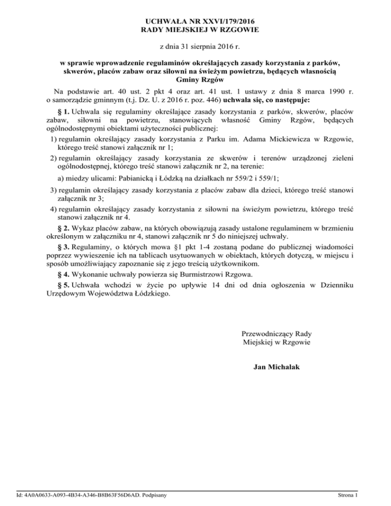 UCHWAŁA NR XXVI/179/2016 RADY MIEJSKIEJ W RZGOWIE z dnia 31 sierpnia 2016 r. w sprawie wprowadzenie regulaminów określających zasady korzystania z parków, skwerów, placów zabaw oraz siłowni na świeżym powietrzu, będących własnością Gminy Rzgów Na podstawie art. 40 ust. 2 pkt 4 oraz art. 41 ust. 1 ustawy z dnia 8 marca 1990 r. o samorządzie gminnym (t.j. Dz. U. z 2016 r. poz. 446) uchwala się, co następuje: § 1. Uchwala się regulaminy określające zasady korzystania z parków, skwerów, placów zabaw, siłowni na powietrzu, stanowiących własność Gminy Rzgów, będących ogólnodostępnymi obiektami użyteczności publicznej: 1) regulamin określający zasady korzystania z Parku im. Adama Mickiewicza w Rzgowie, którego treść stanowi załącznik nr 1; 2) regulamin określający zasady korzystania ze skwerów i terenów urządzonej zieleni ogólnodostępnej, którego treść stanowi załącznik nr 2, na terenie: a) miedzy ulicami: Pabianicką i Łódzką na działkach nr 559/2 i 559/1; 3) regulamin określający zasady korzystania z placów zabaw dla dzieci, którego treść stanowi załącznik nr 3; 4) regulamin określający zasady korzystania z siłowni na świeżym powietrzu, którego treść stanowi załącznik nr 4. § 2. Wykaz placów zabaw, na których obowiązują zasady ustalone regulaminem w brzmieniu określonym w załączniku nr 4, stanowi załącznik nr 5 do niniejszej uchwały. § 3. Regulaminy, o których mowa §1 pkt 1-4 zostaną podane do publicznej wiadomości poprzez wywieszenie ich na tablicach usytuowanych w obiektach, których dotyczą, w miejscu i sposób umożliwiający zapoznanie się z jego treścią użytkownikom. § 4. Wykonanie uchwały powierza się Burmistrzowi Rzgowa. § 5. Uchwała wchodzi w życie po upływie 14 dni od dnia ogłoszenia w Dzienniku Urzędowym Województwa Łódzkiego. Przewodniczący Rady Miejskiej w Rzgowie Jan Michalak Id: 4A0A0633-A093-4B34-A346-B8B63F56D6AD. Podpisany Strona 1 Załącznik Nr 1 do uchwały Nr XXVI/179/2016 Rady Miejskiej w Rzgowie z dnia 31 sierpnia 2016 r. REGULAMIN KORZYSTANIA Z PARKU IM. ADAMA MICKIEWICZA W RZGOWIE § 1. 1. Teren parku stanowi własność Gminy Rzgów i administrowany jest przez Urząd Miejski w Rzgowie z siedzibą przy Placu 500-lecia 22 w Rzgowie, tel. 42 214-12-10. 2. Osoby przebywające na terenie parku zobowiązane są do poszanowania zieleni i wyposażania parkowego oraz zachowania porządku i czystości. § 2. W celu ochrony i trwałego zachowania funkcji oraz zapewnienia bezpieczeństwa użytkowników ustala się następujące zasady korzystania z parku: 1) osoby przebywające na terenie parku winny zachowywać się w sposób nie zakłócający odpoczynku i bezpieczeństwa innych użytkowników; 2) poruszanie się na deskorolkach, łyżworolkach oraz rowerem winno odbywać się w sposób nie utrudniający poruszania się pieszych, wyłącznie po alejkach utwardzonych; 3) używanie pojazdów silnikowych i motorowerów na terenie parku jest zabronione. Nie dotyczy do pojazdów policji, pojazdów używanych przez służby techniczne, ratunkowe, porządkowe oraz pojazdów posiadających zgodę administratora; 4) wprowadzanie psów i innych zwierząt na teren parku może odbywać się pod warunkiem, że będą trzymane na uwięzi, w sposób nie powodujący zagrożenia lub uciążliwości dla ludzi. Właściciele psów zobowiązani są do sprzątania odchodów pozostawionych przez zwierzęta i nie dopuszczenia do niszczenia przez nich roślinności; 5) używanie sprzętu nagłaśniającego, grillowanie, handel, organizacja imprez, umieszczanie tablic, napisów, ogłoszeń może odbywać się pod warunkiem uzyskania zezwolenia od administratora parku. § 3. Na terenie parku w szczególności zabrania się: 1) wprowadzania psów i innych zwierząt na place zabaw dla dzieci oraz do piaskownic; 2) przenoszenia obiektów i urządzeń parkowych (elementów wyposażenia placu zabaw, ławek, koszy, itp.) i używania ich niezgodnie z przeznaczeniem; 3) wszelkich gier hazardowych. § 4. Zaleca się zachowanie ostrożności na terenie parku podczas silnych wiatrów, opadów atmosferycznych oraz burz, a w szczególności nie przebywanie pod konarami oraz w sąsiedztwie starych drzew. § 5. W przypadku stwierdzenia aktów wandalizmu, naruszenia zasad bezpieczeństwa oraz zakłócenia porządku publicznego należy powiadomić służby porządkowe. Przewodniczący Rady Miejskiej w Rzgowie Jan Michalak Id: 4A0A0633-A093-4B34-A346-B8B63F56D6AD. Podpisany Strona 1 Id: 4A0A0633-A093-4B34-A346-B8B63F56D6AD. Podpisany Strona 1 Załącznik Nr 2 do uchwały Nr XXVI/179/2016 Rady Miejskiej w Rzgowie z dnia 31 sierpnia 2016 r. REGULAMIN KORZYSTANIA ZE SKWERÓW I TERENÓW URZĄDZONEJ ZIELENI OGÓLNODOSTĘPNEJ NA TERENIE GMINY RZGÓW § 1. 1. Teren skwerów stanowi własność Gminy Rzgów i administrowany jest przez Urząd Miejski w Rzgowie z siedzibą przy Placu 500-lecia 22 w Rzgowie, tel. 42 214-12-10. 2. Osoby przebywające na terenie skwerów i terenów urządzonej zieleni ogólnodostępnej zobowiązane są do poszanowania zieleni i wyposażania parkowego oraz zachowania porządku i czystości. § 2. W celu ochrony i trwałego zachowania funkcji oraz zapewnienia bezpieczeństwa użytkowników ustala się następujące zasady korzystania ze skwerów i terenów urządzonej zieleni ogólnodostępnej: 1) osoby przebywające na terenie skwerów i terenów urządzonej zieleni ogólnodostępnej winny zachowywać się w sposób nie zakłócający odpoczynku i bezpieczeństwa innych użytkowników; 2) poruszanie się na deskorolkach, łyżworolkach oraz rowerem winno odbywać się w sposób nie utrudniający poruszanie się pieszych; 3) używanie pojazdów silnikowych i motorowerów na terenie skweru jest zabronione. Nie dotyczy do pojazdów policji, pojazdów używanych przez służby techniczne, ratunkowe, porządkowe oraz pojazdów posiadających zgodę administratora; 4) wprowadzanie psów i innyc