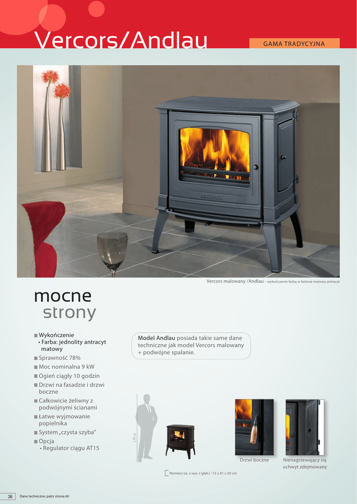 Vercors/Andlau GAMA TRADYCYJNA Vercors malowany /Andlau – wykończenie farbą w kolorze matowy antracyt mocne strony Model Andlau posiada takie same dane techniczne jak model Vercors malowany + podwójne spalanie. 1,75 m W ykończenie • Farba: jednolity antracyt matowy S prawność 78% M oc nominalna 9 kW O gień ciągły 10 godzin D rzwi na fasadzie i drzwi boczne C ałkowicie żeliwny z podwójnymi ścianami Ł atwe wyjmowanie popielnika S ystem „czysta szyba” O pcja • Regulator ciągu AT15 Drzwi boczne Wymiary (sz. x wys. x głęb.) : 72 x 81 x 50 cm 36 Dane techniczne: patrz strona 60 Nienagrzewający się uchwyt zdejmowany