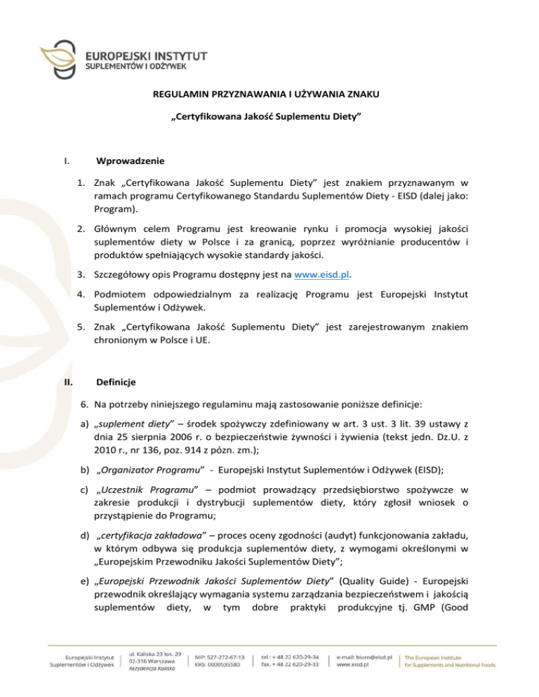 REGULAMIN PRZYZNAWANIA I UŻYWANIA ZNAKU „Certyfikowana Jakość Suplementu Diety” I. Wprowadzenie 1. Znak „Certyfikowana Jakość Suplementu Diety” jest znakiem przyznawanym w ramach programu Certyfikowanego Standardu Suplementów Diety - EISD (dalej jako: Program). 2. Głównym celem Programu jest kreowanie rynku i promocja wysokiej jakości suplementów diety w Polsce i za granicą, poprzez wyróżnianie producentów i produktów spełniających wysokie standardy jakości. 3. Szczegółowy opis Programu dostępny jest na www.eisd.pl. 4. Podmiotem odpowiedzialnym za realizację Programu jest Europejski Instytut Suplementów i Odżywek. 5. Znak „Certyfikowana Jakość Suplementu Diety” jest zarejestrowanym znakiem chronionym w Polsce i UE. II. Definicje 6. Na potrzeby niniejszego regulaminu mają zastosowanie poniższe definicje: a) „suplement diety” – środek spożywczy zdefiniowany w art. 3 ust. 3 lit. 39 ustawy z dnia 25 sierpnia 2006 r. o bezpieczeństwie żywności i żywienia (tekst jedn. Dz.U. z 2010 r., nr 136, poz. 914 z pózn. zm.); b) „Organizator Programu” - Europejski Instytut Suplementów i Odżywek (EISD); c) „Uczestnik Programu” – podmiot prowadzący przedsiębiorstwo spożywcze w zakresie produkcji i dystrybucji suplementów diety, który zgłosił wniosek o przystąpienie do Programu; d) „certyfikacja zakładowa” – proces oceny zgodności (audyt) funkcjonowania zakładu, w którym odbywa się produkcja suplementów diety, z wymogami określonymi w „Europejskim Przewodniku Jakości Suplementów Diety”; e) „Europejski Przewodnik Jakości Suplementów Diety” (Quality Guide) - Europejski przewodnik określający wymagania systemu zarządzania bezpieczeństwem i jakością suplementów diety, w tym dobre praktyki produkcyjne tj. GMP (Good Manufacturing Practices) dla suplementów diety, stworzony przez EHPM (European Federation of Associations of Health Product Manufacturers); f) „certyfikacja produktowa” - proces oceny zgodności (audyt) suplementu diety z wymogami prawnymi regulującymi warunki wprowadzania suplementów diety na rynek oraz wymogami jakościowymi odpowiednimi dla danego rodzaju suplementu diety; g) „akredytowane podmioty doradcze” – akredytowani przez Organizatora Standardu wyspecjalizowani doradcy wdrażający zasady systemu certyfikacji zakładowej i produktowej; zawodowo wykwalifikowani w zakresie przeprowadzania wdrażania systemów zarządzania jakością oraz oceny produktowej pod względem spełniania wymogów jakościowych i kwalifikacji prawnej środków spożywczych i innych wymogów prawa żywnościowego, w szczególności oznakowania, prezentacji i reklamy wykazującej związek produktu ze zdrowiem. Do podmiotów akredytowanych należy m.in. Rada Ekspercka Krajowej Rady Suplementów i Odżywek; h) „Wiodący Audytor Systemu Jakości” - akredytowany podmiot wyznaczony do przeprowadzenia audytu zakładowego; i) „Wiodący Audytor Produktowy” - akredytowany podmiot wyznaczony do przeprowadzenia audytu produktowego; j) „Kapituła Standardu” – organ Programu potwierdzający spełnienie wymagań Standardu Suplementów Diety w zakresie warunków produkcji i dystrybucji oraz oceny produktowej, przyznający certyfikat „Certyfikowana Jakość Produkcji Suplementu Diety” oraz prawo do stosowania znaku „Certyfikowana Jakość Suplementu Diety” w odniesieniu do certyfikowanego suplementu diety; k) „Branżowy Kodeks Etyczny“ - kodeks etyczny opracowany przez członków Krajowej Rady Suplementów i Odżywek (dalej także jako KRSIO) będący wzorem zachowań etycznych dla wszystkich uczestników rynku suplementów diety. III. Warunki udzielania prawa do stosowanie znaku „Certyfikowana Jakość Suplementu Diety” 7. Prawo do stosowania znaku „Certyfikowana Jakość Suplementu Diety” przydzielane jest w odniesieniu do produktu/produktów (suplementu/ów diety), a nie podmiotu (producenta suplementu/ów diety). 8. Warunkiem otrzymania znaku jest łączne spełnienie poniższych wymogów: a) notyfikacja do Głównego Inspektora Sanitarnego w trybie art. 29 i nast. ustawy z dnia 25 sierpnia 2006 r. o bezpieczeństwie żywności i żywienia; b) otrzymanie rekomendacji KRSIO; warunkiem uzyskania rekomendacji jest złożenie oświadczenia w zakresie akceptacji i zobowiązania do przestrzegania zasad określonych w Branżowym Kodeksie Etycznym (formularz oświadczenia stanowi Załącznik nr 1 do niniejszego regulaminu); c) pozytywne zakończenie procesu certyfikacji zakładowej, potwierdzone uzyskaniem certyfikatu „Certyfikowana Jakość Produkcji Suplementu Diety”; d) pozytywne zakończenie procesu certyfikacji produktowej. IV. Tryb udzielania prawa do stosowania znaku „Certyfikowana Jakość Produkcji Suplementu Diety” A. Faza zgłoszeniowa 9. Podmioty zainteresowane uzyskaniem prawa do stosowania znaku „Certyfikowana Jakość Suplementu Diety” w odniesieniu do wytwarzanych suplementu/ów diety lub uzyskaniem samego certyfikatu „Certyfikowana Jakość Produkcji Suplementu Diety” składają do Organizatora Programu formularz zgłoszeniowy. Wzór formularza zawiera Załącznik nr 2 do niniejszego regulaminu. Formularz należy przesłać na adres: zgł[email protected] lub doręczyć na adres siedziby Organizatora Standardu. 10. W terminie 7 dni roboczych od momentu odebrania zgłoszenia przez Organizatora Programu, podmiot zainteresowany otrzymuje ofertę certyfikacji zakładowej i/lub certyfikacji produktowej. 11. Po zaakceptowaniu oferty, podmiot zainteresowany otrzymuje od Organizatora Programu potwierdzenie zgłoszenia na certyfikację. 12. Podstawą rozpoczęcia procedur certyfikacyjnych jest zawarcie umowy o przystąpieniu do Programu. Umowa zawarta jest pomiędzy podmiotem zainteresowanym a Organizatorem Programu. Umowa określa warunki i okres przeprowadzenia certyfikacji zakładowej i produktowej, w tym ich koszty. Po podpisaniu umowy podmiot zainteresowany staj