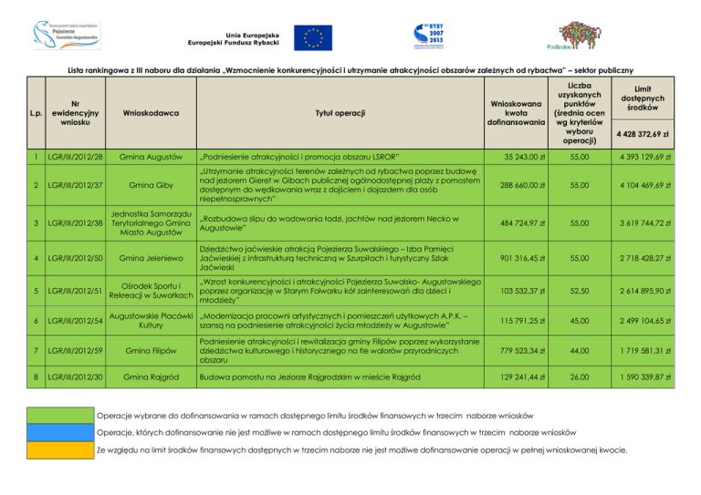 Unia Europejska Europejski Fundusz Rybacki Lista rankingowa z III naboru dla działania „Wzmocnienie konkurencyjności i utrzymanie atrakcyjności obszarów zależnych od rybactwa” – sektor publiczny L.p. 1 Nr ewidencyjny wniosku LGR/III/2012/28 Wnioskodawca Gmina Augustów Tytuł operacji „Podniesienie atrakcyjności i promocja obszaru LSROR” Wnioskowana kwota dofinansowania Liczba uzyskanych punktów (średnia ocen wg kryteriów wyboru operacji) Limit dostępnych środków 4 428 372,69 zł 35 243,00 zł 55,00 4 393 129,69 zł „Utrzymanie atrakcyjności terenów zależnych od rybactwa poprzez budowę nad jeziorem Gieret w Gibach publicznej ogólnodostępnej plaży z pomostem dostępnym do wędkowania wraz z dojściem i dojazdem dla osób niepełnosprawnych” 288 660,00 zł 55,00 4 104 469,69 zł „Rozbudowa slipu do wodowania łodzi, jachtów nad jeziorem Necko w Augustowie” 484 724,97 zł 55,00 3 619 744,72 zł Dziedzictwo jaćwieskie atrakcją Pojezierza Suwalskiego – Izba Pamięci Jaćwieskiej z infrastrukturą techniczną w Szurpiłach i turystyczny Szlak Jaćwieski 901 316,45 zł 55,00 2 718 428,27 zł 2 LGR/III/2012/37 Gmina Giby 3 LGR/III/2012/38 Jednostka Samorządu Terytorialnego Gmina Miasto Augustów 4 LGR/III/2012/50 Gmina Jeleniewo 5 LGR/III/2012/51 „Wzrost konkurencyjności i atrakcyjności Pojezierza Suwalsko- Augustowskiego Ośrodek Sportu i poprzez organizację w Starym Folwarku kół zainteresowań dla dzieci i Rekreacji w Suwałkach młodzieży” 103 532,37 zł 52,50 2 614 895,90 zł 6 LGR/III/2012/54 Augustowskie Placówki „Modernizacja pracowni artystycznych i pomieszczeń użytkowych A.P.K. – Kultury szansą na podniesienie atrakcyjności życia młodzieży w Augustowie” 115 791,25 zł 45,00 2 499 104,65 zł 7 LGR/III/2012/59 Gmina Filipów Podniesienie atrakcyjności i rewitalizacja gminy Filipów poprzez wykorzystanie dziedzictwa kulturowego i historycznego na tle walorów przyrodniczych obszaru 779 523,34 zł 44,00 1 719 581,31 zł 8 LGR/III/2012/30 Gmina Rajgród Budowa pomostu na Jeziorze Rajgrodzkim w mieście Rajgród 129 241,44 zł 26,00 1 590 339,87 zł Operacje wybrane do dofinansowania w ramach dostępnego limitu środków finansowych w trzecim naborze wniosków Operacje, których dofinansowanie nie jest możliwe w ramach dostępnego limitu środków finansowych w trzecim naborze wniosków Ze względu na limit środków finansowych dostępnych w trzecim naborze nie jest możliwe dofinansowanie operacji w pełnej wnioskowanej kwocie. Unia Europejska Europejski Fundusz Rybacki Lista rankingowa z III naboru dla działania „Wzmocnienie konkurencyjności i utrzymanie atrakcyjności obszarów zależnych od rybactwa” – sektor społeczno-gospodarczy L.p. Nr ewidencyjny wniosku Wnioskodawca 1 LGR/III/2012/07 Wojciech Dyczewski 2 LGR/III/2012/27 3 Tytuł operacji Wnioskowana kwota dofinansowania Liczba uzyskanych punktów (średnia ocen wg kryteriów wyboru operacji) Limit dostępnych środków 1 180 098,17 zł Eko-przystań Biała Perła 499 622,42 zł 55,00 680 475,75 zł Augustowski Klub Golfa „Augustowska Akademia Golfa” 165 293,00 zł 55,00 515 182,75 zł LGR/III/2012/06 Stowarzyszenie „Sięgać za horyzont” „Pracownia przygód” 452 058,05 zł 55,00 63 124,70 zł 4 LGR/III/2012/47 Stowarzyszenie Północno –Wschodnia Lokalna Grupa Działania „Szelment” Promocja turystyczna obszaru Północno- Wschodniej Suwalszczyzny 39 730,56 zł 55,00 23 394,14 zł 5 LGR/III/2012/41 Piotr Malczewski Czarna Hańcza. Rzeka Bobrów i Ludzi 476 828,80 zł 55,00 -453 434,66 zł 6 LGR/III/2012/43 Forum Rozwoju Regionalnego Polska Wschodnia Wirtualny spacer po Pojezierzu Suwalsko- Augustowskim 248 199,15 zł 55,00 -701 633,81 zł Kampania promocyjna Pojezierza Suwalsko- Augustowskiego w oparciu o zasoby przyrodnicze, potencjał turystyczny i bogatą tradycję 296 350,00 zł 55,00 -997 983,81 zł Wzmocnienie konkurencyjności i utrzymania atrakcyjności gminy Filipów jako obszaru zależnego od rybactwa poprzez rozwój turystyki sakralnejremont zabytkowego kościoła w Filipowie 603 308,24 zł 52,00 -1 601 292,05 zł 83 577,44 zł 45,66 -1 684 869,49 zł 270 367,97 zł 44,00 -1 955 237,46 zł Hubert Stojanowski/ STURNUS- pracownia fotograficzna i multimedialna Parafia Rzymskokatolicka p.w. Wniebowzięcia Najświętszej Maryi Panny 7 LGR/III/2012/62 8 LGR/III/2012/58 9 LGR/III/2012/40 Ochotnicza Staż Pożarna Augustów – Lipowiec 10 LGR/III/2012/17 Dorota Bykowska „Ekologicznie żyj, rozsądnie się baw, nieś pomoc innym- kształtowanie obywatelskich postaw wśród dzieci i młodzieży z terenu gminy Augustów” „Podniesienie atrakcyjności gminy Sejny jako obszaru zależnego od rybactwa poprzez budowę obiektu wystawienniczego i wędkarskiego w miejscowości Burbiszki” Unia Europejska Europejski Fundusz Rybacki 11 LGR/III/2012/19 Szymon Skowina 12 LGR/III/2012/48 Jerzy Marcin Jaśkiewicz Budowa punktu wędkarskiego 123 576,57 zł 40,00 -2 078 814,03 zł Remont budynku centrum edukacji wędkarskiej w Becejłach 201 527,00 zł 40,00 -2 280 341,03 zł Operacje wybrane do dofinansowania w ramach dostępnego limitu środków finansowych w trzecim naborze wniosków Operacje, których dofinansowanie nie jest możliwe w ramach dostępnego limitu środków finansowych w trzecim naborze wniosków Ze względu na limit środków finansowych dostępnych w trzecim naborze nie jest możliwe dofinansowanie operacji w pełnej wnioskowanej kwocie. Unia Europejska Europejski Fundusz Rybacki Lista rankingowa z III naboru dla działania „Restrukturyzacja lub reorientacja działalności gospodarczej lub dywersyfikacja zatrudnienia osób mających pracę związaną z sektorem rybactwa, w drodze tworzenia dodatkowych miejsc pracy poza tym sektorem” – sektor społeczno-gospodarczy l.p. Nr ewidencyjny wniosku Wnioskodawca 1 LGR/III/2012/14 Hubert Falkowski 2 LGR/III/2012/32 Agnieszka Mackiewicz 3 LGR/III/2012/13 Hubert Falkowski Tytuł oper