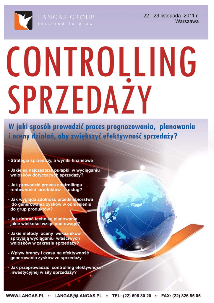 Agenda W jaki sposób prowadzić proces prognozowania, planowania i oceny działań, aby zwiększyć efektywność sprzedaży? 22 listopada 2011 r. 09.30 – 10.00 rejestracja 10.00 – 11.30 SESJA PIERWSZA 11.30 – 11.45 przerwa na kawę, herbatę 11.45 – 13.30 SESJA DRUGA 13.30 – 14.15 obiad 14.15 – 17.00 SESJA TRZECIA CONTROLLING SPRZEDAZY 23 listopada 2011 r. 08.30 – 09.00 rejestracja 09.00 – 10.30 SESJA PIERWSZA 10.30 – 10.45 przerwa na kawę, herbatę 10.45 – 13.00 SESJA DRUGA 13.00 – 13.45 obiad 13.45 – 16.00 SESJA TRZECIA Eksperci: „…Z badań Instytutu Gallupa wynika, iż przygotowanie procesu sprzedaży na podstawie wiarygodnych informacji stanowi w 60% o sukcesie i wysokości sprzedaży…” Dane te dostępne są w każdej organizacji, jednak aby były przydatne i efektywnie wykorzystane niezbędne są umiejętności właściwego prognozowania, planowania, oceny, a przede wszystkim poddania analizie właściwych informacji i wyciągania prawidłowych wniosków. Kluczowe zagadnienia: − Strategia sprzedaży, a wyniki finansowe − Jakie są najczęstsze pułapki w wyciąganiu wniosków dotyczących sprzedaży? − Analiza potencjału segmentów − Analiza udział w rynku, a plany sprzedaży − Jak prowadzić proces controllingu rentowności produktów i usług? − Jak wygląda zdolność przedsiębiorstwa do generowania zysków w odniesieniu do grup produktów? − Jak dobrać technikę planowania sprzedaży, jakie wielkości wziąć pod uwagę? − Jakie metody oceny wskaźników sprzyjają wyciąganiu właściwych wniosków w zakresie sprzedaży? − Dynamika zmian kosztów sprzedaży − Jak wygląda zdolność przedsiębiorstwa do generowania zysków? − Wpływ branży i czasu na efektywność generowania zysków ze sprzedaży − Inwestycje w sprzedaż - jak przeprowadzić controlling efektywności inwestycyjnej w siły sprzedaży − Orientacja na cele sprzedażowe − Czynniki zwiększające sprzedaż − Wyniki – warunki efektywności sprzedaży Szkolenie skierowane do: − − Menedżerów, specjalistów ds. sprzedaży, pracowników działu controllingu, działu finansowego Osób odpowiedzialnych za poprawę wyników sprzedaży Pamiętaj, że inwestując swój czas i pieniądze w szkolenia organizowane przez Langas Group, możesz zawsze spodziewać się zwrotu z inwestycji! Stawiamy na Twoje maksymalne zadowolenie! Magdalena Kaczmarczyk Kierownik Projektu [email protected] Aleksandra Tarasek - Trener i doradca w dziedzinie finansów. Prowadzi bardzo wysoko oceniane warsztaty dotyczące zagadnień finansowych. Zastępca Dyrektora Zarządzającego w Grupie Finansowej Premium S.A. Pracownik Katedry Finansów Akademii Ekonomicznej w Katowicach. Wieloletni analityk finansowy. Autorka wielu publikacji naukowych z zakresu bankowości i usług finansowych. Specjalizuje się w tematyce budowania grup kapitałowych i kształtowania relacji między instytucjami sektora finansowego na przykładzie bancassurance, zajmuje się kompleksową analizą kondycji finansowej pożyczkobiorców Cyprian Jędrkowiak - Ekspert w zakresie sprzedaży, inspirator. Przeszedł wszystkie szczeble kariery w dziel sprzedaży. Kierował także zespołem marketingu, co wzmocniło zainteresowanie zachowaniami ludzi i szacowaniem skuteczności komunikacji, jak również wzbogaciło spojrzeniem na marketing i zarządzanie w ujęciu psychologicznym. Od niepamiętnych czasów jest zaintrygowany strategią osoby dokonującej zakupu, jej motywacją, wpływem reklamy, a także wszelkimi czynnikami (werbalnymi i niewerbalnymi) mającymi wpływ na ostateczną decyzję. Ogromną wagę przykłada do oddziaływania „słowa" w relacjach międzyludzkich, o które dba z wysoką starannością, zwracając swoją uwagę ku potrzebom klientów i pracowników, a także prywatnie. Uwielbia pracować „być" z ludźmi, na każdym kroku podkreśla ich niezwykłość, indywidualność, różnorodność. W pracy trenera dzieli się wiedzą, umiejętnościami, a także doświadczeniem, gdyż to, co przekazuje najpierw sprawdza w praktyce poprzez ciągłe doświadczanie praca związana z bezpośrednią obsługą klienta, kontrolą należności, sprzedażą indywidualną i biznesową. Langas Group ul. Krakowskie Przedmieście 79, 00-079 Warszawa www.langas.pl | [email protected] Tel: (22) 696 80 20 | Fax: (22) 826 85 05 W jaki sposób prowadzić proces prognozowania, planowania i oceny działań, aby zwiększyć efektywność sprzedaży? CONTROLLING SPRZEDAZY CONTROLLING W SPRZEDAŻY, A DANE FINANSOWE FIRMY − Strategia sprzedaży, a wyniki finansowe − Jakie są najczęstsze pułapki w wyciąganiu wniosków dotyczących sprzedaży? − Profesjonalne podejście do analizy danych finansowych w procesie controllingu sprzedaży? Opinie uczestników szkoleń prowadzonych przez naszych ekspertów: WSTĘPNA ANALIZA SPRZEDAŻY – PODSTAWOWE DANE DO URUCHOMIENIA PROCESU CONTROLLINGU − Jakie wnioski można wyciągnąć analizując wartość i dynamikę sprzedaży w stosunku do potencjału rynkowego? − Analiza udział w rynku, a plany sprzedaży − Plany sprzedaży, a wyniki - analiza przyczyn odchyleń − Sprzężenie wyprzedzające – jako narzędzie minimalizacji ryzyka „Wybór ekspertów – rewelacyjny, kompetencje, umiejętność przekazania wiedzy w stopniu więcej niż bardzo dobrym” opinia anonimowa JAK PROWADZIĆ PROCES CONTROLLINGU RENTOWNOŚCI PRODUKTÓW I USŁUG? − Rentowności produktów – jak wyciągać prawidłowe wnioski? − Błędy w ocenie rentowności − Jak wyznaczyć marginesy bezpieczeństwa w sprzedaży − Jak prowadzić analizę wrażliwości zysku produktu/usługi? − Jak wygląda zdolność przedsiębiorstwa do generowania zysków w odniesieniu do grup produktów? − Jaki jest wpływ branży i czasu na efektywność generowania zysków w odniesieniu do grup produktów/usług? − Pokrycie finansowe, a koszty sprzedaży − „dolna granica ceny” PLANOWANIE F