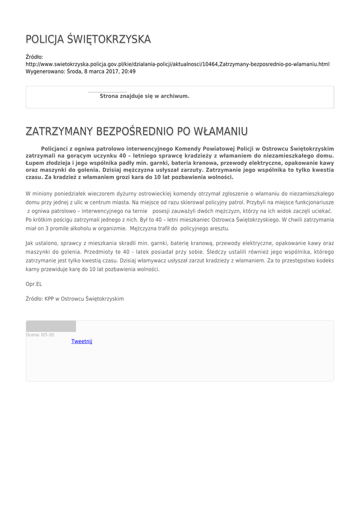 POLICJA ŚWIĘTOKRZYSKA Źródło: http://www.swietokrzyska.policja.gov.pl/kie/dzialania-policji/aktualnosci/10464,Zatrzymany-bezposrednio-po-wlamaniu.html Wygenerowano: Środa, 8 marca 2017, 20:49 Strona znajduje się w archiwum. ZATRZYMANY BEZPOŚREDNIO PO WŁAMANIU Policjanci z ogniwa patrolowo interwencyjnego Komendy Powiatowej Policji w Ostrowcu Świętokrzyskim zatrzymali na gorącym uczynku 40 – letniego sprawcę kradzieży z włamaniem do niezamieszkałego domu. Łupem złodzieja i jego wspólnika padły min. garnki, bateria kranowa, przewody elektryczne, opakowanie kawy oraz maszynki do golenia. Dzisiaj mężczyzna usłyszał zarzuty. Zatrzymanie jego wspólnika to tylko kwestia czasu. Za kradzież z włamaniem grozi kara do 10 lat pozbawienia wolności. W miniony poniedziałek wieczorem dyżurny ostrowieckiej komendy otrzymał zgłoszenie o włamaniu do niezamieszkałego domu przy jednej z ulic w centrum miasta. Na miejsce od razu skierował policyjny patrol. Przybyli na miejsce funkcjonariusze z ogniwa patrolowo – interwencyjnego na ternie posesji zauważyli dwóch mężczyzn, którzy na ich widok zaczęli uciekać. Po krótkim pościgu zatrzymali jednego z nich. Był to 40 – letni mieszkaniec Ostrowca Świętokrzyskiego. W chwili zatrzymania miał on 3 promile alkoholu w organizmie. Mężczyzna trafił do policyjnego aresztu. Jak ustalono, sprawcy z mieszkania skradli min. garnki, baterię kranową, przewody elektryczne, opakowanie kawy oraz maszynki do golenia. Przedmioty te 40 - latek posiadał przy sobie. Śledczy ustalili również jego wspólnika, którego zatrzymanie jest tylko kwestią czasu. Dzisiaj włamywacz usłyszał zarzut kradzieży z włamaniem. Za to przestępstwo kodeks karny przewiduje karę do 10 lat pozbawienia wolności. Opr.EL Źródło: KPP w Ostrowcu Świętokrzyskim Ocena: 0/5 (0) Tweetnij