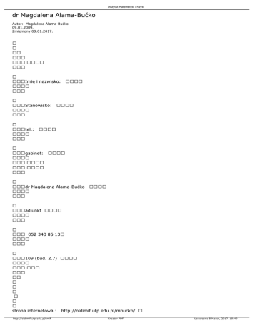 Instytut Matematyki i Fizyki dr Magdalena Alama-Bućko Autor: Magdalena Alama-Bućko 09.01.2009. Zmieniony 09.01.2017. Imię i nazwisko: Stanowisko: tel.: gabinet: dr Magdalena Alama-Bućko adiunkt 052 340 86 13 109 (bud. 2.7) strona internetowa : http://oldimif.utp.edu.pl/mbucko/ http://oldimif.utp.edu.pl/imif Kreator PDF Utworzono 8 March, 2017, 19:49 Instytut Matematyki i Fizyki Konsultacje w semestrze zimowym 2016/2017 poniedziałek 7:15- 7:45 aula 1B środa 9:15-10:15, sala 219 , wydział zarządzania Informatyka Stosowana 2016/2017 Wykład 1 Wykład 2 http://oldimif.utp.edu.pl/imif Kreator PDF Utworzono 8 March, 2017, 19:49 Instytut Matematyki i Fizyki Wykład 3 Wykład 4 Wykład 5 Wykład 6 Wykład 7 Wykład 8 Wykład 9 Wykład 10 Wykład 11 i 12 Asymptoty http://oldimif.utp.edu.pl/imif Kreator PDF Utworzono 8 March, 2017, 19:49 Instytut Matematyki i Fizyki Listy zadań 2016/2017 (dla kierunków : Zarządzanie, Zip i Fir) Lista 1 : Dziedzina funkcji. Równania logarytmiczne i wykładnicze. Funkcja odwrotna. Lista 2 : Złożenie funkcji. Granice funkcji. Monotoniczność ciągu. Lista 3 : Parzystość/Nieparzystość funkcji. Ciągłość funkcji. Asymptoty http://oldimif.utp.edu.pl/imif Kreator PDF Utworzono 8 March, 2017, 19:49