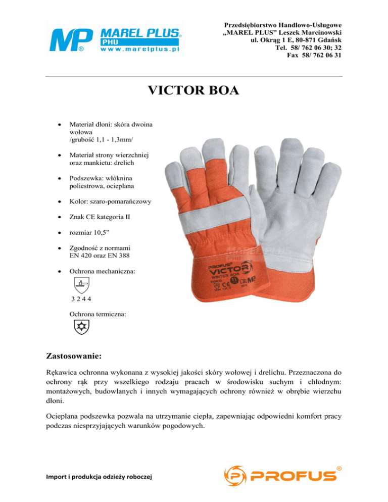Przedsiębiorstwo Handlowo-Usługowe „MAREL PLUS” Leszek Marcinowski ul. Okrąg 1 E, 80-871 Gdańsk Tel. 58/ 762 06 30; 32 Fax 58/ 762 06 31 VICTOR BOA Materiał dłoni: skóra dwoina wołowa /grubość 1,1 - 1,3mm/ Materiał strony wierzchniej oraz mankietu: drelich Podszewka: włóknina poliestrowa, ocieplana Kolor: szaro-pomarańczowy Znak CE kategoria II rozmiar 10,5” Zgodność z normami EN 420 oraz EN 388 Ochrona mechaniczna: 3244 Ochrona termiczna: Zastosowanie: Rękawica ochronna wykonana z wysokiej jakości skóry wołowej i drelichu. Przeznaczona do ochrony rąk przy wszelkiego rodzaju pracach w środowisku suchym i chłodnym: montażowych, budowlanych i innych wymagających ochrony również w obrębie wierzchu dłoni. Ocieplana podszewka pozwala na utrzymanie ciepła, zapewniając odpowiedni komfort pracy podczas niesprzyjających warunków pogodowych. Import i produkcja odzieży roboczej