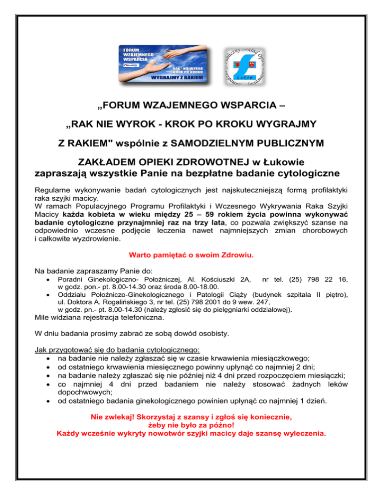 „FORUM WZAJEMNEGO WSPARCIA – „RAK NIE WYROK - KROK PO KROKU WYGRAJMY Z RAKIEM" wspólnie z SAMODZIELNYM PUBLICZNYM ZAKŁADEM OPIEKI ZDROWOTNEJ w Łukowie zapraszają wszystkie Panie na bezpłatne badanie cytologiczne Regularne wykonywanie badań cytologicznych jest najskuteczniejszą formą profilaktyki raka szyjki macicy. W ramach Populacyjnego Programu Profilaktyki i Wczesnego Wykrywania Raka Szyjki Macicy każda kobieta w wieku między 25 – 59 rokiem życia powinna wykonywać badanie cytologiczne przynajmniej raz na trzy lata, co pozwala zwiększyć szanse na odpowiednio wczesne podjęcie leczenia nawet najmniejszych zmian chorobowych i całkowite wyzdrowienie. Warto pamiętać o swoim Zdrowiu. Na badanie zapraszamy Panie do: Poradni Ginekologiczno- Położniczej, Al. Kościuszki 2A, nr tel. (25) 798 22 16, w godz. pon.- pt. 8.00-14.30 oraz środa 8.00-18.00. Oddziału Położniczo-Ginekologicznego i Patologii Ciąży (budynek szpitala II piętro), ul. Doktora A. Rogalińskiego 3, nr tel. (25) 798 2001 do 9 wew. 247, w godz. pn.- pt. 8.00-14.30 (należy zgłosić się do pielęgniarki oddziałowej). Mile widziana rejestracja telefoniczna. W dniu badania prosimy zabrać ze sobą dowód osobisty. Jak przygotować się do badania cytologicznego: na badanie nie należy zgłaszać się w czasie krwawienia miesiączkowego; od ostatniego krwawienia miesięcznego powinny upłynąć co najmniej 2 dni; na badanie należy zgłaszać się nie później niż 4 dni przed rozpoczęciem miesiączki; co najmniej 4 dni przed badaniem nie należy stosować żadnych leków dopochwowych; od ostatniego badania ginekologicznego powinien upłynąć co najmniej 1 dzień. Nie zwlekaj! Skorzystaj z szansy i zgłoś się koniecznie, żeby nie było za późno! Każdy wcześnie wykryty nowotwór szyjki macicy daje szansę wyleczenia.