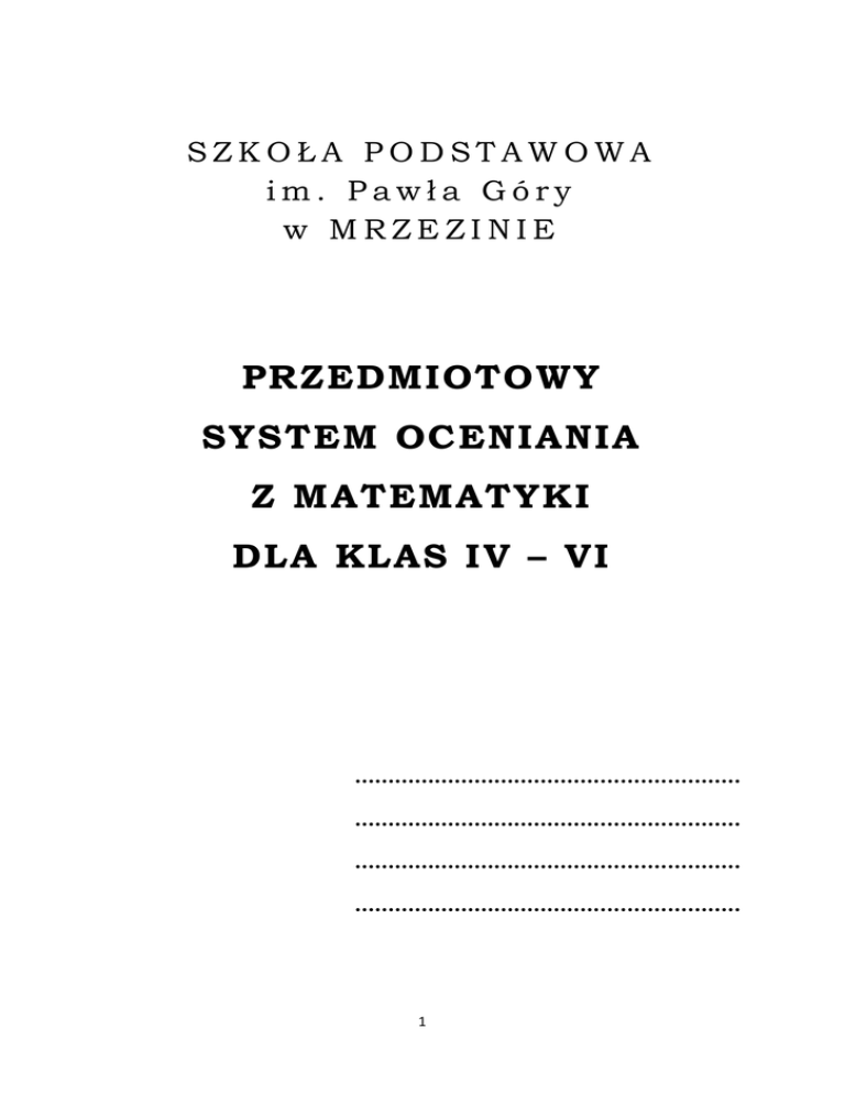 SZKOŁA PODSTAWOWA im. Pawła Góry w MRZEZINIE PRZEDMIOTOWY SYSTEM OCENIANIA Z MATEMATYKI DLA KLAS IV – VI ………………………………...............……. ………………………………...............……. ………………………………...............……. ………………………………...............……. 1 I. GŁÓWNE ZAŁOŻENIA PSO: 1. Ocenianie w matematyce powinno wskazywać, jakie wiadomości i umiejętności są najważniejsze dla uczniów w procesie uczenia się i nauczania i być na to nakierowane (uczniowie wiedzą, czego będą sie uczyć 2. Zadania stosowane w procesie oceniania powinny nakłaniać uczniów do stosowania zdobytej wiedzy w różnych aspektach; a uczeń poprzez uświadomienie sobie co umie, a czego jeszcze nie , powinien stać się czynnym uczestnikiem procesu oceniania. 3. Przy ocenianiu osiągnięć ucznia powinno sie stworzyć okazje do zaprezentowania przez niego swojej wiedzy i umiejętności w różny sposób. 4. Jasne i precyzyjne określenie zasad oceniania poszczególnych form aktywności oraz ustalania oceny semestralnej i rocznej (uczniowie wiedza co i kiedy będzie podlegać ocenie, jakie są zasady oceniania oraz znają kryteria ocen). 5. Informacje zdobyte w procesie oceniania powinny umożliwiać jak największą pewność wnioskowania o wiedzy i umiejętnościach ucznia. II. OBSZARY AKTYWNOŚCI PODLEGAJĄCE OCENIE: Na lekcjach matematyki oceniane są następujące obszary aktywności ucznia: 1. Rozumienie pojęć matematycznych i znajomości ich definicji. 2. Znajomość i stosowanie poznanych twierdzeń. 3. Samodzielne lub w grupie przeprowadzanie rozumowań i wnioskowań. 4. Rozwiązywanie zadań z wykorzystaniem poznanych metod. 5. Posługiwanie się symboliką i językiem matematyki. 6. Matematyczny sposób analizowania tekstów. 7. Logiczne rozumowanie, kojarzenie faktów, myślenie abstrakcyjne i stosowanie 8. poznanej wiedzy w rozwiązywaniu zadań problemowych. 9. Aktywność na lekcjach, praca w grupach i wkład pracy ucznia. 10. Prowadzenie zeszytu. III. SPRAWDZANIE I OCENIANIE OSIĄGNIEĆ UCZNIÓW 1. Formy aktywności: prace klasowe (testy), sprawdziany, kartkówki, odpowiedzi ustne, praca samodzielna na lekcji, prace domowe, zeszyt przedmiotowy, aktywność na lekcji , praca w grupie, przygotowanie do lekcji, udział w konkursach matematycznych, 2 2. Formy aktywności - częstotliwość w semestrze: Prace klasowe (ewentualnie testy) – minimum dwie Sprawdziany Kartkówki Aktywność i praca na lekcji oraz przygotowanie do lekcji na bieżąco Prace domowe Zeszyt przedmiotowy Określenie pojęć zgodne z WSO: wypowiedzi pisemne: praca klasowa – z określonego materiału poprzedzona powtórzeniem, zapisana i zapowiedziana z tygodniowym wyprzedzeniem, test – praca pisemna zawierająca zadania zamknięte lub zadania zamknięte i otwarte, przeprowadzona w zamian za pracę klasową i na takich samych zasadach, sprawdzian – obejmuje materiał 3 – 5 jednostek lekcyjnych ( zapowiedziany na ostatniej lekcji), kartkówka – niezapowiedziana praca obejmująca materiał z 1 – 3 ostatnich jednostek lekcyjnych, prace domowe ucznia – podlegają sprawdzeniu, ale nie zawsze ocenie, zeszyt przedmiotowy – minimum raz w semestrze, ale nie zawsze podlega ocenie, wypowiedzi ustne: odpowiedzi z ostatnich 3 lekcji, aktywność na lekcji. 3. Skala ocen: a. Oceny bieżące, oceny klasyfikacyjne półroczne i oceny roczne ustala się w stopniach według następującej skali: ocena celująca – 6 ocena bardzo dobra – 5 ocena dobra – 4 ocena dostateczna – 3 ocena dopuszczająca – 2 ocena niedostateczna – 1 Wystawiając oceny klasyfikacyjne półroczne dopuszcza się stosowanie przy powyższych ocenach znaków „- ‘’ i „+” b. Stosuje sie określoną wagę ocen dla poszczególnych form aktywności ucznia oraz sposób zapisu w dzienniku. praca klasowa – 3x – kolor czerwony sprawdzian – 2x – kolor czerwony kartkówka – 1x praca samodzielna na lekcji – 2x odpowiedzi ustne – 1x praca domowa – 1x aktywność na lekcji i zajęciach pozalekcyjnych – 1x zeszyt przedmiotowy – 1x Ocenę klasyfikacyjną półroczną i roczną wystawia sie z uwzględnieniem wyżej wymienionej wagi. Ocena klasyfikacyjna półroczna i roczna nie jest średnią ocen bieżących. 3 W przypadku wystawiania ocen półrocznych i rocznych ocenę celująca otrzymuje uczeń, który jest laureatem konkursów lub olimpiad matematycznych lub systematycznie rozwiązuje zadania dodatkowe z poziomu „W” w trakcie prac klasowych ( przy rozwiązaniu wszystkich pozostałych zadań z niższych poziomów) oraz zadania dodatkowe z poziomu „W” w trakcie lekcji i z zadań domowych „dla chętnych” w czasie półrocza. IV. KRYTERIA OCEN BIEŻĄCYCH ( WYMAGANIA NA POSZCZEGÓLNĄ OCENĘ): celujący: otrzymuje uczeń, który swoją wiedzą wyraźnie wykracza poza obowiązujące wymagania programowe - rozwiązuje zadania z poziomu W oraz wszystkie zadania z pozostałych poziomów, bardzo dobry: otrzymuje uczeń, który opanował wiadomości z poziomów K, P, R i co najmniej 50% wiadomości z poziomu D, dobry: otrzymuje uczeń, który opanował wiadomości z poziomów K, P i co najmniej 50% wiadomości z poziomu R, dostateczny: otrzymuje uczeń, który opanował wiadomości z poziomu K i co najmniej 50% wiadomości z poziomu P, dopuszczający: otrzymuje uczeń, który opanował wiadomości z poziomu K, niedostateczny: otrzymuje uczeń, który nie opanował wiadomości i umiejętności określonych na poziomie K, a braki uniemożliwiają zdobywanie dalszej wiedzy. Nie potrafi rozwiązywać zadań o niewielkim stopniu trudności, nawet przy pomocy nauczyciela. Nie zna podstawowych określeń matematycznych. *** Wyjaśnienie określeń: K- poziom wymagań konieczny (odpowiada ocenie dopuszczającej), P - poziom wymagań podstawowy (odpowiada ocenie dostatecznej), R - poziom wymagań rozszerzający (odpowiada ocenie dobrej),