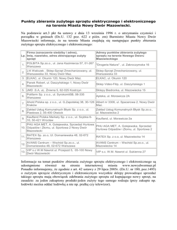 Punkty zbierania zuŜytego sprzętu elektrycznego i elektronicznego na terenie Miasta Nowy Dwór Mazowiecki. Na podstawie art.3 pkt 6a ustawy z dnia 13 września 1996 r. o utrzymaniu czystości i porządku w gminach (Dz.U. 132 poz. 622 z późn. zm) Burmistrz Miasta Nowy Dwór Mazowiecki informuje, Ŝe na terenie Miasta znajdują się następujące punkty zbierania zuŜytego sprzętu elektrycznego i elektronicznego: Firma (oznaczenie siedziby i adres), Lp. Imię, nazwisko, adres zbierającego zuŜyty sprzęt Adresy punktów zbierania zuŜytego sprzętu na terenie Nowego Dworu Mazowieckiego 1. POLBITA Sp.zo.o., ul. Jana Kazimierza 57, 01-267 "Drogeria Natura" , ul. Zakroczymska 16 Warszawa 2. J.K Waliczek , Sklep-Sprzęt Zmechanizowany, ul. Warszawska 33, Nowy Dwór Maz. 3. ELKAC, ul. Okunin 120, Nowy Dwór Maz. 4. Panek Robert, ul. Daszyńskiego 1, Nowy Dwór Mazowiecki 5. JMD .S.A, uL. śniwna 5, 62-025 Kostrzyn Sklep-Sprzęt Zmechanizowany, ul. Warszawska 33 ELKAC, ul. Okunin 120 Sklep Video-Filip, ul. Daszyńskiego 1 Sklepy Biedronka, ul. Mazowiecka 15 6. Polifarm Sp. z o.o., ul. Syrokomli5B, 08-335 Warszawa 7. Ahold Polska sp. z o.o., ul. G.Zapolskiej 38, 30-126 Albert nr 3306, ul. Spacerowa 2, Nowy Dwór Kraków Maz. 8. Zakład Usług Komunalnych Błysk Sp. z o.o., ul. Piastowa 2, 05-400 Otwock Zakład Usług Komunalnych Błysk Sp.zo.o., ul. Mazowiecka 2 9. Kaufland Polska Markety Sp. z o.o., ul. Szybka 610, 50-421 Wrocław Kaufland, ul. Morawicza 2a Apteka, ul. Morawicza 2A PHU AGA MET, A. Golejewska, SprzedaŜ Hurtowa PHU AGA MET, A. Golejewska, SprzedaŜ 10. Odpadów i Złomu, ul. Sportowa 2 Nowy Dwór Hurtowa Odpadów i Złomu, ul. Sportowa 2 Mazowiecki 11. RATEX Sp. zo.o, Ul. Domaniewska 48, 02-672 Warszawa RATEX Sp. z o.o, ul. Mazowiecka 14 12. AVANS Centrum – Wschód Sp.zo.o., ul. Domaniewska 48, 02-672 Warszawa AVANS Centrum – Wschód Sp.zo.o., ul. Mazowiecka 14 13. VIP s.c W.M Nawrot ul. Przejazd 5, 05-100 Nowy Dwór Mazowiecki VIP s.c. W.M. Nawrot ul. Sukienna 27 Informacje na temat punktów zbierania zuŜytego sprzętu elektrycznego i elektronicznego są udostępnione równieŜ na stronie internetowej miasta www.nowydwormaz.pl Ponadto informujemy, Ŝe zgodnie z art. 42 ustawy z 29 lipca 2005r. (Dz.U. nr 180, poz.1495) o zuŜytym sprzęcie elektrycznym i elektronicznym wszystkie sklepy prowadzące sprzedaŜ takiego sprzętu mają obowiązek odebrania zuŜytego sprzętu od kupującego nowy sprzęt, na zasadzie: za jeden zakupiony produkt-jeden zuŜyty tego samego rodzaju (przy zakupie np. lodówki moŜna oddać lodówkę a nie np. pralkę czy telewizor).