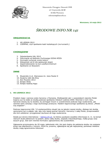 Mazowiecka Chorągiew Harcerek ZHR ul. Ursynowska 36/38 02-605 Warszawa [email protected] Warszawa, 16 maja 2012 ŚRODOWE INFO NR 141 ORGANIZACJA 1. HS LEDNIA 2012 2. CZERPAK, czyli spotkanie kadr kształcących (na kursach;) CHORĄGIEW 3. 4. 5. 6. 7. 8. Zatwierdzanie HAL 2012 Informacje od Referatu Zuchowego DZIKA RÓŻA Gromada zuchenek szuka kolonii Wskazówki od KI dla opiekunek stopni Zapotrzebowanie na kurs podharcmistrzyń Spotkanie ze Skautami INNE 9. 10. 11. 12. 13. Stypendia m.st. Warszawa im. Jana Pawła II Szyjemy lalki dla Elizy Noc Muzeów 2012 Święto Wisły Święto Saskiej Kępy 1. HS LEDNICA 2012 Przełom maja i czerwca wielu harcerzy z Poznania, Wielkopolski jak i z pozostałych rejonów Polski kojarzy już na stałe ze służbą podczas spotkania młodych Lednica 2000. Również w tym roku, harcerze stawią się na służbie, by pomagać innym w uczestnictwie podczas tego wydarzenia, jak również sami czerpiąc z tego duchowego przeżycia. Hasłem tegorocznego spotkania są słowa: „Miłość Cię znajdzie!”. Podczas tegorocznej HSL '12 postanowiliśmy skupić się na jakości naszej służby, dlatego też służbę zaczynamy już w piątek, tak, aby móc lepiej poznać harcerki i harcerzy z całej Polski, przeprowadzić dla nich szkolenia i przygotować duchowo do tego wydarzenia. Działa już strona internetowa – lednica.zhr.pl, na której uzyskacie wszelkie informacje m. in. na temat różnych służb pełnionych na polach, planu całej służby, dojazdu indywidualnego, małej grupy oraz dużych grup. Jest tam również formularz zgłoszeniowy dla uczestników. Zgłoszenia przyjmujemy do 20 maja, jakkolwiek nikt, kto jest chętny do pełnienia służby nie zostanie przez nas odprawiony z niczym. Mimo to, prosimy, zgłaszajcie się jak najszybciej, ponieważ niektóre służby mają ograniczenia ilościowe! 1 Mazowiecka Chorągiew Harcerek ZHR ul. Ursynowska 36/38 02-605 Warszawa [email protected] Do zobaczenia 1.06 na polach Lednickich! Czuwaj! w imieniu komendanta HSL '12 szef służby medialnej Antoni Ropelewski 2. CZERPAK, CZYLI SPOTKANIE KADR KSZTAŁCĄCYCH (NA KURSACH;) Droga druhno instruktorko! Serdecznie zapraszamy na organizowane w Warszawie spotkanie kadr kształcących CZERPAK w dniach 1-2.06.2012. Spotykamy się na niecałe 24 godziny aby zaczerpnąć z naszych doświadczeń nowe pomysły i rozwiązania, poznać nowe style pracy i instruktorki OH a także wziąć udział w profesjonalnym choć krótkim warsztacie o prowadzeniu zajęć prowadzonym przez trenerkę Monikę Fedorczuk. Wstępna rekrutacja pozwoliła nam poznać wasze potrzeby i na podstawie nich stworzyć taki plan działania: PIĄTEK 19-20 przyjazd i kolacja 20-21.30 zajęcia blok I (do wyboru: 1. Służba, harce, wyczyny na poziomie kursantek/ 2. obrzędowość kursowa "na poziomie") 22.00 wieczór gier planszowych dla chętnych SOBOTA 8.30- 14.30 warsztat o organizacji zajęć z Moniką Fedorczuk 14.30-15.30 obiad 15.30- 17.oo Zajęcia blok II (1.zadania międzykursowe, zadania zespołowo/ 2. praca z kadrą w trakcie kursu) 17.00-17.30- podsumowanie i sprzątanie, pożegnanie Jeśli jesteś chętna i chciałabyś spotkać się z nami w czerwcu to czekamy na twoje zgłoszenie! https://docs.google.com/spreadsheet/viewform?formkey=dHZwM2FwQU02SHJ1bk9TUzBvTTRoZVE6M Q Ankieta jest bardzo krótka!;) Na zgłoszenia czekamy do 22 maja! Koszt spotkani to 10zł. 2 Mazowiecka Chorągiew Harcerek ZHR ul. Ursynowska 36/38 02-605 Warszawa [email protected] Masz pytania? Pisz śmiało: [email protected] Do zobaczenia! phm. Ewa Machera phm. Gocha Rogowska 3. ZATWIERDZANIE HAL 2012 Już wkrótce zacznie się zatwierdzanie merytoryczne obozów! Pierwszy termin zatwierdzania to 5 czerwca w godzinach 18-19. Kolejne terminy pokrywają się z terminami zatwierdzania w Okręgu tj. 12, 14, 19, 21 czerwca, od godziny 17. W obwodzie Praga Południe zatwierdzanie merytoryczne odbywać się będzie w terminach 14 i 19 czerwca od godziny 17. Komendanci obozów zobowiązani są zabrać ze sobą wszystkie plany pracy drużyn jadących na obóz oraz plan pracy zgrupowania. Każde zgrupowanie obozów, w którym są drużyny żeńskie powinien mieć co najmniej 1 instruktorkę w komendzie zgrupowania. Przypominamy o zasadzie zatwierdzania – w przypadku, kiedy komendantem jest instruktor najpierw zatwierdza obóz w Mazowieckiej Chorągwi Harcerek, a później w Mazowieckiej Chorągwi Harcerzy; natomiast kiedy komendantką jest instruktorka obóz zatwierdzany jest najpierw w chorągwi męskiej, a następnie w żeńskiej. W razie wszelkich pytań i wątpliwości do dyspozycji pozostaje phm. Agnieszka Świercz [email protected]. Na ten adres mailowy prosimy także o zapisywanie się na zatwierdzanie merytoryczne. 4. INFORMACJE OD REFERATU ZUCHOWEGO DZIKA RÓŻA 1. Na razie pracujemy na obecnych wymaganiach kategoryzacyjnych 2. Przypominam o spotkaniu referatu 17 maja czwartek o 19.00 pod kościołem św. Jacka! 3. Załączam laurkę dla hufcowych, szczególnie dla tych, co nie dotarły na Radę Chorągwi Phm. Agata Pużuk- wasza referentka 5. GROMADA ZUCHENEK SZUKA KOLONII Chętne zuchy przyłącza się do innej gromady na kolonię. 13 miłych, niesprawiających problemów wychowawczych zuchów szuka miejsca na kolonii. Niestety kolonia gromady (61 WGZ Polne Kwiatki) w tym roku się nie odbędzie, a rodzice zuchenek są chętni do wysłania ich z inną gromadą. Szukamy także miejsc dla pojedynczych zuchenek, więc jeśli komuś wykruszyły się osoby w zgrupowaniu... proszę o kontakt opiekunką, Mają Odolińską ([email protected]) 3 Mazowiecka Chorągiew Harcerek ZHR ul. Ursynowska 36/38 02-605 Warszawa [email protected] 6. WSKAZÓWKI OD KI DLA OPIEKUNEK NA STOPNIE W załączniku! 7. ZAPOTRZEBOWANIE NA KURS PODHARCMISTRZYŃ WSI jest już po 2 wiosennych kursach przewodniczek (równoległych- CHWILA i LISTY!). W tym miejscu baaardzo dziękuję obu komendantkom- phm. Magdzie Ryniak i phm. Uli Swianiewicz oraz ich