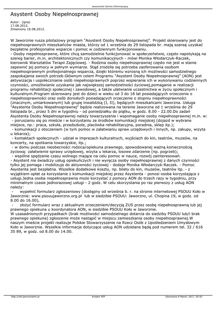Asystent Osoby Niepełnosprawnej - Jaworznicki Serwis Informacyjny