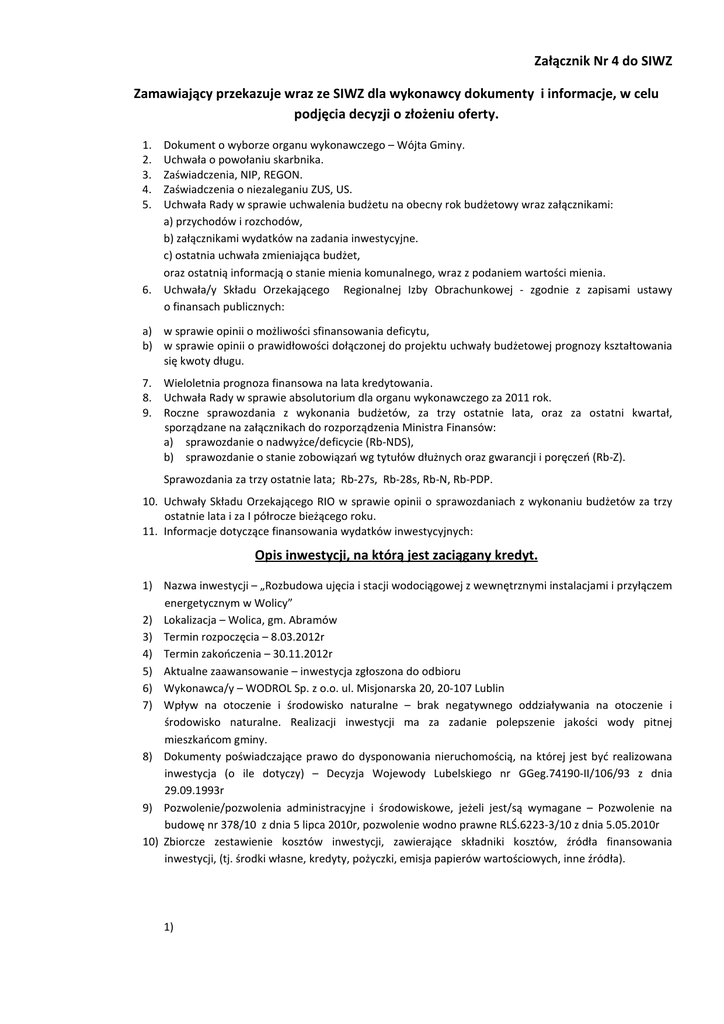 Załącznik Nr 4 do SIWZ Zamawiający przekazuje wraz ze SIWZ dla wykonawcy dokumenty i informacje, w celu podjęcia decyzji o złożeniu oferty. 1. 2. 3. 4. 5. 6. Dokument o wyborze organu wykonawczego – Wójta Gminy. Uchwała o powołaniu skarbnika. Zaświadczenia, NIP, REGON. Zaświadczenia o niezaleganiu ZUS, US. Uchwała Rady w sprawie uchwalenia budżetu na obecny rok budżetowy wraz załącznikami: a) przychodów i rozchodów, b) załącznikami wydatków na zadania inwestycyjne. c) ostatnia uchwała zmieniająca budżet, oraz ostatnią informacją o stanie mienia komunalnego, wraz z podaniem wartości mienia. Uchwała/y Składu Orzekającego Regionalnej Izby Obrachunkowej - zgodnie z zapisami ustawy o finansach publicznych: a) w sprawie opinii o możliwości sfinansowania deficytu, b) w sprawie opinii o prawidłowości dołączonej do projektu uchwały budżetowej prognozy kształtowania się kwoty długu. 7. Wieloletnia prognoza finansowa na lata kredytowania. 8. Uchwała Rady w sprawie absolutorium dla organu wykonawczego za 2011 rok. 9. Roczne sprawozdania z wykonania budżetów, za trzy ostatnie lata, oraz za ostatni kwartał, sporządzane na załącznikach do rozporządzenia Ministra Finansów: a) sprawozdanie o nadwyżce/deficycie (Rb-NDS), b) sprawozdanie o stanie zobowiązań wg tytułów dłużnych oraz gwarancji i poręczeń (Rb-Z). Sprawozdania za trzy ostatnie lata; Rb-27s, Rb-28s, Rb-N, Rb-PDP. 10. Uchwały Składu Orzekającego RIO w sprawie opinii o sprawozdaniach z wykonaniu budżetów za trzy ostatnie lata i za I półrocze bieżącego roku. 11. Informacje dotyczące finansowania wydatków inwestycyjnych: Opis inwestycji, na którą jest zaciągany kredyt. 1) Nazwa inwestycji – „Rozbudowa ujęcia i stacji wodociągowej z wewnętrznymi instalacjami i przyłączem energetycznym w Wolicy” 2) Lokalizacja – Wolica, gm. Abramów 3) Termin rozpoczęcia – 8.03.2012r 4) Termin zakończenia – 30.11.2012r 5) Aktualne zaawansowanie – inwestycja zgłoszona do odbioru 6) Wykonawca/y – WODROL Sp. z o.o. ul. Misjonarska 20, 20-107 Lublin 7) Wpływ na otoczenie i środowisko naturalne – brak negatywnego oddziaływania na otoczenie i środowisko naturalne. Realizacji inwestycji ma za zadanie polepszenie jakości wody pitnej mieszkańcom gminy. 8) Dokumenty poświadczające prawo do dysponowania nieruchomością, na której jest być realizowana inwestycja (o ile dotyczy) – Decyzja Wojewody Lubelskiego nr GGeg.74190-II/106/93 z dnia 29.09.1993r 9) Pozwolenie/pozwolenia administracyjne i środowiskowe, jeżeli jest/są wymagane – Pozwolenie na budowę nr 378/10 z dnia 5 lipca 2010r, pozwolenie wodno prawne RLŚ.6223-3/10 z dnia 5.05.2010r 10) Zbiorcze zestawienie kosztów inwestycji, zawierające składniki kosztów, źródła finansowania inwestycji, (tj. środki własne, kredyty, pożyczki, emisja papierów wartościowych, inne źródła). 1) L.P. Składniki kosztów przedsięwzięcia Koszt całkowity Stan zaawansowania robót x x Wartość w tys. zł. Wartość w tys. zł. Pozostaje do wykonania Wartość w tys. zł. % 1 Rozbudowa ujęcia i stacji wodociągowej z wewnętrznymi instalacjami w Wolicy 1700 381,45 1 700 381,45 0,00 0,00 2 Nadzór inwestorski 43050,00 43 050,00 0,00 0,00 1 743 431,45 1 700 381,45 43 050,00 0,00 1-n Koszty inwestycji ogółem 2) Informacja o źródłach finansowania inwestycji Środki własne w tys. zł. 237 656,45 zł Kredyty w tys. zł. 500 000,00 zł Pożyczki w tys. zł. 1 005 775,00 zł Emisja papierów wartościowych w tys. zł. 00,00 Inne źródła w tys. zł. 0,00 … Koszty inwestycji ogółem 1 743 431,45 12. informacje o zaciągniętych kredytach, pożyczkach z terminarzami spłaty, oprocentowaniem, informacjami o zabezpieczeniach, nazwach banków-instytucji finansowych, które udzieliły kredytów, pożyczek. 13. Opinia banku prowadzącego bankową obsługę budżetu Gminy. 14. Wybrane informacje o gminie Abramów; tj: 1. Podmioty, w których jednostka samorządu terytorialnego jest udziałowcem / akcjonariuszem. Nazwa podmiotu Wartość udziałów (w tys. % udziałów w kapitale podmiotu zł) BRAK 2. Poręczenia i gwarancje udzielone przez jednostkę samorządu terytorialnego. Podmiot/osoba, za którą udzielono poręczenia/gwarancji BRAK Beneficjent poręczenia/gwarancji Kwota udzielonego poręczenia/gwarancji (w tys. zł) Okres obowiązywania poręczenia/gwarancji od .......... .do .............. 3. Należności z tytułu pożyczek udzielonych przez jednostkę samorządu terytorialnego. Podmiot/osoba, której udzielono pożyczki Data udzielenia pożyczki Ostateczny termin spłaty pożyczki Kwota udzielonej pożyczki (w tys. zł) BRAK 4. Zobowiązania inne niż, z tytułu zaciągniętych kredytów i pożyczek. Podmiot, wobec którego istnieje zobowiązanie Tytuł zobowiązania Kwota zobowiązania pozostała do spłaty Data powstania zobowiązania Data wygaśnięcia zobowiązania Zabezpieczenia (w tys. zł) BRAK 5. Inne istotne informacje, w tym informacje o zobowiązaniach wymagalnych. .................................................................................................................................................................. .................................................................................................................................................................. 10.12.2012r Skarbnik Gminy – Anna Stasiak