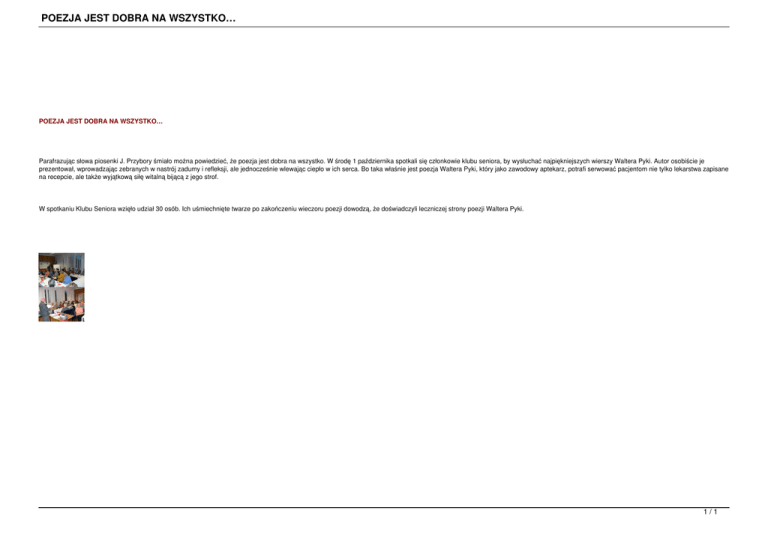 POEZJA JEST DOBRA NA WSZYSTKO… POEZJA JEST DOBRA NA WSZYSTKO… Parafrazując słowa piosenki J. Przybory śmiało można powiedzieć, że poezja jest dobra na wszystko. W środę 1 października spotkali się członkowie klubu seniora, by wysłuchać najpiękniejszych wierszy Waltera Pyki. Autor osobiście je prezentował, wprowadzając zebranych w nastrój zadumy i refleksji, ale jednocześnie wlewając ciepło w ich serca. Bo taka właśnie jest poezja Waltera Pyki, który jako zawodowy aptekarz, potrafi serwować pacjentom nie tylko lekarstwa zapisane na recepcie, ale także wyjątkową siłę witalną bijącą z jego strof. W spotkaniu Klubu Seniora wzięło udział 30 osób. Ich uśmiechnięte twarze po zakończeniu wieczoru poezji dowodzą, że doświadczyli leczniczej strony poezji Waltera Pyki. 1/1