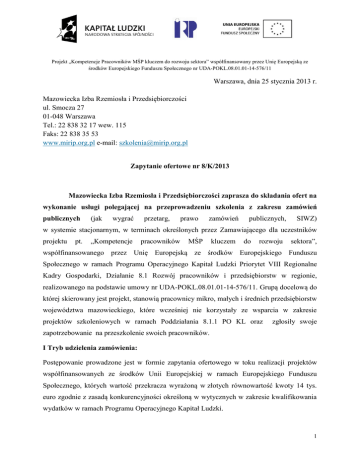 Projekt „Kompetencje Pracowników MŚP kluczem do rozwoju sektora” współfinansowany przez Unię Europejską ze środków Europejskiego Funduszu Społecznego nr UDA-POKL.08.01.01-14-576/11 Warszawa, dnia 25 stycznia 2013 r. Mazowiecka Izba Rzemiosła i Przedsiębiorczości ul. Smocza 27 01-048 Warszawa Tel.: 22 838 32 17 wew. 115 Faks: 22 838 35 53 www.mirip.org.pl e-mail: [email protected] Zapytanie ofertowe nr 8/K/2013 Mazowiecka Izba Rzemiosła i Przedsiębiorczości zaprasza do składania ofert na wykonanie usługi polegającej na przeprowadzeniu szkolenia z zakresu zamówień publicznych (jak wygrać przetarg, prawo zamówień publicznych, SIWZ) w systemie stacjonarnym, w terminach określonych przez Zamawiającego dla uczestników projektu pt. „Kompetencje pracowników MŚP kluczem do rozwoju sektora”, współfinansowanego przez Unię Europejską ze środków Europejskiego Funduszu Społecznego w ramach Programu Operacyjnego Kapitał Ludzki Priorytet VIII Regionalne Kadry Gospodarki, Działanie 8.1 Rozwój pracowników i przedsiębiorstw w regionie, realizowanego na podstawie umowy nr UDA-POKL.08.01.01-14-576/11. Grupą docelową do której skierowany jest projekt, stanowią pracownicy mikro, małych i średnich przedsiębiorstw województwa mazowieckiego, które wcześniej nie korzystały ze wsparcia w zakresie projektów szkoleniowych w ramach Poddziałania 8.1.1 PO KL oraz zgłosiły swoje zapotrzebowanie na przeszkolenie swoich pracowników. I Tryb udzielenia zamówienia: Postępowanie prowadzone jest w formie zapytania ofertowego w toku realizacji projektów współfinansowanych ze środków Unii Europejskiej w ramach Europejskiego Funduszu Społecznego, których wartość przekracza wyrażoną w złotych równowartość kwoty 14 tys. euro zgodnie z zasadą konkurencyjności określoną w wytycznych w zakresie kwalifikowania wydatków w ramach Programu Operacyjnego Kapitał Ludzki. 1 Projekt „Kompetencje Pracowników MŚP kluczem do rozwoju sektora” współfinansowany przez Unię Europejską ze środków Europejskiego Funduszu Społecznego nr UDA-POKL.08.01.01-14-576/11 II Opis przedmiotu zamówienia: Przedmiotem zamówienia jest: 1. Opracowanie koncepcji i zakresu merytorycznego szkolenia, zawierającego: a) Zakres tematyczny w podziale na dni, godziny i bloki tematyczne oraz sposób organizacji szkolenia; Szczegółowy program: szkolenia z zakresu zamówień publicznych dostarczają wiedzy, która przygotowuje do prawidłowego zorganizowania i przeprowadzenia zamówień publicznych zgodnie z prawem zamówień publicznych w Polsce. Podczas tego szkolenia uczestnicy zapoznają się z systemem zamówień publicznych w Polsce, podmiotowym i przedmiotowym zakresem stosowania znowelizowanej ustawy Prawo zamówień publicznych (PZP) oraz zasadami udzielania zamówień publicznych. Szkolenie przybliża wiedzę z zakresu wartości zamówienia, trybów udzielania zamówień publicznych oraz zamówień podprogowych do 14 tys. euro. Osoby przeszkolone poznają się z zasadami postępowania o zamówienie publiczne w aspektach dla zamawiających i wykonawców. b) Wykaz materiałów i narzędzi stosowanych przez Wykonawcę. c) Sposób weryfikacji efektów szkolenia. 2. Opracowanie i przygotowanie materiałów, środków i pomocy dydaktycznych potrzebnych do przeprowadzenia i przeszkolenia 40 osób (4 grupy szkoleniowe x 10 osób x 16 godzin) w tym minimum: a) prezentację w programie Microsoft Office Power Point na każde z realizowanych szkoleń, b) spis literatury dodatkowej dla uczestników, c) pozycje literatury z w/w zakresu stanowiące propozycję materiału szkoleniowego do zakupu przez Zamawiającego. Wykonawca opracowuje i przekazuje Zleceniodawcy wszelkie materiały, które zostaną wykorzystane do przeprowadzenia danego szkolenia na 2 tygodnie przed jego rozpoczęciem. 2 Projekt „Kompetencje Pracowników MŚP kluczem do rozwoju sektora” współfinansowany przez Unię Europejską ze środków Europejskiego Funduszu Społecznego nr UDA-POKL.08.01.01-14-576/11 3. Przeprowadzenie kursów. Zostaną zorganizowane 4 grupy szkoleniowe x 10 osób x 16 godzin szkoleniowych. Kursy będą prowadzone w wymiarze średnio 4-8 godzin dzień szkoleniowy (1h szkoleniowa = 45 min) w systemie stacjonarnym w dni powszednie po wcześniejszym ustaleniu liczby dni szkoleniowych z Wykonawcą. Zajęcia na poszczególnych kursach powinny odbywać się według harmonogramu ustalonego wspólnie z Zamawiającym, w czasie godzin pracy uczestników projektu, na terenie województwa mazowieckiego w Sali wskazanej przez Zamawiającego. 4. Opracowanie i przedstawienie raportu podsumowującego efekty osiągnięte przez uczestników szkolenia (min. 2 standardowe strony A4). III Forma współpracy: Pomiędzy Zamawiającym a Wykonawcą będzie zawarta umowa cywilnoprawna na czas trwania szkoleń. IV Nazwa i kod określone we Wspólnym Słowniku Zamówień: 80.50.00.00 - 9 - Usługi szkoleniowe V Termin wykonania zamówienia: Realizacja cyklu szkoleń przewidziana jest na okres luty 2013 – sierpień 2013 r. Do końca sierpnia 2013 r. planowane jest zorganizowanie szkoleń dla 4 grup szkoleniowych dla 40 osób (4 grupy x 10 osób x 16 godzin). VI Opis warunków udziału w postępowaniu: 1. W toku postępowania niniejszego zapytania ofertowego zostanie wyłoniony jeden Wykonawca. 2. Wykonawca powinien posiadać: a. niezbędną wiedzę teoretyczną i praktyczną, b. stosowne uprawnienia, c. wykształcenie i doświadczenie szkoleniowe w ramach prezentowanego tematu, wynikające z wykonywanego zawodu lub pełnionej funkcji, 3 Projekt „Kompetencje Pracowników MŚP kluczem do rozwoju sektora” współfinansowany przez Unię Europejską ze środków Europejskiego Funduszu Społecznego nr UDA-POKL.08.01.01-14-576/11 d. wykonawca powinien znajdować się w sytuacji ekonomicznej i finansowej zapewniającej wykonanie zamówienia, co potwierdza oświadczeniem (w zał. nr 1). VII Kryteria oceny ofert: 1) Doś