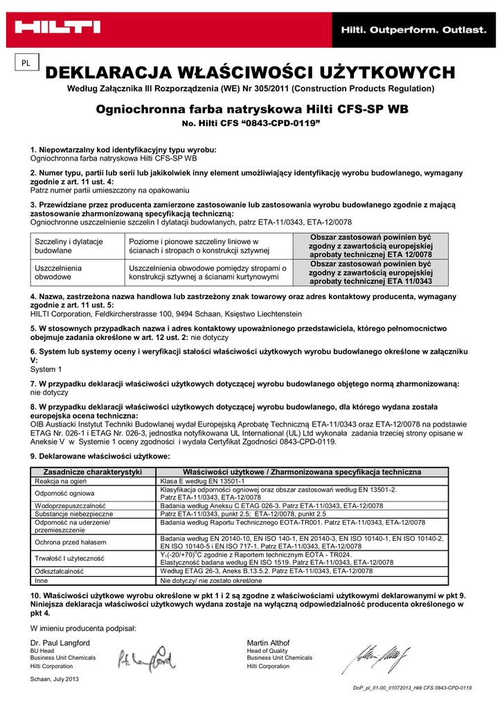 PL DEKLARACJA WŁAŚCIWOŚCI UŻYTKOWYCH Według Załącznika III Rozporządzenia (WE) Nr 305/2011 (Construction Products Regulation) Ogniochronna farba natryskowa Hilti CFS-SP WB No. Hilti CFS “0843-CPD-0119” 1. Niepowtarzalny kod identyfikacyjny typu wyrobu: Ogniochronna farba natryskowa Hilti CFS-SP WB 2. Numer typu, partii lub serii lub jakikolwiek inny element umożliwiający identyfikację wyrobu budowlanego, wymagany zgodnie z art. 11 ust. 4: Patrz numer partii umieszczony na opakowaniu 3. Przewidziane przez producenta zamierzone zastosowanie lub zastosowania wyrobu budowlanego zgodnie z mającą zastosowanie zharmonizowaną specyfikacją techniczną: Ogniochronne uszczelnienie szczelin I dylatacji budowlanych, patrz ETA-11/0343, ETA-12/0078 Szczeliny i dylatacje budowlane Poziome i pionowe szczeliny liniowe w ścianach i stropach o konstrukcji sztywnej Uszczelnienia obwodowe Uszczelnienia obwodowe pomiędzy stropami o konstrukcji sztywnej a ścianami kurtynowymi Obszar zastosowań powinien być zgodny z zawartością europejskiej aprobaty technicznej ETA 12/0078 Obszar zastosowań powinien być zgodny z zawartością europejskiej aprobaty technicznej ETA 11/0343 4. Nazwa, zastrzeżona nazwa handlowa lub zastrzeżony znak towarowy oraz adres kontaktowy producenta, wymagany zgodnie z art. 11 ust. 5: HILTI Corporation, Feldkircherstrasse 100, 9494 Schaan, Księstwo Liechtenstein 5. W stosownych przypadkach nazwa i adres kontaktowy upoważnionego przedstawiciela, którego pełnomocnictwo obejmuje zadania określone w art. 12 ust. 2: nie dotyczy 6. System lub systemy oceny i weryfikacji stałości właściwości użytkowych wyrobu budowlanego określone w załączniku V: System 1 7. W przypadku deklaracji właściwości użytkowych dotyczącej wyrobu budowlanego objętego normą zharmonizowaną: nie dotyczy 8. W przypadku deklaracji właściwości użytkowych dotyczącej wyrobu budowlanego, dla którego wydana została europejska ocena techniczna: OIB Austiacki Instytut Techniki Budowlanej wydał Europejską Aprobatę Techniczną ETA-11/0343 oraz ETA-12/0078 na podstawie ETAG Nr. 026-1 i ETAG Nr. 026-3, jednostka notyfikowana UL International (UL) Ltd wykonała zadania trzeciej strony opisane w Aneksie V w Systemie 1 oceny zgodności i wydała Certyfikat Zgodności 0843-CPD-0119. 9. Deklarowane właściwości użytkowe: Zasadnicze charakterystyki Reakcja na ogień Odporność ogniowa Wodoprzepuszczalność Substancje niebezpieczne Odporność na uderzenie/ przemieszczenie Ochrona przed hałasem Trwałość I użyteczność Odkształcalność Inne Właściwości użytkowe / Zharmonizowana specyfikacja techniczna Klasa E według EN 13501-1 Klasyfikacja odporności ogniowej oraz obszar zastosowań według EN 13501-2. Patrz ETA-11/0343, ETA-12/0078 Badania według Aneksu C ETAG 026-3. Patrz ETA-11/0343, ETA-12/0078 Patrz ETA-11/0343, punkt 2.5; ETA-12/0078, punkt 2.5 Badania według Raportu Technicznego EOTA-TR001. Patrz ETA-11/0343, ETA-12/0078 Badania według EN 20140-10, EN ISO 140-1, EN 20140-3, EN ISO 10140-1, EN ISO 10140-2, EN ISO 10140-5 i EN ISO 717-1. Patrz ETA-11/0343, ETA-12/0078 o Y1(-20/+70) C zgodnie z Raportem technicznym EOTA - TR024. Elastyczność badana według EN ISO 1519. Patrz ETA-11/0343, ETA-12/0078 Według ETAG 26-3, Aneks B.13.5.2. Patrz ETA-11/0343, ETA-12/0078 Nie dotyczy/ nie zostało określone 10. Właściwości użytkowe wyrobu określone w pkt 1 i 2 są zgodne z właściwościami użytkowymi deklarowanymi w pkt 9. Niniejsza deklaracja właściwości użytkowych wydana zostaje na wyłączną odpowiedzialność producenta określonego w pkt 4. W imieniu producenta podpisał: Dr. Paul Langford Martin Althof BU Head Business Unit Chemicals Hilti Corporation Head of Quality Business Unit Chemicals Hilti Corporation Schaan, July 2013 DoP_pl_01-00_01072013_Hilti CFS 0843-CPD-0119