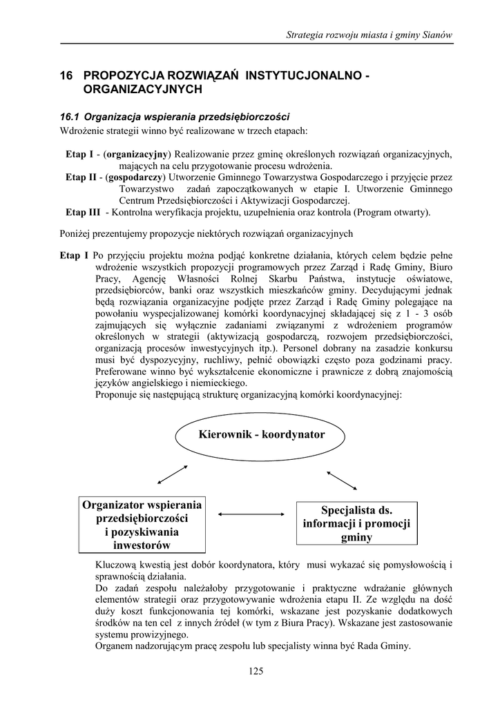 Strategia rozwoju miasta i gminy Sianów 16 PROPOZYCJA ROZWIĄZAŃ INSTYTUCJONALNO ORGANIZACYJNYCH 16.1 Organizacja wspierania przedsiębiorczości Wdrożenie strategii winno być realizowane w trzech etapach: Etap I - (organizacyjny) Realizowanie przez gminę określonych rozwiązań organizacyjnych, mających na celu przygotowanie procesu wdrożenia. Etap II - (gospodarczy) Utworzenie Gminnego Towarzystwa Gospodarczego i przyjęcie przez Towarzystwo zadań zapoczątkowanych w etapie I. Utworzenie Gminnego Centrum Przedsiębiorczości i Aktywizacji Gospodarczej. Etap III - Kontrolna weryfikacja projektu, uzupełnienia oraz kontrola (Program otwarty). Poniżej prezentujemy propozycje niektórych rozwiązań organizacyjnych Etap I Po przyjęciu projektu można podjąć konkretne działania, których celem będzie pełne wdrożenie wszystkich propozycji programowych przez Zarząd i Radę Gminy, Biuro Pracy, Agencję Własności Rolnej Skarbu Państwa, instytucje oświatowe, przedsiębiorców, banki oraz wszystkich mieszkańców gminy. Decydującymi jednak będą rozwiązania organizacyjne podjęte przez Zarząd i Radę Gminy polegające na powołaniu wyspecjalizowanej komórki koordynacyjnej składającej się z 1 - 3 osób zajmujących się wyłącznie zadaniami związanymi z wdrożeniem programów określonych w strategii (aktywizacją gospodarczą, rozwojem przedsiębiorczości, organizacją procesów inwestycyjnych itp.). Personel dobrany na zasadzie konkursu musi być dyspozycyjny, ruchliwy, pełnić obowiązki często poza godzinami pracy. Preferowane winno być wykształcenie ekonomiczne i prawnicze z dobrą znajomością języków angielskiego i niemieckiego. Proponuje się następującą strukturę organizacyjną komórki koordynacyjnej: Kierownik - koordynator Organizator wspierania przedsiębiorczości i pozyskiwania inwestorów Specjalista ds. informacji i promocji gminy Kluczową kwestią jest dobór koordynatora, który musi wykazać się pomysłowością i sprawnością działania. Do zadań zespołu należałoby przygotowanie i praktyczne wdrażanie głównych elementów strategii oraz przygotowywanie wdrożenia etapu II. Ze względu na dość duży koszt funkcjonowania tej komórki, wskazane jest pozyskanie dodatkowych środków na ten cel z innych źródeł (w tym z Biura Pracy). Wskazane jest zastosowanie systemu prowizyjnego. Organem nadzorującym pracę zespołu lub specjalisty winna być Rada Gminy. 125 SKE Pomerania – Instytut Aktywizacji Społeczno-Gospodarczej Gmin i Regionu Zakres pracy zespołu lub specjalisty obejmowałby: • promocję drobnej przedsiębiorczości, generowanie liderów, • utworzenie centrum edukacyjnego na bazie szkoły, organizowanie szkoleń z zakresu drobnej przedsiębiorczości, przekwalifikowania zawodowego, prowadzenia firmy itp., • zorganizowanie stałego punktu informacyjnego w siedzibie Urzędu Gminy - dla osób rozpoczynających działalność gospodarczą, • zorganizowanie Gminnego Centrum Przedsiębiorczości i Aktywizacji Gospodarczej, • nawiązanie kontaktów z organizacjami krajowymi i zagranicznymi w celu organizowania praktyk dla lokalnych liderów i przedsiębiorców (wyjazdy studyjne, seminaria, konferencje, wymiana grup), • podjęcie współpracy z instytucjami finansowymi, Funduszami, Fundacjami itp. w celu pozyskania środków finansowych z zewnątrz na wsparcie rozwoju gospodarczego gminy, • pozyskanie inwestorów i zorganizowanie serwisu inwestycyjnego obejmującego wspieranie inwestorów chcących prowadzić działalność gospodarczą na terenie gminy (organizacja procedury obsługi wybranych inwestycji, monitoring inwestycji itp.), • nawiązywanie i utrzymywanie stałych kontaktów ze środowiskami przedsiębiorców (organizowanie stałych spotkań, przekazywanie informacji o stanie finansowym i inicjatywach gospodarczych, współorganizowanie przedsięwzięć z zakresu budowy infrastruktury komunikacyjnej, transportowej itp.), • tworzenie ułatwień dla podejmowania i rozszerzania działalności gospodarczej i kierowanie propozycji nowych rozwiązań do władz gminy, • współpraca z Agencją Rozwoju Regionalnego, Izbą Rolniczą i Ośrodkiem Doradztwa Rolniczego, • promocja gminy (programu) na zewnątrz. Tworzenie image’u gminy w środkach masowego przekazu. Organizowanie kontaktów z mediami wg zasady, jak największego dostępu prasy, radia i telewizji do wszelkich spraw, związanych z realizacją programów. Przygotowanie biuletynu informacyjnego. W informatorze należy zaprezentować możliwości rozpoczynania prowadzenia działalności gospodarczej, walorów turystycznych, kulturalnych, edukacyjnych itp. Ważne będą ogłoszenia prasowe w lokalnych gazetach, w dziennikach ogólnopolskich a także w czasopismach rolniczych. • Stały kontakt z Agencją Własności Rolnej Skarbu Państwa Oddziałem Terenowym w Szczecinie, Agencją Restrukturyzacji i Modernizacji Rolnictwa, Ośrodkami Doradztwa Rolniczego. Etap II jest kontynuacją działań podjętych wcześniej. Zakłada się, że rozwój gospodarczy gminy oparty będzie o nowe firmy (głównie prywatne) i przedsięwzięcia inwestycyjne obejmujące infrastrukturę techniczną (programy w załączeniu). Przewiduje się dużą dynamikę korzystnych tendencji. Niezbędne jest zatem utworzenie nowych instytucji, które wspierałyby uruchomione procesy gospodarcze: • Gminnego Towarzystwa Gospodarczego • Funduszu Gwarancji Kredytowych • Gminnego Centrum Przedsiębiorczości i Aktywizacji Gospodarczej • Związków międzygminnych celem realizacji wspólnych przedsięwzięć inwestycyjnych 126 Strategia rozwoju miasta i gminy Sianów Gminne Towarzystwo Gospodarcze Gminne Towarzystwo Gospodarcze będzie grupowało miejscowych przedsiębiorców, rolników, osoby prywatne, banki, Agencje Własności Rolnej Skarbu Państwa oraz Samorząd Gminy: - winno być ono głównym organizatorem i koordynatorem rozwoju gospodarczego i społecznego gmi