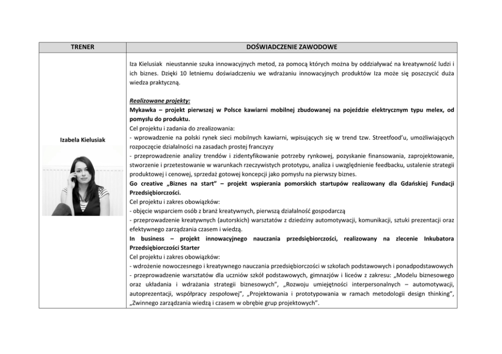 TRENER DOŚWIADCZENIE ZAWODOWE Iza Kielusiak nieustannie szuka innowacyjnych metod, za pomocą których można by oddziaływać na kreatywność ludzi i ich biznes. Dzięki 10 letniemu doświadczeniu we wdrażaniu innowacyjnych produktów Iza może się poszczycić duża wiedza praktyczną. Izabela Kielusiak Realizowane projekty: Mykawka – projekt pierwszej w Polsce kawiarni mobilnej zbudowanej na pojeździe elektrycznym typu melex, od pomysłu do produktu. Cel projektu i zadania do zrealizowania: - wprowadzenie na polski rynek sieci mobilnych kawiarni, wpisujących się w trend tzw. Streetfood’u, umożliwiających rozpoczęcie działalności na zasadach prostej franczyzy - przeprowadzenie analizy trendów i zidentyfikowanie potrzeby rynkowej, pozyskanie finansowania, zaprojektowanie, stworzenie i przetestowanie w warunkach rzeczywistych prototypu, analiza i uwzględnienie feedbacku, ustalenie strategii produktowej i cenowej, sprzedaż gotowej koncepcji jako pomysłu na pierwszy biznes. Go creative „Biznes na start” – projekt wspierania pomorskich startupów realizowany dla Gdańskiej Fundacji Przedsiębiorczości. Cel projektu i zakres obowiązków: - objęcie wsparciem osób z branż kreatywnych, pierwszą działalność gospodarczą - przeprowadzenie kreatywnych (autorskich) warsztatów z dziedziny automotywacji, komunikacji, sztuki prezentacji oraz efektywnego zarządzania czasem i wiedzą. In business – projekt innowacyjnego nauczania przedsiębiorczości, realizowany na zlecenie Inkubatora Przedsiębiorczości Starter Cel projektu i zakres obowiązków: - wdrożenie nowoczesnego i kreatywnego nauczania przedsiębiorczości w szkołach podstawowych i ponadpodstawowych - przeprowadzenie warsztatów dla uczniów szkół podstawowych, gimnazjów i liceów z zakresu: „Modelu biznesowego oraz układania i wdrażania strategii biznesowych”, „Rozwoju umiejętności interpersonalnych – automotywacji, autoprezentacji, współpracy zespołowej”, „Projektowania i prototypowania w ramach metodologii design thinking”, „Zwinnego zarządzania wiedzą i czasem w obrębie grup projektowych”. 03. 2013 – 10. 2013 Pomorska Fabryka Designu – projekt realizowany na zlecenie Powiatowego Urzędu Pracy w Gdańsku i Gdańskiej Fundacji Przedsiębiorczości. Cel projektu i zakres obowiązków: - projekt aktywizacji zawodowej osób 50 + zajmujących się działalnością rękodzielniczą inspirowany szwajcarskim Senior Design Factory - współtworzenie i budowa marki 100 PALCÓW - otoczenie uczestników wsparciem szkoleniowym oraz doradczym z dziedziny prowadzenia biznesu, nowoczesnego projektowania produktowego oraz współtworzenia od podstaw marki 100 palców Fido Voice – firma technologiczna, oferująca technologię wykorzystania głosu i języka naturalnego jako nowego interfejsu komunikacji z aplikacjami mobilnymi. Cel projektu i zadania do zrealizowania: - budowa aplikacji mobilnej dedykowanej do realizacji projektu intuicyjnego systemu wyszukiwania, bazującego na języku naturalnym, który może zostać wykorzystany w komunikacji głosowej z urządzeniami mobilnymi. - projektowanie etapów wdrożenia innowacji i adaptacji przez early adopters - projekt został laureatem konkursu Pulsu Biznesu „Biznes na 5” uzyskując dofinansowanie inwestorskie w wysokości 3 mln pln. Fido Intelligence - prywatna firma naukowo-badawcza specjalizującą się w przetwarzaniu języka naturalnego, wykorzystywanego w systemach wspierania biznesu B2B. Zakres obowiązków: - zarządzanie relacjami, wspieranie sprzedaży, team leader zlecanych projektów, coaching start-upów, komunikowanie i wdrażanie strategii, wspieranie sprzedaży, prowadzenie szkoleń i warsztatów produktowych DZIAŁALNOŚĆ DODATKOWA (w obszarze trenerskim, szkoleniowym, doradczym, mentorskim): - Gdańsk\Gdynia Business Week (jako coach podczas kolejnych edycji) - Geek Girls Carrot (jako mentor oraz mówca podczas gościnnych wykładów) - Startup weekend (jako mentor i trener modelu biznesowego) - Uniwersytet Warmińsko-Mazurski (jako trener prowadzący szkolenia w ramach działania “Kapitał Ludzki”) W Akademii prowadzi szkolenia w tematach: • „Budowanie modelu biznesowego”- 17.10.2015