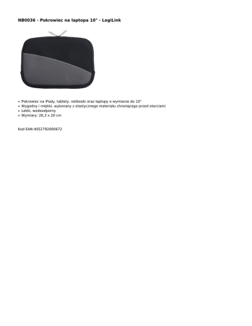 NB0036 - Pokrowiec na laptopa 10" - LogiLink ● ● ● ● Pokrowiec na iPady, tablety, netbooki oraz laptopy o wymiarze do 10" Wygodny i miękki, wykonany z elastycznego materiału chroniącego przed otarciami Lekki, wodoodporny Wymiary: 26,3 x 20 cm Kod EAN:4052792000672