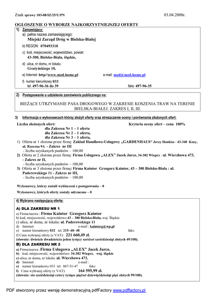 Znak sprawy 103-08/IZ/25/U/PN 03.04.2008r. OGŁOSZENIE O WYBORZE NAJKORZYSTNIEJSZEJ OFERTY 1) Zamawiający: a) pełna nazwa zamawiającego: Miejski Zarząd Dróg w Bielsku-Białej b) REGON: 070493318 c) kod, miejscowość, województwo, powiat: 43-300, Bielsko-Biała, śląskie, d) ulica, nr domu, nr lokalu: Grażyńskiego 10, e) Internet: http//www.mzd.home.pl e-mail: [email protected] f) numer kierunkowy 033 tel. 497-96-36 do 39 faks: 497-96-35 2) Postępowanie o udzielenie zamówienia publicznego na: BIEŻĄCE UTRZYMANIE PASA DROGOWEGO W ZAKRESIE KOSZENIA TRAW NA TERENIE BIELSKA-BIAŁEJ. ZAKRES I, II, III. 3) Informacja o wykonawcach którzy złożyli oferty oraz streszczenie oceny i porównania złożonych ofert: Liczba złożonych ofert: Kryteria oceny ofert – cena 100% dla Zakresu Nr 1 – 1 oferta dla Zakresu Nr 2 – 1 oferta, dla Zakresu Nr 3 – 1 oferta, 1) Oferta nr 1 złożona przez firmę: Zakład Handlowo-Usługowy „GARDENHAUS” Jerzy Honkisz : 43-340 Kozy, ul. Rzeczna 9A - Zakres nr III - liczba uzyskanych punktów – 100,00 2) Oferta nr 2 złożona przez firmę: Firma Usługowa „ALEX” Jacek Jarco, 34-382 Wieprz : ul. Wierzbowa 473, - Zakres nr II, - liczba uzyskanych punktów – 100,00 3) Oferta nr 3 złożona przez firmę: Firma Kaintor Grzegorz Kaintor, 43 – 300 Bielsko-Biała : ul. Paderewskiego 11 - Zakres nr III, - liczba uzyskanych punktów – 100,00 Wykonawcy, którzy zostali wykluczeni z postępowania – 0 Wykonawcy, których oferty zostały odrzucone – 0 4) Wybrano następującą ofertę: A) DLA ZAKRESU NR 1 a) Firma/nazwa : Firma Kaintor Grzegorz Kaintor b) kod, miejscowość, województwo 43 – 300 Bielsko-Biała, woj. Śląskie c) ulica, nr domu, nr lokalu: ul. Paderewskiego 11 d) Internet: e-mail : [email protected] e) numer kierunkowy 032 tel. 215- 60- 40 faks: f) Cena wybranej oferty (z VAT): 221 660,49 zł. (słownie: dwieście dwadzieścia jeden tysięcy sześćset sześćdziesiąt złotych 49/100). B) DLA ZAKRESU NR 2 a) Firma/nazwa :Firma Usługowa „ALEX” Jacek Jarco, b) kod, miejscowość, województwo: 34-382 Wieprz, woj. śląskie c) ulica, nr domu, nr lokalu: ul. Wierzbowa 473, d) Internet: e-mail : e) numer kierunkowy 033 tel. 867-51-47 faks: f) Cena wybranej oferty (z VAT): 164 595,99 zł. (słownie: sto sześćdziesiąt cztery tysiące pięćset dziewięćdziesiąt pięć złotych 99/100). PDF stworzony przez wersję demonstracyjną pdfFactory www.pdffactory.pl Znak sprawy 103-08/IZ/25/U/PN 03.04.2008r. C) DLA ZAKRESU NR 3 a) Firma/nazwa : Zakład Handlowo-Usługowy „GARDENHAUS” Jerzy Honkisz b) kod, miejscowość, województwo : 43-340 Kozy, woj. śląskie c) ulica, nr domu, nr lokalu: ul. Rzeczna 9A, d) Internet: e-mail : e) numer kierunkowy 033 tel. 817-58-60 faks: f) Cena wybranej oferty (z VAT): 38 194,25 zł. (słownie: trzydzieści osiem tysięcy sto dziewięćdziesiąt cztery złote 25/100). 5) Uzasadnienie wyboru: Wykonawcy, których oferty wybrano nie podlegają wykluczeniu, ich oferty są ważne, zgodne ze specyfikacją istotnych warunków zamówienia i ustawą i nie podlegają odrzuceniu. W oparciu o kryterium wyboru ofert, którym jest cena, Zamawiający dokonał, do realizacji przedmiotowego zamówienia, wyboru ofert korzystniejszych cenowo dla poszczególnych zadań. DYREKTOR Maria Górkiewicz (podpis osoby sporządzającej) mgr inż. Wojciech Waluś (podpis kierownika zamawiającego lub osoby upoważnionej) PDF stworzony przez wersję demonstracyjną pdfFactory www.pdffactory.pl