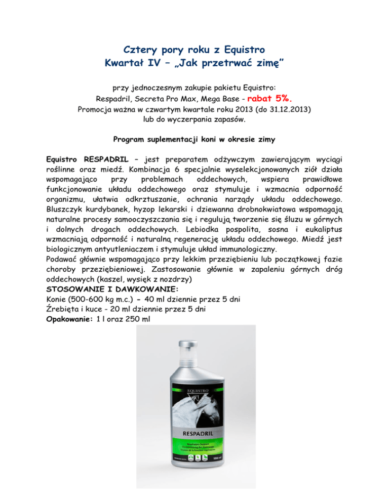 Cztery pory roku z Equistro Kwartał IV – „Jak przetrwać zimę” przy jednoczesnym zakupie pakietu Equistro: Respadril, Secreta Pro Max, Mega Base - rabat 5%. Promocja ważna w czwartym kwartale roku 2013 (do 31.12.2013) lub do wyczerpania zapasów. Program suplementacji koni w okresie zimy Equistro RESPADRIL – jest preparatem odżywczym zawierającym wyciągi roślinne oraz miedź. Kombinacja 6 specjalnie wyselekcjonowanych ziół działa wspomagająco przy problemach oddechowych, wspiera prawidłowe funkcjonowanie układu oddechowego oraz stymuluje i wzmacnia odporność organizmu, ułatwia odkrztuszanie, ochrania narządy układu oddechowego. Bluszczyk kurdybanek, hyzop lekarski i dziewanna drobnokwiatowa wspomagają naturalne procesy samooczyszczania się i regulują tworzenie się śluzu w górnych i dolnych drogach oddechowych. Lebiodka pospolita, sosna i eukaliptus wzmacniają odporność i naturalną regenerację układu oddechowego. Miedź jest biologicznym antyutleniaczem i stymuluje układ immunologiczny. Podawać głównie wspomagająco przy lekkim przeziębieniu lub początkowej fazie choroby przeziębieniowej. Zastosowanie głównie w zapaleniu górnych dróg oddechowych (kaszel, wysięk z nozdrzy) STOSOWANIE I DAWKOWANIE: Konie (500-600 kg m.c.) - 40 ml dziennie przez 5 dni Źrebięta i kuce - 20 ml dziennie przez 5 dni Opakowanie: 1 l oraz 250 ml Noworodki i oseski Equistro SECRETA PRO MAX – jest w szczególności zalecana dla koni wymagających poprawy sprawności układu oddechowego, w celu zwiększenia komfortu oddychania i życia Naturalna odporność koni zależy m.in. od dostarczenia organizmowi niezbędnych witamin i ziół. Siano i owies, a także intensywnie wykorzystywane pastwisko często nie pokrywają tego zapotrzebowania. Dlatego uzupełnianie dawki pokarmowej witaminami oraz ziołami zawartymi w produkcie SECRETA PRO MAX, może mieć wpływ na podnoszenie odporności zwierzęcia. Osłabienie układu immunologicznego dotyka najpierw górnych i dolnych dróg oddechowych. Następstwo to kaszel, podrażnienie krtani, wyciek z nosa i niechęć do ruchu. Equistro SECRATA PRO MAX wyrównuje niedobory, regeneruje i stabilizuje układ odpornościowy, poprawia funkcję oskrzeli. Podawać głównie wspomagająco w ostrej fazie choroby przeziębieniowej oraz przy alergiach, chorobach przewlekłych tj. COPD (Chronic Obstructive Pulmonary Disease). Stosowanie i dawkowanie: Konie (500-600 kg m.c.) - 1-2 miarki/dzień Źrebięta, pony 1/2 -1 miarki/dzień Preparat należy dodawać do paszy. W pierwszych 7 dniach zaleca się podwojenie dawki. Suplementacja powinna być kontynuowana co najmniej przez 2 tygodnie (nawet do kilku miesięcy). Miarka zawiera 10 g. Opakowanie: pojemnik 800 g, 2400 Equistro MEGA BASE jest wysokowartościowym koncentratem witaminowomineralnym, uzupełniającym zapotrzebowanie zwierząt na makro- i mikroelementy oraz witaminy (A, D3, E) w okresie wzrostu i rozwoju, zwiększonego wysiłku mięśniowego, w sytuacjach stresowych. Zawarte w nim związki wywierają ogólny wpływ na organizm, ale przede wszystkim mają podstawowe znaczenie dla funkcjonowania aparatu ruchu i metabolizmu mięśni szkieletowych. Zapewniają utrzymanie prawidłowej pobudliwości tkanki nerwowej i mięśniowej (Ca, Mg, P), wzmagają natężenie przemian anabolicznych w mięśniach szkieletowych (witamina E), skracają czas trwania odpoczynku po wysiłku (witamina E, Fe, Cu, Mn). Stabilizują metabolizm tkanki łącznej odgrywając podstawową rolę w syntezie kolagenu, stanowią źródło (metionina) biologicznie dostępnej siarki niezbędnej do syntezy keratyny. W konsekwencji, stosowanie preparatu pozwala na utrzymanie koni w dobrej kondycji, wyraźnie podnosi wydolność fizyczną i wytrzymałość. Stosunek Ca : P wynosi 5 : 1. Preparat uzupełnia niedobory tych pierwiastków w paszy podstawowej (siano i owies). Również jako uzupełnienie niedoborów mineralno - witaminowych przy braku pastwisk. Stosowanie i dawkowanie: Preparat należy podawać z paszą lub wodą do picia. Źrebięta, pony - 15 g / dzień (½ miarki) Konie (500-600 kg m.c.) - 30 g / dzień (1 miarka) Opakowanie: 3 kg