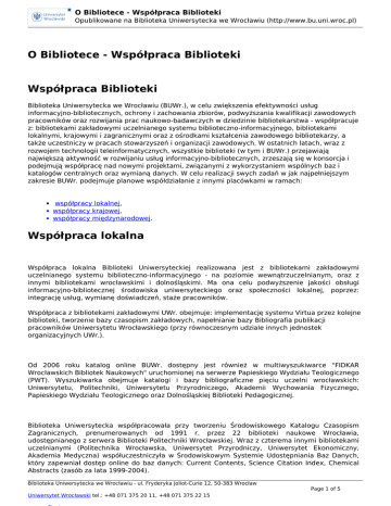 O Bibliotece - Współpraca Biblioteki Opublikowane na Biblioteka Uniwersytecka we Wrocławiu (http://www.bu.uni.wroc.pl) O Bibliotece - Współpraca Biblioteki Współpraca Biblioteki Biblioteka Uniwersytecka we Wrocławiu (BUWr.), w celu zwiększenia efektywności usług informacyjno-bibliotecznych, ochrony i zachowania zbiorów, podwyższania kwalifikacji zawodowych pracowników oraz rozwijania prac naukowo-badawczych w dziedzinie bibliotekarstwa - współpracuje z: bibliotekami zakładowymi uczelnianego systemu biblioteczno-informacyjnego, bibliotekami lokalnymi, krajowymi i zagranicznymi oraz z ośrodkami kształcenia zawodowego bibliotekarzy, a także uczestniczy w pracach stowarzyszeń i organizacji zawodowych. W ostatnich latach, wraz z rozwojem technologii teleinformatycznych, wszystkie biblioteki (w tym i BUWr.) przejawiają największą aktywność w rozwijaniu usług informacyjno-bibliotecznych, zrzeszają się w konsorcja i podejmują współpracę nad nowymi projektami, związanymi z wykorzystaniem wspólnych baz i katalogów centralnych oraz wymianą danych. W celu realizacji swych zadań w jak najpełniejszym zakresie BUWr. podejmuje planowe współdziałanie z innymi placówkami w ramach: współpracy lokalnej, współpracy krajowej, współpracy międzynarodowej. Współpraca lokalna Współpraca lokalna Biblioteki Uniwersyteckiej realizowana jest z bibliotekami zakładowymi uczelnianego systemu biblioteczno-informacyjnego - na poziomie wewnątrzuczelnianym, oraz z innymi bibliotekami wrocławskimi i dolnośląskimi. Ma ona celu podwyższenie jakości obsługi informacyjno-bibliotecznej środowiska uniwersyteckiego oraz społeczności lokalnej, poprzez: integrację usług, wymianę doświadczeń, staże pracowników. Współpraca z bibliotekami zakładowymi UWr. obejmuje: implementację systemu Virtua przez kolejne biblioteki, tworzenie bazy czasopism zakładowych, napełnianie bazy Bibliografia publikacji pracowników Uniwersytetu Wrocławskiego (przy równoczesnym udziale innych jednostek organizacyjnych UWr.). Od 2006 roku katalog online BUWr. dostępny jest również w multiwyszukiwarce "FIDKAR Wrocławskich Bibliotek Naukowych" uruchomionej na serwerze Papieskiego Wydziału Teologicznego (PWT). Wyszukiwarka obejmuje katalogi i bazy bibliograficzne pięciu uczelni wrocławskich: Uniwersytetu, Politechniki, Uniwersytetu Przyrodniczego, Akademii Wychowania Fizycznego, Papieskiego Wydziału Teologicznego oraz Dolnośląskiej Biblioteki Pedagogicznej. Biblioteka Uniwersytecka współpracowała przy tworzeniu Środowiskowego Katalogu Czasopism Zagranicznych, prenumerowanych od 1991 r. przez 22 biblioteki naukowe Wrocławia, udostępnianego z serwera Biblioteki Politechniki Wrocławskiej. Wraz z czterema innymi bibliotekami uczelnianymi (Politechnika Wrocławska, Uniwersytet Przyrodniczy, Uniwersytet Ekonomiczny, Akademia Medyczna) współuczestniczyła w Środowiskowym Systemie Udostępniania Baz Danych, który zapewniał dostęp online do baz danych: Current Contents, Science Citation Index, Chemical Abstracts (zasób za lata 1999-2004). Biblioteka Uniwersytecka we Wrocławiu - ul. Fryderyka Joliot-Curie 12, 50-383 Wrocław Uniwersytet Wrocławski tel.: +48 071 375 20 11, +48 071 375 22 15 Page 1 of 5 O Bibliotece - Współpraca Biblioteki Opublikowane na Biblioteka Uniwersytecka we Wrocławiu (http://www.bu.uni.wroc.pl) BUWr zawarła porozumienie z bibliotekami uczelni wrocławskich (Politechnika Wrocławska, Uniwersytet Przyrodniczy, Uniwersytet Ekonomiczny, Akademia Medyczna, Akademia Wychowania Fizycznego, Wyższa Szkoła Muzyczna, Akademia Sztuk Pięknych, Państwowa Wyższa Szkoła Teatralna, Wyższa Szkoła Oficerska), którego główną ideą jest koordynacja działań w zakresie udostępniania zbiorów. W myśl tego porozumienia pracownicy i studenci wymienionych uczelni wrocławskich mogą korzystać ze zbiorów bibliotek każdej z uczelni uczestniczącej w porozumieniu, na zasadach zbliżonych do obowiązujących użytkowników uczelni macierzystej. Ponadto, każdego roku Biblioteka Uniwersytecka podpisuje umowy o przedłużenie uprawnień do wypożyczeń z innymi wyższymi szkołami państwowymi (np. Wyższa Szkoła Zawodowa w Legnicy) oraz ze szkołami niepublicznymi. Współpraca lokalna bibliotek w zakresie gromadzenia zbiorów realizuje się także poprzez przekazywanie bibliotekom specjalnym w obrębie miasta i regionu - wyselekcjonowanych pozycji egzemplarza obowiązkowego, nie odpowiadających profilowi zbiorów Biblioteki Uniwersyteckiej. Współpraca z Biblioteką Ossolineum zasadza się głównie na wymianie doświadczeń związanych z eksploatacją systemu komputerowego VTLS/VIRTUA oraz współuczestniczeniu w tworzeniu centralnego krajowego katalogu online NUKAT. Obie biblioteki wymieniają doświadczenia w wielu innych dziedzinach, m.in. w zakresie konserwacji zbiorów specjalnych. Do Dolnośląskiej Biblioteki Publicznej - Bibliotekę Uniwersytecką zbliżają wspólne zainteresowanie piśmiennictwem regionalnym. W oparciu o wzajemne konsultacje w BUWr. tworzona jest m.in. baza danych, obejmująca dokumenty życia społecznego. Wszystkie biblioteki naukowe Wrocławia ściśle współpracują przy organizacji praktyk zawodowych związanych z awansami na stanowiska kustoszy. Współpraca z Instytutem Informacji Naukowej i Bibliotekoznawstwa UWr. realizuje się poprzez: - organizowanie praktyk zawodowych dla studentów, - aktywny udział pracowników BUWr. w procesach dydaktycznych - użyczanie zbiorów i pomieszczeń bibliotecznych do celów dydaktycznych - wspólne uczestniczenie w wykładach, prelekcjach oraz konferencjach. Pracownicy Biblioteki Uniwersyteckiej, jako autorzy referatów i prelekcji oraz jako słuchacze, uczestniczą w zebraniach Komisji Bibliotekoznawczej Wrocławskiego Towarzystwa Naukowego oraz czynnie udzielają się w Oddziale Wrocławskim Polskiego Towarzystwa Bibliologicznego. Efekty współpracy: - Katalog komputerowy w s