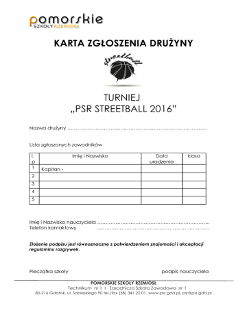 karta zgłoszenia drużyny turniej „psr streetball 2016”