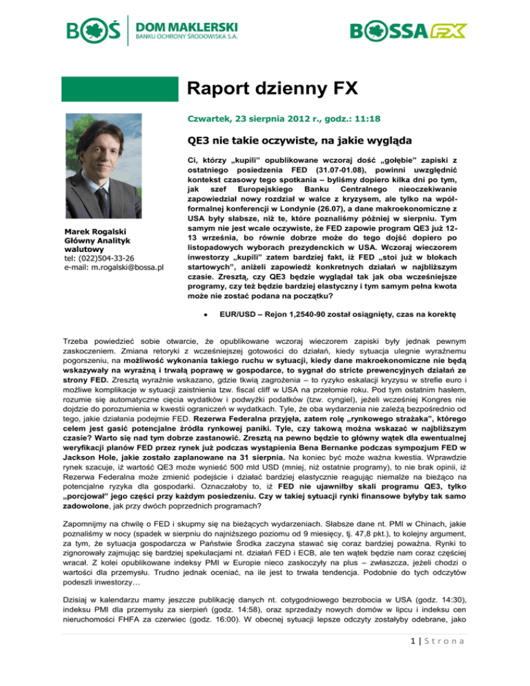 Raport dzienny FX Czwartek, 23 sierpnia 2012 r., godz.: 11:18 QE3 nie takie oczywiste, na jakie wygląda Marek Rogalski GG Główny Analityk walutowy tel: (022)504-33-26 e-mail: [email protected] Ci, którzy „kupili” opublikowane wczoraj dość „gołębie” zapiski z ostatniego posiedzenia FED (31.07-01.08), powinni uwzględnić kontekst czasowy tego spotkania – byliśmy dopiero kilka dni po tym, jak szef Europejskiego Banku Centralnego nieoczekiwanie zapowiedział nowy rozdział w walce z kryzysem, ale tylko na wpółformalnej konferencji w Londynie (26.07), a dane makroekonomiczne z USA były słabsze, niż te, które poznaliśmy później w sierpniu. Tym samym nie jest wcale oczywiste, że FED zapowie program QE3 już 1213 września, bo równie dobrze może do tego dojść dopiero po listopadowych wyborach prezydenckich w USA. Wczoraj wieczorem inwestorzy „kupili” zatem bardziej fakt, iż FED „stoi już w blokach startowych”, aniżeli zapowiedź konkretnych działań w najbliższym czasie. Zresztą, czy QE3 będzie wyglądał tak jak oba wcześniejsze programy, czy też będzie bardziej elastyczny i tym samym pełna kwota może nie zostać podana na początku? EUR/USD – Rejon 1,2540-90 został osiągnięty, czas na korektę Trzeba powiedzieć sobie otwarcie, że opublikowane wczoraj wieczorem zapiski były jednak pewnym zaskoczeniem. Zmiana retoryki z wcześniejszej gotowości do działań, kiedy sytuacja ulegnie wyraźnemu pogorszeniu, na możliwość wykonania takiego ruchu w sytuacji, kiedy dane makroekonomiczne nie będą wskazywały na wyraźną i trwałą poprawę w gospodarce, to sygnał do stricte prewencyjnych działań ze strony FED. Zresztą wyraźnie wskazano, gdzie tkwią zagrożenia – to ryzyko eskalacji kryzysu w strefie euro i możliwe komplikacje w sytuacji zaistnienia tzw. fiscal cliff w USA na przełomie roku. Pod tym ostatnim hasłem, rozumie się automatyczne cięcia wydatków i podwyżki podatków (tzw. cyngiel), jeżeli wcześniej Kongres nie dojdzie do porozumienia w kwestii ograniczeń w wydatkach. Tyle, że oba wydarzenia nie zależą bezpośrednio od tego, jakie działania podejmie FED. Rezerwa Federalna przyjęła, zatem rolę „rynkowego strażaka”, którego celem jest gasić potencjalne źródła rynkowej paniki. Tyle, czy takową można wskazać w najbliższym czasie? Warto się nad tym dobrze zastanowić. Zresztą na pewno będzie to główny wątek dla ewentualnej weryfikacji planów FED przez rynek już podczas wystąpienia Bena Bernanke podczas sympozjum FED w Jackson Hole, jakie zostało zaplanowane na 31 sierpnia. Na koniec być może ważna kwestia. Wprawdzie rynek szacuje, iż wartość QE3 może wynieść 500 mld USD (mniej, niż ostatnie programy), to nie brak opinii, iż Rezerwa Federalna może zmienić podejście i działać bardziej elastycznie reagując niemalże na bieżąco na potencjalne ryzyka dla gospodarki. Oznaczałoby to, iż FED nie ujawniłby skali programu QE3, tylko „porcjował” jego części przy każdym posiedzeniu. Czy w takiej sytuacji rynki finansowe byłyby tak samo zadowolone, jak przy dwóch poprzednich programach? Zapomnijmy na chwilę o FED i skupmy się na bieżących wydarzeniach. Słabsze dane nt. PMI w Chinach, jakie poznaliśmy w nocy (spadek w sierpniu do najniższego poziomu od 9 miesięcy, tj. 47,8 pkt.), to kolejny argument, za tym, że sytuacja gospodarcza w Państwie Środka zaczyna stawać się coraz bardziej poważna. Rynki to zignorowały zajmując się bardziej spekulacjami nt. działań FED i ECB, ale ten wątek będzie nam coraz częściej wracał. Z kolei opublikowane indeksy PMI w Europie nieco zaskoczyły na plus – zwłaszcza, jeżeli chodzi o wartości dla przemysłu. Trudno jednak oceniać, na ile jest to trwała tendencja. Podobnie do tych odczytów podeszli inwestorzy… Dzisiaj w kalendarzu mamy jeszcze publikację danych nt. cotygodniowego bezrobocia w USA (godz. 14:30), indeksu PMI dla przemysłu za sierpień (godz. 14:58), oraz sprzedaży nowych domów w lipcu i indeksu cen nieruchomości FHFA za czerwiec (godz. 16:00). W obecnej sytuacji lepsze odczyty zostałyby odebrane, jako 1|Strona sygnał pewnego spadku prawdopodobieństwa zaistnienia QE3 i dolar mógłby nieco zyskać (chociaż z drugiej strony pytanie, co członkowie FED rozumieją pod hasłem „braku wyraźnej i trwałej poprawy”). Kluczowe dzisiaj mogą okazać się jednak informacje z Europy. Dzisiejszy niemiecki „Die Welt” wraca do tajemniczego planu ECB dotyczącego założeń potencjalnych interwencji na rynku długu, co sprawia, że plotka zainicjowana w weekend przez Der Spiegel, ma już własne życie – to zmieni się dopiero 6 września, kiedy to zaplanowano posiedzenie ECB. Uwaga rynków koncentruje się jednak na Grecji. Wprawdzie wczoraj Angela Merkel dała do zrozumienia, iż zaplanowane na piątek spotkanie z greckim premierem nie będzie wiążące, gdyż kluczowy dla oceny działań wobec Grecji, będzie raport ekspertów Troiki, który poznamy 8 października, to rynki odebrały to jako sygnał, iż Europa nie zamyka drzwi przed Samarasem i jest gotowa szukać z Grekami kolejnego kompromisu. Dzisiaj mamy kluczowe spotkanie w Berlinie – Angeli Merkel i Francois Hollande’a. Jeżeli rynki po raz kolejny zobaczą, iż Niemcy zaczynają mówić wspólnym językiem z Francją (nieważne, iż będą to głównie „dyplomatyczne farmazony”), to będzie to dobra informacja. Tyle, czy na taką nie liczą? Oznacza to, że pomału zaczynamy dojrzewać do większej korekty. EUR/USD – Rejon 1,2540-90 został osiągnięty, czas na korektę O okolicach 1,2540-90, jako istotnej strefie oporu pisałem w ostatnich komentarzach. W okolicach 1,2590 przebiega też górne ograniczenie kanału wzrostowego w którym poruszamy się od końca lipca. Potencjalna korekta, która powinna się rozwinąć w najbliższych dniach nie powinna zejść, głębiej niż rejon 1,2355-88. Dodatkowo w rejonie