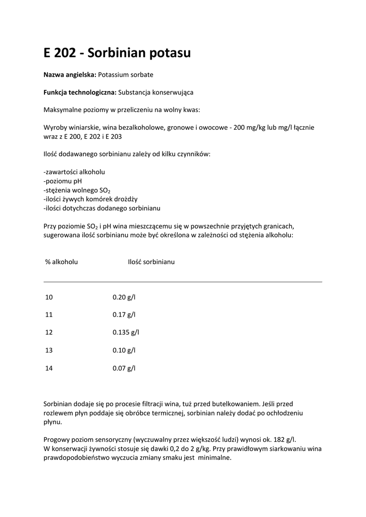 E 202 - Sorbinian potasu Nazwa angielska: Potassium sorbate Funkcja technologiczna: Substancja konserwująca Maksymalne poziomy w przeliczeniu na wolny kwas: Wyroby winiarskie, wina bezalkoholowe, gronowe i owocowe - 200 mg/kg lub mg/l łącznie wraz z E 200, E 202 i E 203 Ilość dodawanego sorbinianu zależy od kilku czynników: -zawartości alkoholu -poziomu pH -stężenia wolnego SO2 -ilości żywych komórek drożdży -ilości dotychczas dodanego sorbinianu Przy poziomie SO2 i pH wina mieszczącemu się w powszechnie przyjętych granicach, sugerowana ilość sorbinianu może być określona w zależności od stężenia alkoholu: % alkoholu Ilość sorbinianu 10 0.20 g/l 11 0.17 g/l 12 0.135 g/l 13 0.10 g/l 14 0.07 g/l Sorbinian dodaje się po procesie filtracji wina, tuż przed butelkowaniem. Jeśli przed rozlewem płyn poddaje się obróbce termicznej, sorbinian należy dodać po ochłodzeniu płynu. Progowy poziom sensoryczny (wyczuwalny przez większość ludzi) wynosi ok. 182 g/l. W konserwacji żywności stosuje się dawki 0,2 do 2 g/kg. Przy prawidłowym siarkowaniu wina prawdopodobieństwo wyczucia zmiany smaku jest minimalne.