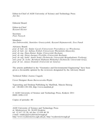 Editor-in-Chief of AGH University of Science and Technology Press Jan Sas Editorial Board: Editor-in-Chief Ryszard Hycner Secretary Piotr Parzych Members: Jan Dobrowolski, Stanis³aw Gruszczyñski, Ryszard Hejmanowski, Ewa Panek Advisory Board: prof. dr hab. in¿. Stefan Cacoñ (Uniwersytet Przyrodniczy we Wroc³awiu), prof. dr hab. in¿. Sabina róbek (Uniwersytet Warmiñsko-Mazurski), prof. dr.-ing. Hans-Rainer Kulpe (Universität Bochum), prof. dr.-ing. Heinz-Juergen Przybilla (Universität Bochum), prof. dr.-ing. habil. Anton Sroka (Technische Universität Bergakademie Freiberg), univ.-prof. dr. techn. Bernhard Hofmann-Wellenhof (Technische Universität Graz), prof. dr in¿. Janusz Dominik (Université de Genève) The articles published in the “Geomatics and Environmental Engineering” have been given a favourable opinion by the reviewers designated by the Advisory Board Technical Editor Joanna Ci¹ga³a Cover Designer Beata Barszczewska-Wojda Typesetting and Desktop Publishing by MarDruk, Marcin Herzog tel. +48-602-130-104, http://www.mardruk.pl © AGH University of Science and Technology Press, Krakow 2011 ISSN 1898-1135 Copies of periodic: 80 AGH University of Science and Technology Press al. Mickiewicza 30, 30-059 Kraków tel. 12 617 32 28, tel./fax 12 638 40 38 e-mail: [email protected] http://www.wydawnictwa.agh.edu.pl, http://wydawnictwoagh.pl