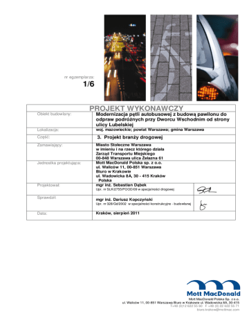 nr egzemplarza: 1/6 PROJEKT WYKONAWCZY Obiekt budowlany: Modernizacja pętli autobusowej z budową pawilonu do odpraw podróżnych przy Dworcu Wschodnim od strony ulicy Lubelskiej Lokalizacja: woj. mazowieckie; powiat Warszawa; gmina Warszawa Część: 3. Projekt branży drogowej Zamawiający: Miasto Stołeczne Warszawa w imieniu i na rzecz którego działa Zarząd Transportu Miejskiego 00-848 Warszawa ulica Żelazna 61 Mott MacDonald Polska sp. z o.o. ul. Waliców 11, 00-851 Warszawa Biuro w Krakowie ul. Wadowicka 8A, 30 - 415 Kraków Polska mgr inż. Sebastian Dąbek Jednostka projektująca: Projektował: Upr. nr SLK/2755/POOD/09 w specjalności drogowej Sprawdził: mgr inż. Dariusz Kopczyński Upr. nr 328/Gd/2002 w specjalności konstrukcyjno - budowlanej Data: Kraków, sierpień 2011 Mott MacDonald Polska Sp. z o.o. ul. Waliców 11, 00-851 Warszawa Biuro w Krakowie ul. Wadowicka 8A, 30-415 T+48 (0)12 622 55 60 F +48 (0) 22 622 55 71 [email protected] Modernizacja pętli autobusowej z budową pawilonu do odpraw podróżnych przy Dworcu Wschodnim od strony ul. Lubelskiej Spis zawartości I. Opis techniczny 1. 1.1. 1.2. 1.3. WSTĘP ..............................................................................................................................3 Przedmiot opracowania.......................................................................................................3 Podstawa opracowania.......................................................................................................3 Cel i zakres opracowania....................................................................................................3 2. OPIS STANU ISTNIEJĄCEGO ........................................................................................4 3. 3.1. 3.2. 3.3. 3.4. ROBOTY PRZYGOTOWAWCZE .....................................................................................4 Wytyczenie geodezyjne ......................................................................................................4 Usunięcie drzew i krzewów .................................................................................................5 Zdjęcie warstwy humusu.....................................................................................................5 Rozbiórki ............................................................................................................................5 4. 4.1. 4.2. 4.3. 4.4. ROZWIĄZANIA PROJEKTOWE......................................................................................5 Rozwiązania sytuacyjne......................................................................................................5 Rozwiązania wysokościowe................................................................................................6 Konstrukcja nawierzchni .....................................................................................................6 Przekroje normalne i szczegóły konstrukcyjne ....................................................................8 5. OZNAKOWANIE I URZĄDZENIA BEZPIECZEŃSTWA RUCHU...................................9 II. Część rysunkowa Rys. 1 Plan orientacyjny Rys. 2 Plan sytuacyjny Rys. 3 Przekrój podłużny Rys. 4 Przekroje normalne Rys. 5 Szczegóły konstrukcyjne Rys. 6 Przekroje poprzeczne – ul. Lubelska Rys. 7 Przekroje poprzeczne – pętla autobusowa Rys. 8 Plan warstwicowy Rys. 9 Plan wytyczeniowy Część 3, Projekt Wykonawczy, projekt branży drogowej 1 Modernizacja pętli autobusowej z budową pawilonu do odpraw podróżnych przy Dworcu Wschodnim od strony ul. Lubelskiej I. OPIS TECHNICZNY Część 3, Projekt Wykonawczy, projekt branży drogowej 2 Modernizacja pętli autobusowej z budową pawilonu do odpraw podróżnych przy Dworcu Wschodnim od strony ul. Lubelskiej 1. WSTĘP 1.1. Przedmiot opracowania Przedmiotem niniejszego opracowania jest projekt wykonawczy przebudowy układu drogowego, oraz pętli autobusowej przy Dworcu Wschodnim w obrębie ulic Lubelskiej, Skaryszewskiej, Bliskiej. 1.2. Podstawa opracowania Podstawą formalną jest umowa dnia 25 grudnia 2011 roku nr 64/2010 zawarta pomiędzy Miastem Stołecznym Warszawa, w imieniu i na rzecz, którego działa na podstawie udzielonych pełnomocnictw Zarząd Transportu Miejskiego z siedzibą w (00-848) Warszawa ul. Żelazna 61 a Mott MacDonald Polska Sp. z o.o. z siedzibą w warszawie; ul. Waliców 11; 00-851 Warszawa. 1.2.1. Przepisy, oraz dokumentacje archiwalne - Ustawa z dnia 7 lipca 1994 r. Prawo budowlane, Dz. U. Nr 207 poz. 2016 z 2003 z późniejszymi zmianami, - Rozporządzenie Ministra Transportu i Gospodarki Morskiej z dnia 2 marca 1999r w sprawie warunków technicznych, jakim powinny odpowiadać drogi publiczne i ich usytuowanie (Dz. U. Nr 43 poz. 430 z dnia 14 maja 1999r.) - Rozporządzenie Ministra Infrastruktury z dnia 3 lipca 2003 w sprawie szczegółowego zakresu i formy projektu budowlanego (Dz. U nr 120, poz. 1133), - Rozporządzenia Ministra Infrastruktury z 23 czerwca 2003 r. w sprawie informacji dotyczącej bezpieczeństwa i ochrony zdrowia oraz planu bezpieczeństwa i ochrony zdrowia (Dz. U nr 120, poz. 1126), - Koncepcja programowo-przestrzenna pętli autobusowej i pawilonu do odpraw podróżnych wraz z rozwiązaniem geometrii układu komunikacyjnego w jej bezpośrednim sąsiedztwie oraz wykonanie docelowej organizacji ruchu na obszarze inwestycji pn. „Modernizacja pętli autobusowej z budową pawilonu do odpraw podróżnych przy Dworcu Wschodnim od strony ul. Lubelskiej” - 1.3. Obowiązujące normy,. Cel i zakres opracowania Celem niniejszego opracowania jest uzupełnienie informacji przekazanych na rysunkach i w szczegółowych specyfikacjach technicznych w celu umożliwienia Wykonawcy realizacji inwestycji w zakresie robót drogowych. Ponadto opis ten jest uzupełnieniem opisu z projektu zagospodarowania terenu, oraz opisu z projektu architektoniczno – budowlanego. Część 3, Projekt Wykonawczy, projekt branży drog