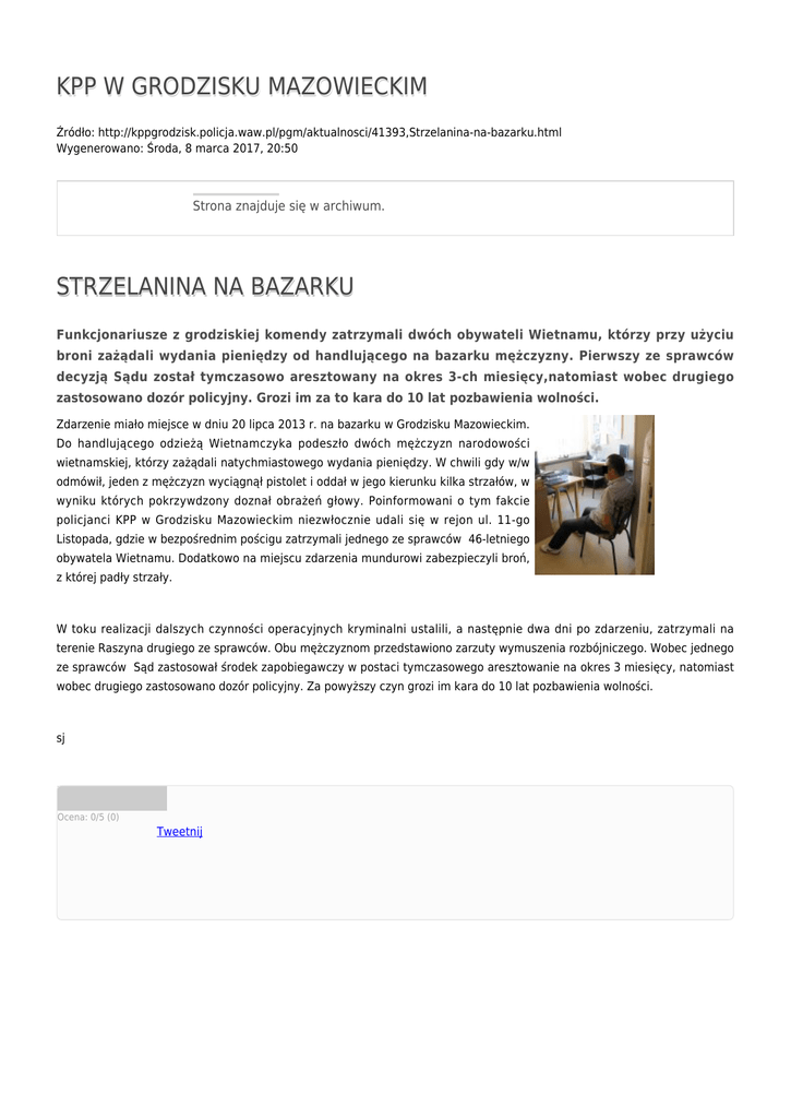 KPP W GRODZISKU MAZOWIECKIM Źródło: http://kppgrodzisk.policja.waw.pl/pgm/aktualnosci/41393,Strzelanina-na-bazarku.html Wygenerowano: Środa, 8 marca 2017, 20:50 Strona znajduje się w archiwum. STRZELANINA NA BAZARKU Funkcjonariusze z grodziskiej komendy zatrzymali dwóch obywateli Wietnamu, którzy przy użyciu broni zażądali wydania pieniędzy od handlującego na bazarku mężczyzny. Pierwszy ze sprawców decyzją Sądu został tymczasowo aresztowany na okres 3-ch miesięcy,natomiast wobec drugiego zastosowano dozór policyjny. Grozi im za to kara do 10 lat pozbawienia wolności. Zdarzenie miało miejsce w dniu 20 lipca 2013 r. na bazarku w Grodzisku Mazowieckim. Do handlującego odzieżą Wietnamczyka podeszło dwóch mężczyzn narodowości wietnamskiej, którzy zażądali natychmiastowego wydania pieniędzy. W chwili gdy w/w odmówił, jeden z mężczyzn wyciągnął pistolet i oddał w jego kierunku kilka strzałów, w wyniku których pokrzywdzony doznał obrażeń głowy. Poinformowani o tym fakcie policjanci KPP w Grodzisku Mazowieckim niezwłocznie udali się w rejon ul. 11-go Listopada, gdzie w bezpośrednim pościgu zatrzymali jednego ze sprawców 46-letniego obywatela Wietnamu. Dodatkowo na miejscu zdarzenia mundurowi zabezpieczyli broń, z której padły strzały. W toku realizacji dalszych czynności operacyjnych kryminalni ustalili, a następnie dwa dni po zdarzeniu, zatrzymali na terenie Raszyna drugiego ze sprawców. Obu mężczyznom przedstawiono zarzuty wymuszenia rozbójniczego. Wobec jednego ze sprawców Sąd zastosował środek zapobiegawczy w postaci tymczasowego aresztowanie na okres 3 miesięcy, natomiast wobec drugiego zastosowano dozór policyjny. Za powyższy czyn grozi im kara do 10 lat pozbawienia wolności. sj Ocena: 0/5 (0) Tweetnij