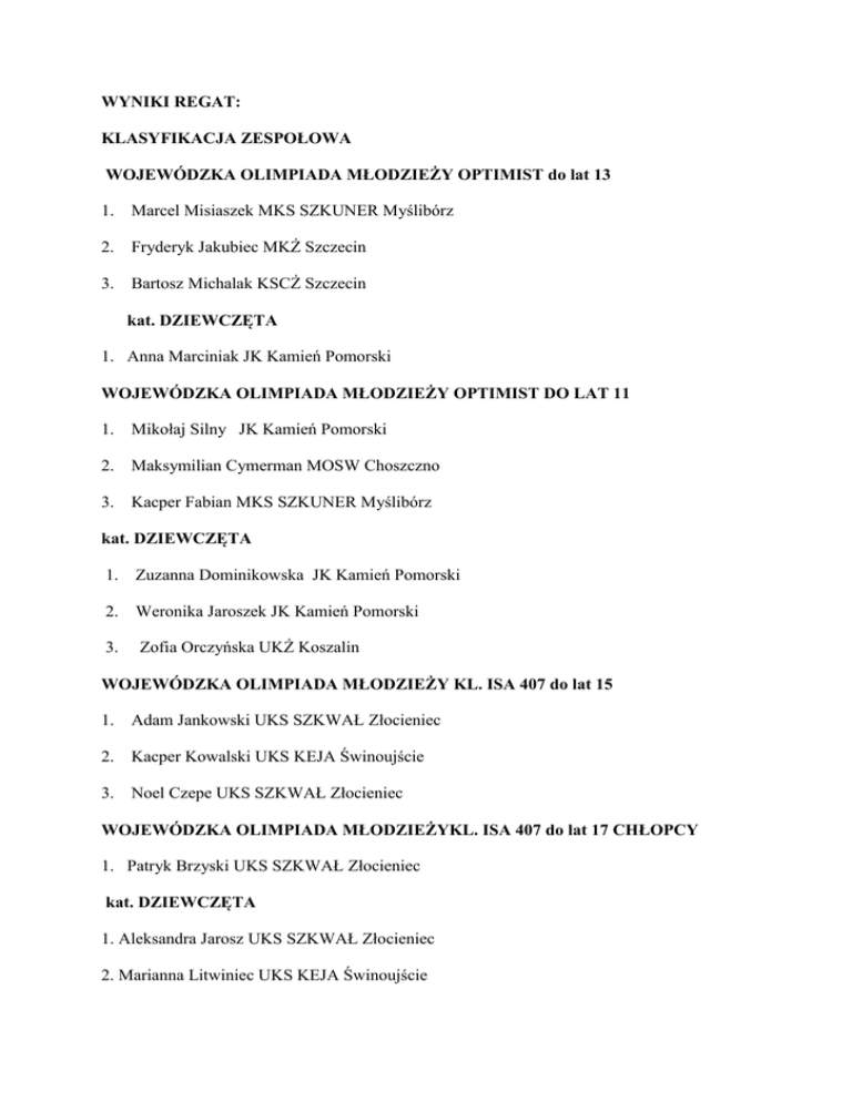 WYNIKI REGAT: KLASYFIKACJA ZESPOŁOWA WOJEWÓDZKA OLIMPIADA MŁODZIEŻY OPTIMIST do lat 13 1. Marcel Misiaszek MKS SZKUNER Myślibórz 2. Fryderyk Jakubiec MKŻ Szczecin 3. Bartosz Michalak KSCŻ Szczecin kat. DZIEWCZĘTA 1. Anna Marciniak JK Kamień Pomorski WOJEWÓDZKA OLIMPIADA MŁODZIEŻY OPTIMIST DO LAT 11 1. Mikołaj Silny JK Kamień Pomorski 2. Maksymilian Cymerman MOSW Choszczno 3. Kacper Fabian MKS SZKUNER Myślibórz kat. DZIEWCZĘTA 1. Zuzanna Dominikowska JK Kamień Pomorski 2. Weronika Jaroszek JK Kamień Pomorski 3. Zofia Orczyńska UKŻ Koszalin WOJEWÓDZKA OLIMPIADA MŁODZIEŻY KL. ISA 407 do lat 15 1. Adam Jankowski UKS SZKWAŁ Złocieniec 2. Kacper Kowalski UKS KEJA Świnoujście 3. Noel Czepe UKS SZKWAŁ Złocieniec WOJEWÓDZKA OLIMPIADA MŁODZIEŻYKL. ISA 407 do lat 17 CHŁOPCY 1. Patryk Brzyski UKS SZKWAŁ Złocieniec kat. DZIEWCZĘTA 1. Aleksandra Jarosz UKS SZKWAŁ Złocieniec 2. Marianna Litwiniec UKS KEJA Świnoujście MISTRZOSTWA OKRĘGU WOJEWÓDZTWA ZACHODNIOPOMORSKIEGO KLASA OPTIMIST GR A kat. CHŁOPCY 1. Remigiusz Zgrych JK Kamień Pomorski 2. Jakub Cymerman MOSW Choszczno 3. Emil Kojszewski MKS SZKUNER Myślibórz kat. DZIEWCZĘTA 1. Aleksandra Jasińska UKS Barnim Goleniów 2. Alicja Szyptur UKS Barnim Goleniów 3. Daria Stachańska MOSW Choszczno MISTRZOSTWA OKRĘGU WOJEWÓDZTWA ZACHODNIOPOMORSKIEGO KLASA ISA 407 1. Adam Jankowski UKS SZKWAŁ Złocieniec 2. Patryk Brzyski UKS SZKWAŁ Złocieniec 3. Kacper Kowalski UKS KEJA Świnoujście kat. DZIEWCZĘTA 1. Adrianna Miller UKS KEJA Świnoujście 2. Aleksandra Jarosz UKS SZKWAŁ Złocieniec 3. Marianna Litwiniec UKS KEJA Świnoujście XIII OGÓLNOPOLSKIE REGATY O PUCHAR ZIEMI ZŁOCIENIECKIEJ KLASA OPTIMIST GR A kat. CHŁOPCY 1. Remigiusz Zgrych JK Kamień Pomorski 2. Jakub Cymerman MOSW Choszczno 3. Emil Kojszewski MKS SZKUNER Myślibórz kat. DZIEWCZĘTA 1. Aleksandra Jasińska UKS Barnim Goleniów 2. Alicja Szyptur UKS Barnim Goleniów 3. Daria Stachańska MOSW Choszczno XIII OGÓLNOPOLSKIE REGATY O PUCHAR ZIEMI ZŁOCIENIECKIEJ KLASA OPTIMIST GR B do lat 12 kat. CHŁOPCY 1. Maksymilian Cymerman MOSW Choszczno 2. Mikołaj Silny JK Kamień Pomorski 3. Marcel Misiaszek MKS SZKUNER Myślibórz kat. DZIEWCZĘTA 1. Karolina Ignaciuk Zatoka Puck 2. Zuzanna Dominikowska JK Kamień Pomorski 3. Weronika Jaroszek JK Kamień Pomorski XIII OGÓLNOPOLSKIE REGATY O PUCHAR ZIEMI ZŁOCIENIECKIEJ KLASA ISA 407 OGÓLNA 1. Adrianna Miller UKS KEJA Świnoujście 2. Kacper Wysocki YK STAL GDYNIA 3. Aleksandra Jarosz UKS SZKWAŁ Złocieniec XIII OGÓLNOPOLSKIE REGATY O PUCHAR ZIEMI ZŁOCIENIECKIEJ KLASA ISA 407 kat. DZIEWCZĄT 1. Adrianna Miller UKS KEJA Świnoujście 2. Aleksandra Jarosz UKS SZKWAŁ Złocieniec 3. Marianna Litwiniec UKS KEJA Świnoujście XIII OGÓLNOPOLSKIE REGATY O PUCHAR ZIEMI ZŁOCIENIECKIEJ LASER 4,7 kat. CHŁOPCY 1. Adam Towarzyński KSCŻ Szczecin 2. Tomasz Kastrau KSCŻ Szczecin 3. Przemysław Grządziela KSCŻ Szczecin DZIEWCZĄT LASER 4,7 1. Diana Tchurzewska KSCŻ Szczecin