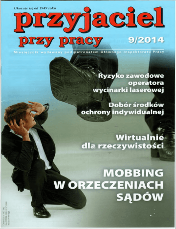 Ukazuje się od 1949 roku x Ryzyko zawodowe operatora wycinarki laserowej Dobór środków ochrony indywidualnej Cena 13,65 zł (VAT5%) Ind 371548- ISSN 0137-8368 Nakład: 4 000 egz. Wirtualnie dla rzeczywistości MOBBING W ORZECZENIACH SĄDÓW M iesięcznik ilustrowany poświęcony ochronie czło w ieka w śro d o w isku p racy, z a le ca n y p rzez Radę Ochrony Pracy przy Sejmie Rzeczypospolitej Polskiej, Ministerstwo Pracy i Polityki Społecznej oraz Główny Inspektorat Pracy PIP jako podstawowa lektura dla społecznych inspektorów pracy wszystkich szczebli, Laureat nagrody im. Haliny Krahelskiej członków zakładowych komisji ochrony pracy, pra cowników służby bhp oraz pracodawców. W numerze 9 (765) - wrzesień 2014: ■ KOMENTARZ PRZYJACIELA Dyskomfort i s tra ty .................... ■ WYWIAD Wirtualnie dla rzeczywistości Kolegium Redakcyjne „Przyjaciela przy Pracy7': Ryszard Celeda - SOP Wiktor Leszczyński - Departament Prawa Pracy w MPiPS, Andrzej Nowak - OSPSBHP, Halina Tulwin - dyrektor Departamentu Prawnego GIP, Zygmunt Wieczorek - Główny Specjalista GIP, ferzy Wroński - SOP, Barbara Rudniewska - redaktor naczelny, Przewodniczący Kolegium - Krzysztof Dutkiewicz. ■ PRAWO Pojęcie mobbingu na tle wybranych orzeczeń sądów polskich........................................................................................8 # ■ BHP W PRAKTYCE Dobór środków ochrony indywidualnej - zagadnienie znane, ale czy do końca? (cz. 1) .................. 10 Zabezpieczanie pracowników przed zagrożeniami wynikającymi z wyładowania łuku elektrycznego .......... 12 Menedżerowie też powinni budować kulturę bezpieczeństwa.................................................................. 18 ■ RYZYKO ZAWODOWE Ocena ryzyka zawodowego dla prac wykonywanych przez operatora wycinarki laserow ej...................................... 15 ■ ZARZĄDZANIE BHP Skład zespołu redakcyjnego: Barbara Rudniewska - redaktor naczelny, Kazimierz Siamecki - komentator, Konrad Rudniewski - wydawca (e-mail: [email protected], tel. kom. 601 21 31 91). Adres redakcji: 02-936 Warszawa, ul. św. Bonifacego 74 lok. 22 tel./fax: 22 842 37 91, e-mail: [email protected] Teksty o objętości do 15 tys. znaków i zdjęcia o rozdzielczości co najmniej 1600 x 1200 pix. można przesyłać drogą elektroniczną lub na płytach CD Redakcja zastrzega sobie prawo skracania i redagowania nadesłanych materiałów. Publikacje, przedruk artykułów bez uzyskania zgody wydawcy - zabronione. Wydawnictwo: Agencja Wydawnicza BEHAPRESS - adres i telefon - jak wyżej. Ogłoszenia i reklamy: e-mail: reklama@przyjacielprzypracypl Konrad Rudniewski, tel. kom. 601 21 31 91 Za treść ogłoszeń wydawnictwo nie ponosi odpowiedzialności. Behawioralne zarządzanie bezpieczeństwem jako skuteczna metoda ograniczenia liczby wypadków w organizacji (cz. 2 ) ............................................................................21 R E K L A M A WIELOFUNKCYJNY I BEZPIECZNY? CAŁKOWICIE BEZPIECZNY! ■ NA SALI SĄDOWEJ Rozpoznanie w granicach zaskarżenia................................... 24 ■ WYPADKI Zatrucie w stu dzience..................................................................... 26 Konsekwencje nieprawidłowej obsługi to karek............... 28 M AXISAFE NR 101899 ■ AKTUALNOŚCI Nóż bezpieczny z Relacje i zapow iedzi..........................................................................30 automatyczr a chowającym się ostrzerr Idealny do cięcia fo lii i k a n o "_ www.ronox.pl | 71 781 56 30 ■ PRZYJACIEL RADZI I O D PO W IA D A ...................................... 34 NOŻE BEZPIECZNE Zdjęcie na okładce: ©iStockphoto/Peoplelmages OSTRZA T E C H N IC Z N E <m -m w w w .p rz y ja c ie lp rz y p ra c y .p l