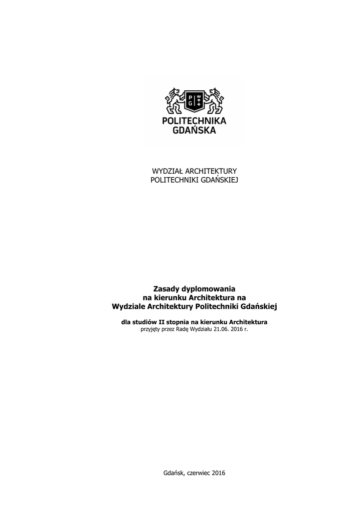 WYDZIAŁ ARCHITEKTURY POLITECHNIKI GDAŃSKIEJ Zasady dyplomowania na kierunku Architektura na Wydziale Architektury Politechniki Gdańskiej dla studiów II stopnia na kierunku Architektura przyjęty przez Radę Wydziału 21.06. 2016 r. Gdańsk, czerwiec 2016 Zasady dyplomowania dla studiów II stopnia na kierunku Architektura na Wydziale Architektury Politechniki Gdańskiej Spis treści I. Uwagi wstępne II. Zasady ogólne III. Zapisy końcowe Załączniki: 1. Lista osób uprawnionych do prowadzenia prac dyplomowych na studiach II stopnia w danym roku akademickim. 2. Lista osób uprawnionych do udzielania konsultacji przy projektach dyplomowych na studiach II stopnia w danym roku akademickim. 3. Karta gotowości do obrony pracy dyplomowej magisterskiej i oświadczenie o przestrzeganiu praw autorskich – studia II stopnia. 4. Protokół komisji ustnego egzaminu dyplomowego. 5. Protokół komisji obrony pracy dyplomowej. 6. Wniosek o wydanie dodatkowego odpisu dyplomu w języku obcym. 7. Wniosek o wydanie dodatkowego odpisu suplementu do dyplomu w tłumaczeniu na język angielski. 2 Zasady dyplomowania dla studiów II stopnia na kierunku Architektura na Wydziale Architektury Politechniki Gdańskiej I Uwagi wstępne §1 Praca dyplomowa i egzamin dyplomowy. Praca dyplomowa i egzamin dyplomowy na studiach II stopnia po spełnieniu warunków towarzyszących (zgodnie z obowiązującym programem studiów oraz szczegółowymi zasadami rejestracji na kolejne semestry obowiązującymi na Wydziale Architektury PG), są podstawą do uzyskania dyplomu ukończenia studiów i nadania tytułu zawodowego magister inżynier architekt (mgr inż. arch.). Podstawą wymagań merytorycznych i formalnych stawianych pracom dyplomowym są obowiązujące standardy kształcenia na kierunku Architektura (Rozporządzenie Ministra Nauki i Szkolnictwa Wyższego z dnia 29 września 2011 w sprawie standardów kształcenia dla kierunków studiów weterynarii i architektury). II Zasady ogólne §2 Przedmiot pracy dyplomowej. Przedmiotem pracy dyplomowej na studiach II stopnia jest projekt architektoniczny lub urbanistyczny o złożonej problematyce, opracowany w zakresie właściwym dla projektu koncepcyjnego, pozwalający na dokonanie oceny pracy zgodnie z następującymi grupami kryteriów: • sytuacja, kontekst, uwarunkowania środowiskowe (przyrodnicze, społeczno-kulturowe, krajobrazowe), • rozwiązania programowo - funkcjonalne, • rozwiązania przestrzenne, kompozycyjne, • rozwiązania techniczne, ekonomiczne, prawne. §3 Zakres pracy. Praca dyplomowa na studiach II stopnia zawiera: • część opisową: studium problemu – 10-15 stron tekstu (40-60 tys. znaków + ew. ilustracje), opis koncepcji projektowej, • część projektową: 8 - 10 plansz rysunkowych 100/70cm (w tym min.2 plansze z rozwiązaniami problematyki urbanistycznej dla dyplomów architektonicznych i min 2 plansze z rozwiązaniami problematyki architektonicznej dla dyplomów urbanistycznych), model lub wizualizacja. §4 Temat pracy dyplomowej. Temat pracy dyplomowej na studiach II stopnia powinien być zgodny z programem studiów i może być zaproponowany przez dyplomanta lub wskazany przez promotora. Temat pracy dyplomowej powinien być realizowany przez jedną osobę. Dopuszcza się wspólne prace dyplomowe (2 osoby), jednak zakres pracy każdego dyplomanta zarówno w części teoretycznej jak i projektowej pracy musi zostać ściśle określony. W tej sytuacji, za zgodą dziekana, obowiązki promotora mogą zostać powierzone 2 osobom. §5 Wybór promotora. Lista osób uprawnionych do prowadzenia prac dyplomowych podana jest do wiadomości studentów. (załącznik nr 1) Student wybiera promotora w ramach katedry, do której został przyjęty na sem. II. §6 Czas pracy. Student podejmuje temat pracy dyplomowej na II sem. Praca nad częścią projektową rozpoczyna się z początkiem semestru III i trwa jeden semestr. §7 3 Zasady dyplomowania dla studiów II stopnia na kierunku Architektura na Wydziale Architektury Politechniki Gdańskiej Konsultacje. Praca dyplomowa na studiach II stopnia wymaga uzgodnień z trzema specjalistami z dziedzin najbardziej istotnych dla wybranego tematu pracy. Korekty konsultantów (załącznik nr 2) wpisane są do karty gotowości do obrony pracy dyplomowej magisterskiej (załącznik nr 3). §8 Warunki dopuszczenia do egzaminu dyplomowego. Warunkiem dopuszczenia do egzaminu dyplomowego na studiach II stopnia jest zaliczenie całego programu studiów magisterskich (oceny udokumentowane na platformie Moja PG) oraz złożenie w dziekanacie następujących materiałów i dokumentów: • oryginał zaświadczenia o odbyciu miesięcznej praktyki przeddyplomowej, • wypełniona karta gotowości do obrony pracy dyplomowej magisterskiej z oświadczeniem o przestrzeganiu praw autorskich (załącznik nr 3), • projekt dyplomowy, wykonany w czytelnej technice graficznej, na sztywnych podkładach, • 2 egzemplarze zeszytu dyplomowego (parafowanego przez promotora na stronie tytułowej) zawierającego plansze graficzne pomniejszone do formatu A-3, złożone do formatu A-4 i spięte z obustronnie wydrukowaną częścią opisową (studium problemu i opis koncepcji projektowej - 1 egzemplarz zeszytu wywiesza się przy planszach), • opinia promotora, • 2 płyty CD-ROM zawierające plansze zapisane w formacie JPG lub PDF, • 4 zdjęcia (4,5 cm x 6,5 cm), • dowód opłaty za wydanie dyplomu. §9 Recenzowanie pracy dyplomowej. Pracę dyplomową na studiach II stopnia ocenia recenzent spoza katedry dyplomującej, wybrany z listy osób uprawnionych do dyplomowania. Po przedstawieniu pracy recenzentowi praca dyplomowa nie może być uzupełniana lub poprawiana. Pisemną recenzję recenzent składa w dziekanacie co najmniej 3 dni przed obroną. § 10 Sesje egzaminów dyplomowych. Poprzedzone przeglądem prac dyplomowych w katedrach dyplomujących sesje egzaminów dyplomowych na studiach II stopnia wyznaczane są przez dzie