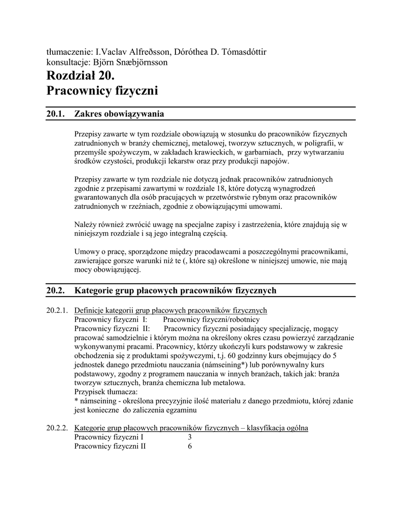 tłumaczenie: I.Vaclav Alfreðsson, Dóróthea D. Tómasdóttir konsultacje: Björn Snæbjörnsson Rozdział 20. Pracownicy fizyczni 20.1. Zakres obowiązywania Przepisy zawarte w tym rozdziale obowiązują w stosunku do pracowników fizycznych zatrudnionych w branży chemicznej, metalowej, tworzyw sztucznych, w poligrafii, w przemyśle spożywczym, w zakładach krawieckich, w garbarniach, przy wytwarzaniu środków czystości, produkcji lekarstw oraz przy produkcji napojów. Przepisy zawarte w tym rozdziale nie dotyczą jednak pracowników zatrudnionych zgodnie z przepisami zawartymi w rozdziale 18, które dotyczą wynagrodzeń gwarantowanych dla osób pracujących w przetwórstwie rybnym oraz pracowników zatrudnionych w rzeźniach, zgodnie z obowiązującymi umowami. Należy również zwrócić uwagę na specjalne zapisy i zastrzeżenia, które znajdują się w niniejszym rozdziale i są jego integralną częścią. Umowy o pracę, sporządzone między pracodawcami a poszczególnymi pracownikami, zawierające gorsze warunki niż te (, które są) określone w niniejszej umowie, nie mają mocy obowiązującej. 20.2. Kategorie grup płacowych pracowników fizycznych 20.2.1. Definicje kategorii grup płacowych pracowników fizycznych Pracownicy fizyczni I: Pracownicy fizyczni/robotnicy Pracownicy fizyczni II: Pracownicy fizyczni posiadający specjalizację, mogący pracować samodzielnie i którym można na określony okres czasu powierzyć zarządzanie wykonywanymi pracami. Pracownicy, którzy ukończyli kurs podstawowy w zakresie obchodzenia się z produktami spożywczymi, t.j. 60 godzinny kurs obejmujący do 5 jednostek danego przedmiotu nauczania (námseining*) lub porównywalny kurs podstawowy, zgodny z programem nauczania w innych branżach, takich jak: branża tworzyw sztucznych, branża chemiczna lub metalowa. Przypisek tłumacza: * námseining - określona precyzyjnie ilość materiału z danego przedmiotu, której zdanie jest konieczne do zaliczenia egzaminu 20.2.2. Kategorie grup płacowych pracowników fizycznych – klasyfikacja ogólna Pracownicy fizyczni I 3 Pracownicy fizyczni II 6 20.2.3 Kategorie grup płacowych pracowników w przetwórstwie mięsnym Pracownicy przy uboju drobiu 3 Pracownicy przy uboju bydła 4 Pracownicy ze specjalizacją, którzy ukończyli kurs podstawowy w zakresie obchodzenia się z produktami spożywczymi 6 20.2.4. Kategorie grup płacowych w warsztatach mechanicznych oraz w branży metalowej Robotnicy 6 Pracownicy ze specjalizacją oraz dużym doświadczeniem zawodowym, pracujący jako pomocnicy rzemieślników 9 20.3. Wypłaty wynagrodzeń Wypłaty dla pracowników zatrudnionych w systemie tygodniowych wypłat wynagrodzeń powinny odbywać się każdego piątku w zwykłym czasie pracy danego pracownika. Jeśli piątek jest dniem wolnym od pracy, to wypłaty powinny mieć miejsce w ostatnim dniu pracującym przed dniem wolnym. Pracownicy, którym wynagrodzenia są wypłacane co miesiąc powinni otrzymać wypłatę pierwszego dnia pracującego każdego miesiąca. Wszystkie wypłaty wynagrodzeń dokonywane są z dołu. Każdy odcinek wypłaty powinien zawierać wyszczególnienie elementów składających się na wynagrodzenie oraz elementów, które zostały potrącone. Należy także wyszczególnić ilość godzin pracy w czasie, który zgodnie z przepisami zawartymi w umowie zbiorowej w artykule 2.4.2. powinien być zagwarantowany na odpoczynek. Jeśli pierwszy dzień miesiąca przypada na dzień wolny, to wypłaty wynagrodzeń należy dokonać w ostatnim dniu pracującym przed pierwszym dniem następnego miesiąca. Dozwala się, aby pracodawca wypłacał wynagrodzenie w formie czeku lub przelewu bankowego na rachunek pracownika w tym banku, który obsługuje dane przesiębiorstwo. Zezwala się, aby dany związek zawodowy wypowiedział umowę dotyczącą obsługi wypłat wynagrodzeń w poszczególnych przedsiębiorstwach, jeśli doszłoby do nadużyć. Jeśli pracodawca życzy sobie, aby obsługa wypłat wynagrodzeń odbywała się w inny niż wymieniony w tej umowie sposób, to ma on obowiązek skonsultowania tego ze swoimi pracownikami, związkiem zawodowym, do którego pracownicy należą oraz z Federacją Pracodawców (SI/SA). 20.4 Czas pracy 20.4.1. Czas pracy na zmianie dziennej Praca na zmianie dziennej powinna się odbywać pomiędzy godziną 07:00 a 17:00. Czas pracy każdego pracownika na zmianie dziennej wynosi przeciętnie 8 godzin na dzień w wyżej wymienionych godzinach lub 40 godzin tygodniowo. Praca na zmianie dziennej powinna odbywać się w dniach roboczych , ale nie w soboty. 20.4.2. Praca w godzinach nadliczbowych Pracownik jest zobowiązany do wypełniania zgodnych z umową obowiązków w czasie pracy na zmianie dziennej, a wynagrodzenie za pracę w godzinach nadliczbowych jest wypłacane dopiero wtedy, gdy odpracowane zostanie pełne 40 godzin w każdym tygodniu. Uzasadniona przepisami prawa nieobecność w pracy, do której zalicza się urlop bezpłatny, w tym przypadku jest wliczana do czasu pracy. 20.4.3. Rejestrowanie czasu pracy W zakładach pracy obok rejestratora czasu pracy powinna być wywieszona pisemna informacja z dokładnie wyszczególnionym czasem rozpoczęcia i zakończenia pracy, czasem przeznaczonym na posiłki oraz czasem na kawę wraz z informacją, że jakakolwiek konsumpcja w innym czasie niż wyszczególniony jest zabroniona. Pracownicy są zobowiązani do ścisłego przestrzegania ustalonego czasu pracy, starannego i pod każdym względem sumiennego wykonywania swoich obowiązków (pod każdym względem), zgodnie z poleceniami pracodawcy. Co dotyczy zmiany ubrania na ubranie robocze, to pracownik powinien przebrać się w odzież roboczą przed czasem rozpoczęcia pracy, a ponowna zmiana odzieży powinna nastąpić nie wcześniej niż po zakończeniu pracy. Jeśli pracownik nie stawi się do pracy, to spoczywa na nim obowiązek niezwłocznego zawiadomienia o tym pracodawcy. Jeśli pracownik spóźnił