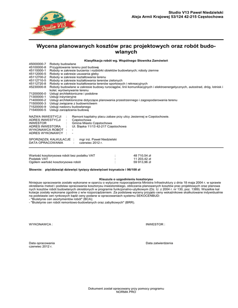 Studio V13 Paweł Niedzielski Aleja Armii Krajowej 53/124 42-215 Częstochowa Wycena planowanych kosztów prac projektowych oraz robót budowlanych 45000000-7 45100000-8 45110000-1 45112000-5 45112700-2 45112710-5 45112720-8 45230000-8 71200000-0 71300000-1 71400000-2 71500000-3 71520000-9 71540000-5 Klasyfikacja robót wg. Wspólnego Słownika Zamówień Roboty budowlane Przygotowanie terenu pod budowę Roboty w zakresie burzenia i rozbiórki obiektów budowlanych; roboty ziemne Roboty w zakresie usuwania gleby Roboty w zakresie kształtowania terenu Roboty w zakresie kształtowania terenów zielonych Roboty w zakresie kształtowania terenów sportowych i rekreacyjnych Roboty budowlane w zakresie budowy rurociągów, linii komunikacyjnych i elektroenergetycznych, autostrad, dróg, lotnisk i kolei; wyrównywanie terenu Usługi architektoniczne i podobne Usługi inżynieryjne Usługi architektoniczne dotyczące planowania przestrzennego i zagospodarowania terenu Usługi związane z budownictwem Usługi nadzoru budowlanego Usługi zarządzania budową NAZWA INWESTYCJI ADRES INWESTYCJI INWESTOR ADRES INWESTORA WYKONAWCA ROBÓT ADRES WYKONAWCY : : : : : : Remont kapitalny placu zabaw przy ulicy Jesiennej w Częstochowie. Częstochowa Gmina Miasto Częstochowa Ul. Śląska 11/13 42-217 Częstochowa - SPORZĄDZIŁ KALKULACJE : DATA OPRACOWANIA : mgr inż. Paweł Niedzielski czerwiec 2012 r. Wartość kosztorysowa robót bez podatku VAT Podatek VAT Ogółem wartość kosztorysowa robót : : : 48 710,54 zł 11 203,42 zł 59 913,96 zł Słownie: pięćdziesiąt dziewięć tysięcy dziewięćset trzynaście i 96/100 zł Klauzula o uzgodnieniu kosztorysu Niniejsze opracowanie zostało wykonane w oparciu o wytyczne rozporządzenia Ministra Infrastruktury z dnia 18 maja 2004 r. w sprawie określania metod i podstaw opracowania kosztorysu inwestorskiego, obliczania planowanych kosztów prac projektowych oraz planowa nych kosztów robót budowlanych określonych w programie funkcjonalno-użytkowym (Dz. U. z 2004 r. nr 130, poz. 1389). Wszelkie kal kulacje zostały wykonane zgodnie z w/w rozporządzeniem. Za podstawę wyceny przyjęto ceny wskaźnikowe skalkulowane indywidualnie na podstawie cen rynkowych bądź ceny podane w opracowaniach systemu SEKOCENBUD: - "Biuletynie cen asortymentów robót" (BCA); - "Biuletynie cen robót remontowo-budowlanych oraz zabytkowych" (BRR). WYKONAWCA : INWESTOR : Data opracowania czerwiec 2012 r. Data zatwierdzenia Dokument został opracowany przy pomocy programu NORMA PRO Lp. Podstawa Opis 1 PRACE PROJEKTOWE 1 Wycena włas- Wykonanie dokumentacji projektowo-kosztorysowej d.1 na Razem dział: PRACE PROJEKTOWE 2 ROBOTY BUDOWLANE 2.1 Roboty rozbiórkowe i przygotowawcze 2 Wycena włas- Usunięcie elementów fundamentów starych urządzeń d.2. na 1 3 Wycena włas- Roboty ziemne d.2. na 1 2.2 Wyposażenie placu zabaw 4 Wycena włas- Dostawa i montaż tablicy informacyjnej. d.2. na 2 5 Wycena włas- Dostawa i montaż urządzenia wielofunkcyjnego. d.2. na 2 6 Wycena włas- Dostawa i montaż huśtawki podwójnej. d.2. na 2 7 Wycena włas- Dostawa i montaż huśtawki wagowej (ważki) d.2. na 2 8 Wycena włas- Dostawa i montaż piaskownicy wraz z wykonaniem fund.2. na damentu. 2 9 Wycena włas- Dostawa i montaż ławki d.2. na 2 10 Wycena włas- Dostawa i montaż kosza na śmieci d.2. na 2 11 Wycena włas- Montaż krat zabezpieczających przed przedostawaniem d.2. na się zwierząt na teren placu 2 2.3 Nawierzchnie 12 Wycena włas- Ława betonowa pod obrzeża d.2. na 3 13 Wycena włas- Obrzeża betonowe (6x20) cm d.2. na 3 14 Wycena włas- Warstwa odsączająca z piasku o grubości 10 cm d.2. na 3 15 Wycena włas- Podbudowa z kruszywa łamanego o grubości 15 cm d.2. na 3 16 BCA 08-10-56 Nawierzchnia z kostki betonowej gr. 8 cm na podsypce d.2. cementowo-piaskowej 3 17 Wycena włas- Nawierzchnia z mat gumowych d.2. na 3 2.4 Zieleń 18 Wycena włas- Nasadzenia drzew - jarzęby d.2. na 4 19 Wycena włas- Nasadzenia drzew - kasztanowiec d.2. na 4 20 Nasadzenia żywopłotowe d.2. 4 2.5 Prace wykończeniowe 21 Wycena włas- Odtworzenie trawników d.2. na 5 Razem dział: ROBOTY BUDOWLANE Wartość kosztorysowa robót bez podatku VAT Podatek VAT Ogółem wartość kosztorysowa robót Słownie: pięćdziesiąt dziewięć tysięcy dziewięćset trzynaście i 96/100 zł -2- Norma PRO Wersja 4.36 Nr seryjny: 27633 Użytkownik: Studio V13 Paweł Niedzielski Jedn.obm. kpl. Ilość 1 Cena jedn. 1 300,00 Wartość 1 300,00 1 300,00 m3 m3 0,5 93*0,05+24* 0,35+2 = 15,050 300,00 150,00 35,00 526,75 szt 1 500,00 500,00 szt 1 16 000,00 16 000,00 szt 1 2 280,00 2 280,00 szt 1 1 230,00 1 230,00 szt 1 2 000,00 2 000,00 szt 3 720,00 2 160,00 szt 3 415,00 1 245,00 szt 2 350,00 700,00 m3 22*0,032 = 0,704 448,00 315,39 m 22 22,00 484,00 m2 24 5,10 122,40 m2 24 35,00 840,00 m2 24 80,00 1 920,00 m2 93 83,00 7 719,00 szt 9 380,00 3 420,00 szt 1 450,00 450,00 m 108 45,00 4 860,00 m2 80 6,10 488,00 47 410,54 48 710,54 11 203,42 59 913,96