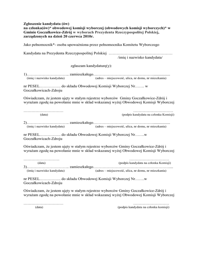 Zgłoszenie kandydata (ów) na członka(ów)* obwodowej komisji wyborczej (obwodowych komisji wyborczych)* w Gminie Goczałkowice-Zdrój w wyborach Prezydenta Rzeczypospolitej Polskiej, zarządzonych na dzień 20 czerwca 2010r. Jako pełnomocnik*- osoba upowaŜniona przez pełnomocnika Komitetu Wyborczego Kandydata na Prezydenta Rzeczypospolitej Polskiej ………………………………………… /imię i nazwisko kandydata/ zgłaszam kandydaturę(y): 1)………………………….. zamieszkałego………………………………………................. (imię i nazwisko kandydata) (adres – miejscowość, ulica, nr domu, nr mieszkania) nr PESEL……………. do składu Obwodowej Komisji Wyborczej Nr……. w Goczałkowicach-Zdroju Oświadczam, Ŝe jestem ujęty w stałym rejestrze wyborców Gminy Goczałkowice-Zdrój i wyraŜam zgodę na powołanie mnie w skład wskazanej wyŜej Obwodowej Komisji Wyborczej ………………………… (data) ………………………… (podpis kandydata na członka Komisji) 2)………………………….. zamieszkałego………………………………………................. (imię i nazwisko kandydata) (adres – miejscowość, ulica, nr domu, nr mieszkania) nr PESEL……………. do składu Obwodowej Komisji Wyborczej Nr…….w Goczałkowicach-Zdroju Oświadczam, Ŝe jestem ujęty w stałym rejestrze wyborców Gminy Goczałkowice-Zdrój i wyraŜam zgodę na powołanie mnie w skład wskazanej wyŜej Obwodowej Komisji Wyborczej ……………………… (data) ………………………… (podpis kandydata na członka Komisji) 3)………………………….. zamieszkałego………………………………………………….... (imię i nazwisko kandydata) (adres – miejscowość, ulica, nr domu, nr mieszkania) nr PESEL……………. do składu Obwodowej Komisji Wyborczej Nr…….w Goczałkowicach-Zdroju Oświadczam, Ŝe jestem ujęty w stałym rejestrze wyborców Gminy Goczałkowice-Zdrój i wyraŜam zgodę na powołanie mnie w skład wskazanej wyŜej Obwodowej Komisji Wyborczej ………………………… (data) ……………………… (podpis kandydata na członka komisji) 4)………………………….. zamieszkałego………………………………………………….... (imię i nazwisko kandydata) (adres – miejscowość, ulica, nr domu, nr mieszkania) nr PESEL……………. do składu Obwodowej Komisji Wyborczej Nr…….w Goczałkowicach-Zdroju Oświadczam, Ŝe jestem ujęty w stałym rejestrze wyborców Gminy Goczałkowice-Zdrój i wyraŜam zgodę na powołanie mnie w skład wskazanej wyŜej Obwodowej Komisji Wyborczej ………………………… (data) ……………………… (podpis kandydata na członka Komisji) 5)………………………….. zamieszkałego………………………………………………….... (imię i nazwisko kandydata) (adres – miejscowość, ulica, nr domu, nr mieszkania) nr PESEL……………. do składu Obwodowej Komisji Wyborczej Nr…….w Goczałkowicach-Zdroju Oświadczam, Ŝe jestem ujęty w stałym rejestrze wyborców Gminy Goczałkowice-Zdrój i wyraŜam zgodę na powołanie mnie w skład wskazanej wyŜej Obwodowej Komisji Wyborczej ………………………… (data) ……………………… (podpis kandydata na członka Komisji) ……………………………….. (podpis zgłaszającego) ………………………… (data) ………………………………. (czytelnie imię,nazwisko,funkcja)