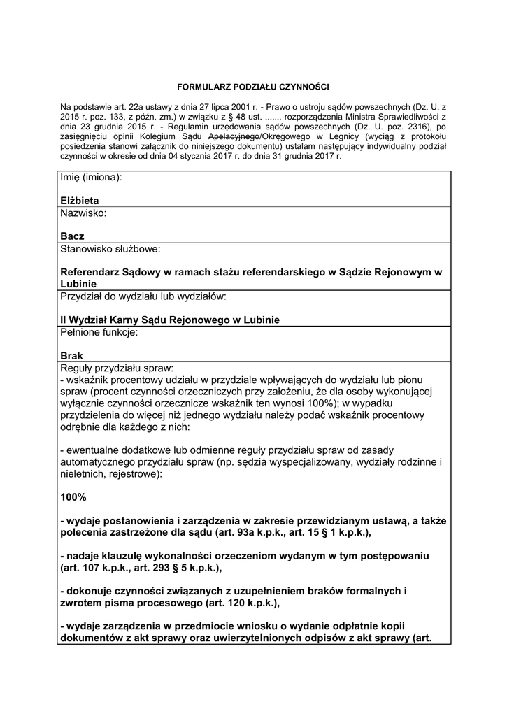 FORMULARZ PODZIAŁU CZYNNOŚCI Na podstawie art. 22a ustawy z dnia 27 lipca 2001 r. - Prawo o ustroju sądów powszechnych (Dz. U. z 2015 r. poz. 133, z późn. zm.) w związku z § 48 ust. ....... rozporządzenia Ministra Sprawiedliwości z dnia 23 grudnia 2015 r. - Regulamin urzędowania sądów powszechnych (Dz. U. poz. 2316), po zasięgnięciu opinii Kolegium Sądu Apelacyjnego/Okręgowego w Legnicy (wyciąg z protokołu posiedzenia stanowi załącznik do niniejszego dokumentu) ustalam następujący indywidualny podział czynności w okresie od dnia 04 stycznia 2017 r. do dnia 31 grudnia 2017 r. Imię (imiona): Elżbieta Nazwisko: Bacz Stanowisko służbowe: Referendarz Sądowy w ramach stażu referendarskiego w Sądzie Rejonowym w Lubinie Przydział do wydziału lub wydziałów: II Wydział Karny Sądu Rejonowego w Lubinie Pełnione funkcje: Brak Reguły przydziału spraw: - wskaźnik procentowy udziału w przydziale wpływających do wydziału lub pionu spraw (procent czynności orzeczniczych przy założeniu, że dla osoby wykonującej wyłącznie czynności orzecznicze wskaźnik ten wynosi 100%); w wypadku przydzielenia do więcej niż jednego wydziału należy podać wskaźnik procentowy odrębnie dla każdego z nich: - ewentualne dodatkowe lub odmienne reguły przydziału spraw od zasady automatycznego przydziału spraw (np. sędzia wyspecjalizowany, wydziały rodzinne i nieletnich, rejestrowe): 100% - wydaje postanowienia i zarządzenia w zakresie przewidzianym ustawą, a także polecenia zastrzeżone dla sądu (art. 93a k.p.k., art. 15 § 1 k.p.k.), - nadaje klauzulę wykonalności orzeczeniom wydanym w tym postępowaniu (art. 107 k.p.k., art. 293 § 5 k.p.k.), - dokonuje czynności związanych z uzupełnieniem braków formalnych i zwrotem pisma procesowego (art. 120 k.p.k.), - wydaje zarządzenia w przedmiocie wniosku o wydanie odpłatnie kopii dokumentów z akt sprawy oraz uwierzytelnionych odpisów z akt sprawy (art. 156 § 2 i 3 k.p.k.), - podejmuje czynności w postępowaniu o odtworzenie akt (art. 162 k.pk.), - dokonuje wstępnej kontroli warunków formalnych aktu oskarżenia (art. 338 k.p.k.), - podejmuje czynności w sprawach związanych z zatrzymaniem rzeczy i przeszukaniem w postępowaniu sądowym (art. 235 k.p.k.), - wydaje zarządzenie o odmowie sporządzenia i doręczenia uzasadnienia wyroku (art. 422 k.p.k.), - podejmuje czynności w postępowaniu o zwolnienie od kosztów sądowych (art. 623 k.p.k.) oraz rozliczenia kosztów procesu (art. 626 § 2 k.p.k.), - wykonuje czynności związane z przekazywaniem informacji gospodarczej o powstaniu zaległości w uiszczaniu grzywny, nawiązki na rzecz Skarbu Państwa, kwoty pieniężnej stanowiącej przedmiot przepadku, kosztów sądowych lub pieniężnej kary porządkowej na podstawie prawomocnego orzeczenia sądowego wydanego w sprawie o przestępstwo lub wykroczenie oraz o aktualizację, sprostowanie lub usunięcie tych informacji, do biur informacji gospodarczej zgodnie z art.12a §2 k.k.w., - nadto wykonuje czynności w postępowaniu wykonawczym wskazane w art. 14 k.k.w., 15 § 1 k.k.w., 17 k.k.w., 56 § 1 k.k.w., 60 k.k.w., 119 k.k.w., 179 k.k.w., 180 k.k.w., 181 k.k.w., 181a § 1 k.k.w., 181b § 1 k.k.w., 181c k.k.w., 182 § 1 k.k.w., 183 k.k.w, 184 k.k.w, 187 k.k.w., 193 § 1 k.k.w., 193 § 2 k.k.w., 198 § 1 k.k.w., 198 § 2 k.k.w., 199 § 1 k.k.w., 199 § 2 k.k.w., 204 § 3 k.k.w., 206 § 1 k.k.w. Uzasadnienie reguły przydziału spraw - ustalenia wskaźnika procentowego udziału w przydziale wpływających do wydziału lub pionu spraw ze wskazaniem przyczyn zastosowania niższego wskaźnika niż 100% oraz sposobu ustalenia jego wysokości (podlega wypełnieniu w razie ustalenia wskaźnika na poziomie niższym niż 100%): Zasady zastępstw: Dodatkowe obciążenia oraz ich wymiar (np. dyżury aresztowe, dyżury sędziów rodzinnych, koordynatorzy): - wykonuje inne czynności zlecone przez Przewodniczącego Wydziału i Prezesa Sądu.