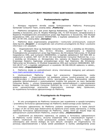 REGULAMIN PLATFORMY PROMOCYJNEJ SANTANDER CONSUMER TEAM I. Postanowienia ogólne §1 1. Niniejszy regulamin określa zasady funkcjonowania Santander Consumer Team, zwanej dalej: „Platformą”. Platformy Promocyjnej 2. Platforma zarządzana jest przez Agencję Reklamową „Oskar Wegner” Sp. z o.o. z siedzibą w Szczecinie, przy Al. Wojska Polskiego 156, 71-324 Szczecin, zarejestrowana w Rejestrze Przedsiębiorców prowadzonym przez Sąd Rejonowy w Szczecinie, XIII Wydział Gospodarczy KRS, pod numerem 0000057584, o kapitale zakładowym 50 000 zł, NIP: 851-10-49-193, zwaną dalej: „Zarządcą”. 3. Platforma służy organizowaniu programów i konkursów promocyjnych, zwanych dalej łącznie „Akcjami”, w szczególności zaś umożliwia przystąpienie do Akcji i uzyskanie informacji o ich zasadach. 3a. Organizatorami Akcji są Santander Consumer Bank S.A. z siedzibą we Wrocławiu, przy ul. Strzegomskiej 42c, 53-611 Wrocław, zarejestrowany w Rejestrze Przedsiębiorców prowadzonym przez Sąd Rejonowy dla Wrocławia-Fabrycznej, VI Wydział Gospodarczy KRS, pod numerem 0000040562, o kapitale zakładowym 520 000 000 zł, wpłaconym w całości, NIP: 527-20-46-102 oraz Santander Consumer Multirent Sp. z o.o. z siedzibą we Wrocławiu, ul. Strzegomska 42c, wpisany do Rejestru Przedsiębiorców Krajowego Rejestru Sądowego prowadzonego przez Sąd Rejonowy dla WrocławiaFabrycznej we Wrocławiu, VI Wydział Gospodarczy KRS pod numerem 0000286383, NIP: 522-28-57-117; o kapitale zakładowym w wysokości 38.346.000,00 wpłacony w całości,, zwani dalej: „Organizatorami”. 4. Platforma działa za pośrednictwem strony internetowej dostępnej pod adresem: www.team.santanderconsumer.pl. 5. Użytkownikami Platformy mogą być pracownicy Organizatorów, osoby współpracujące z Organizatorami na podstawie umowy cywilno-prawnej lub osoby współpracujące z Organizatorami, którzy sporządzają umowy finansowania zakupu pojazdów samochodowych z wykorzystaniem kredytu lub pożyczki na rzecz Santander Consumer Banku i umowy finansowania pojazdów samochodowych z wykorzystaniem leasingu na rzecz Santander Consumer Multirent Sp. z o.o. z które zostały zaproszone przez upoważnionego pracownika Organizatora, zwanego dalej Opiekunem, do wypełnienia formularza zgłoszeniowego do Platformy. II. Przystąpienie do Programu §2 1. W celu przystąpienia do Platformy konieczne jest wypełnienie w sposób kompletny i prawidłowy formularza zgłoszeniowego do Platformy dostarczonego przez Opiekuna. 2. Formularz zgłoszeniowy do Platformy zostanie zarejestrowany w bazie danych w ciągu 14 dni od dnia jego dostarczenia do Opiekuna przez osobę zaproszoną. Z chwilą rejestracji formularza zgłoszeniowego do Platformy, osoba, która go złożyła staje się pełnoprawnym użytkownikiem Platformy, zwanym dalej: „Użytkownikiem”. 3. Użytkownik po dokonaniu rejestracji, na podany w formularzu zgłoszeniowym do Platformy numer telefonu, otrzyma wiadomość SMS z indywidualnym loginem i hasłem. Użytkownik nie może przekazywać osobom trzecim loginu i hasła oraz zobowiązany jest chronić dostępu do tych danych. Zarządca ani Organizatorzy nie ponoszą odpowiedzialności z tytułu szkód powstałych w wyniku udostępnienia przez Strona 1 z 3 Użytkownika loginu i hasła osobom trzecim, chyba że udostępnienie to było wynikiem działania Zarządcy lub Organizatorów. 4. Użytkownik zobowiązany jest do bieżącego powiadamiania o każdej zmianie danych przekazanych w formularzu zgłoszeniowym do Platformy. Zmiana danych wymaga wypełnienia i podpisania formularza aktualizacyjnego. Użytkownik przekazuje wypełniony formularz aktualizacyjny swojemu Opiekunowi. Zmiany danych zostają wprowadzone w terminie 14 dni od daty przekazania formularza aktualizacyjnego Opiekunowi. 5. Wystąpienie z Platformy i całkowita rezygnacja z jej wykorzystywania jest możliwa poprzez przesłanie rezygnacji na adres: Agencja Reklamowa „Oskar Wegner”, Plac Rodła 9, 70-419 Szczecin z dopiskiem „Santander Consumer Team” lub drogą mailową na adres: [email protected]. 6. Użytkownik ma możliwość przystąpienia do dostępnych za pośrednictwem Platformy Akcji, pod warunkiem spełnienia wymagań zastrzeżonych w regulaminach poszczególnych Akcji. 7. Użytkownik nie może wykorzystywać Platformy do dostarczania treści o charakterze bezprawnym. 8. W przypadku, kiedy Użytkownik narusza postanowienia punktu powyżej Zarządca może wykluczyć Użytkownika z udziału w Platformie, po uprzednim poinformowaniu Użytkownika wraz z uzasadnieniem na podany przez niego, w formularzu zgłoszeniowym do Platformy lub formularzu aktualizacyjnym, adres poczty elektronicznej. III. Postępowanie reklamacyjne §3 1. Wszelkie reklamacje/skargi dotyczące Platformy należy zgłaszać na adres Zarządcy: Agencja Reklamowa „Oskar Wegner”, Plac Rodła 9, 70-419 Szczecin z dopiskiem Santander Consumer Team lub drogą mailową na adres: [email protected], przez cały czas funkcjonowania Platformy, nie później niż w terminie 60 dni, od daty zdarzenia, którego dotyczą lub skutku zdarzenia uzasadniającego reklamację. Zgłoszenie powinno zawierać: Imię i nazwisko, dokładny adres korespondencyjny, aktualny prywatny adres poczty elektronicznej, wraz z dokładnym opisem i powodem reklamacji/skargi. O sposobie rozpatrzenia reklamacji/skargi Użytkownik będzie poinformowany na adres podany w zgłoszeniu reklamacji/skargi w terminie 21 dni od dnia jej otrzymania przez Zarządcę (liczy się data stempla pocztowego). 2. Zasady zgłaszania i rozpatrywania reklamacji określone w Regulaminie w żaden sposób nie ograniczają prawa Uczestnika do wystąpienia z roszczeniem do właściwego sądu powszechnego. IV. Postanowienia końcowe §4 1. Administratorem danych osobowych Użytkowników, pozyskiwanych i przetwarzanych w związku z korzystaniem z Platformy, są Organizatorzy. Dane osobowe przetwarzane są zgodnie z postanowieniami