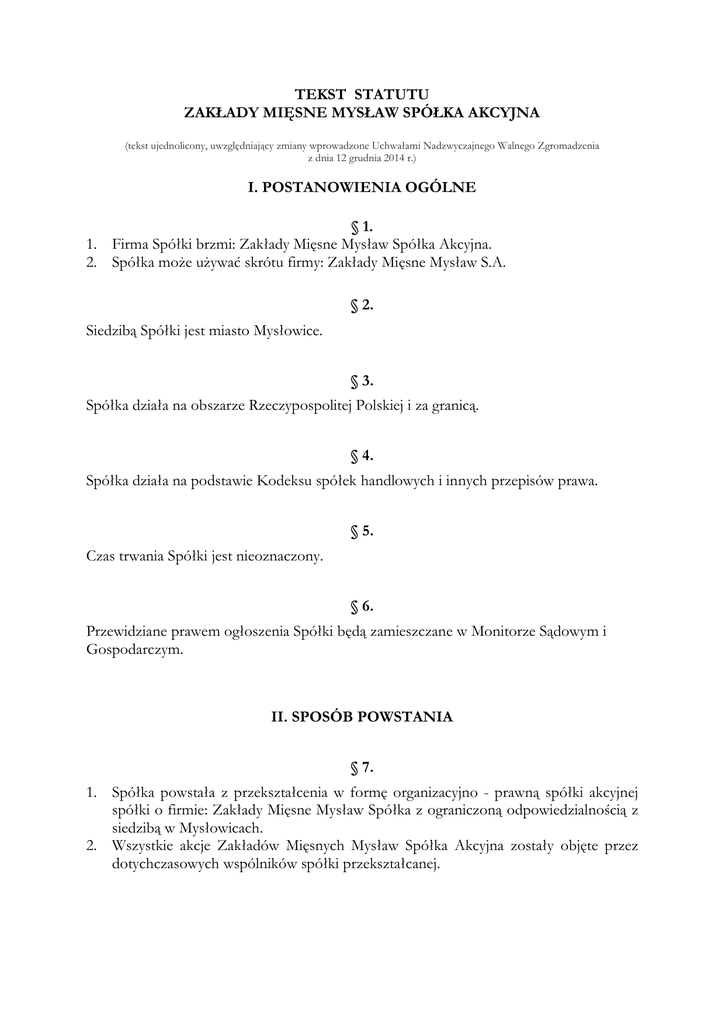 TEKST STATUTU ZAKŁADY MIĘSNE MYSŁAW SPÓŁKA AKCYJNA (tekst ujednolicony, uwzględniający zmiany wprowadzone Uchwałami Nadzwyczajnego Walnego Zgromadzenia z dnia 12 grudnia 2014 r.) I. POSTANOWIENIA OGÓLNE § 1. 1. Firma Spółki brzmi: Zakłady Mięsne Mysław Spółka Akcyjna. 2. Spółka może używać skrótu firmy: Zakłady Mięsne Mysław S.A. § 2. Siedzibą Spółki jest miasto Mysłowice. § 3. Spółka działa na obszarze Rzeczypospolitej Polskiej i za granicą. § 4. Spółka działa na podstawie Kodeksu spółek handlowych i innych przepisów prawa. § 5. Czas trwania Spółki jest nieoznaczony. § 6. Przewidziane prawem ogłoszenia Spółki będą zamieszczane w Monitorze Sądowym i Gospodarczym. II. SPOSÓB POWSTANIA § 7. 1. Spółka powstała z przekształcenia w formę organizacyjno - prawną spółki akcyjnej spółki o firmie: Zakłady Mięsne Mysław Spółka z ograniczoną odpowiedzialnością z siedzibą w Mysłowicach. 2. Wszystkie akcje Zakładów Mięsnych Mysław Spółka Akcyjna zostały objęte przez dotychczasowych wspólników spółki przekształcanej. III. PRZEDMIOT DZIAŁALNOŚCI § 8. 1. Przedmiotem działalności Spółki jest zgodnie z Polską Klasyfikacją Działalności: 1) PKD 10.11.Z - Przetwarzanie i konserwowanie mięsa, z wyłączeniem mięsa z drobiu, 2) PKD 10.12. Z - Przetwarzanie i konserwowanie mięsa z drobiu, 3) PKD 10.13.Z - Produkcja wyrobów z mięsa, włączając wyroby z mięsa drobiowego, 4) PKD 10.85.Z - Wytwarzanie gotowych posiłków i dań, 5) PKD 10.89.Z - Produkcja pozostałych artykułów spożywczych, gdzie indziej niesklasyfikowana, 6) PKD 37.00. Z - Odprowadzanie i oczyszczanie ścieków, 7) PKD 38.11.Z - Obieranie odpadów innych niż niebezpieczne, 8) PKD 38.12.Z - Zbieranie odpadów niebezpiecznych, 9) PKD 38.21.Z - Obróbka i usuwanie odpadów innych niż niebezpieczne, 10) PKD 38.22.Z - Przetwarzanie i unieszkodliwianie odpadów niebezpiecznych, 11) PKD 39.00.Z - Działalność związana z rekultywacją i pozostała działalność usługowa związana z gospodarką odpadami, 12) PKD 46.17.Z - Działalność agentów zajmujących się sprzedażą żywności, napojów i wyrobów tytoniowych, 13) PKD 46.18.Z - Działalność agentów specjalizujących się w sprzedaży pozostałych określonych towarów, 14) PKD 46.19.Z - Działalność agentów zajmujących się sprzedażą towarów różnego rodzaju, 15) PKD 46.23.Z - Sprzedaż hurtowa żywych zwierząt, 16) PKD 46.24.Z - Sprzedaż hurtowa skór, 17) PKD 46.32.Z - Sprzedaż hurtowa mięsa i wyrobów z mięsa, 18) PKD 46.39.Z - Sprzedaż hurtowa niewyspecjalizowana żywności, napojów i wyrobów tytoniowych, 19) PKD 46.69.Z - Sprzedaż hurtowa pozostałych maszyn i urządzeń, 20) PKD 46.90.Z - Sprzedaż hurtowa niewyspecjalizowana, 21) PKD 47.11.Z - Sprzedaż detaliczna prowadzona w niewyspecjalizowanych sklepach z przewagą żywności, napojów i wyrobów tytoniowych, 22) PKD 47.19.Z. - Pozostała sprzedaż detaliczna prowadzona w niewyspecjalizowanych sklepach, 23) PKD 47.21.Z - Sprzedaż detaliczna owoców i warzyw prowadzona w wyspecjalizowanych sklepach, 24) PKD 47.22.Z - Sprzedaż detaliczna mięsa i wyrobów z mięsa prowadzona w wyspecjalizowanych sklepach, 25) PKD 47.29.Z - Sprzedaż detaliczna pozostałej żywności prowadzona w wyspecjalizowanych sklepach, 26) PKD 49.41.Z - Transport drogowy towarów, 27) PKD 52.24.C - Przeładunek towarów w pozostałych punktach przeładunkowych, 28) PKD 52.10.B - Magazynowanie i przechowywanie pozostałych towarów, 29) PKD 64.19.Z - Pozostałe pośrednictwo pieniężne, 30) PKD 64.20.Z - Działalność holdingów finansowych, 31) PKD 64.91. Z - Leasing finansowy, 32) PKD 64.92.Z - Pozostałe formy udzielania kredytów, 33) PKD 64.99.Z - Pozostała finansowa działalność usługowa, gdzie indziej niesklasyfikowana, z wyłączeniem ubezpieczeń i funduszów emerytalnych 34) PKD 66.19.Z - Pozostała działalność wspomagająca usługi finansowe, z wyłączeniem ubezpieczeń i funduszów emerytalnych, 35) PKD 68.10.Z. - Kupno i sprzedaż nieruchomości na własny rachunek, 36) PKD 68.20.Z - Wynajem i zarządzanie nieruchomościami własnymi lub dzierżawionymi, 37) PKD 77.11.Z - Wynajem i dzierżawa samochodów osobowych i furgonetek, 38) PKD 77.12.Z - Wynajem i dzierżawa pozostałych pojazdów samochodowych, z wyłączeniem motocykli, 39) PKD 77.33.Z - Wynajem i dzierżawa maszyn i urządzeń biurowych, włączając komputery, 40) PKD 77.39.Z - Wynajem i dzierżawa pozostałych maszyn, urządzeń oraz dóbr materialnych, gdzie indziej niesklasyfikowane, 41) PKD 80.10.Z Działalność ochroniarska, z wyłączeniem obsługi systemów bezpieczeństwa, 42) PKD 80.20.Z - Działalność ochroniarska w zakresie obsługi systemów bezpieczeństwa, 43) PKD 81.10.Z. - Działalność pomocnicza związana z utrzymaniem porządku w budynkach, 44) PKD 81.21.Z - Niespecjalistyczne sprzątanie budynków i obiektów przemysłowych, 45) PKD 81.22.Z - Specjalistyczne sprzątanie budynków i obiektów przemysłowych, 46) PKD 81.29.Z - Pozostałe sprzątanie, 47) PKD 82.92.Z - Działalność związana z pakowaniem, 48) PKD 96.09.Z - Pozostała działalność usługowa, gdzie indziej niesklasyfikowana. 2. Jeśli niektóre rodzaje działalności wymagałyby zezwolenia odpowiednich władz polskich lub w przypadku działalności poza granicami Rzeczpospolitej Polskiej władz innych państw, działalność taka zostanie podjęta dopiero po otrzymaniu odpowiednich zezwoleń. § 9. Spółka może zakładać oraz być wspólnikiem lub akcjonariuszem spółek krajowych i zagranicznych, jak również może uczestniczyć w krajowych i zagranicznych organizacjach gospodarczych. IV. KAPITAŁ ZAKŁADOWY § 10. 1. Kapitał zakładowy wynosi 19.301.082 zł. (słownie: dziewiętnaście milionów trzysta jeden tysięcy osiemdziesiąt dwa złote) i dzieli się na 19.301.082 (słownie: dziewiętnaście milionów trzysta jeden tysięcy osiemdziesiąt dwie)