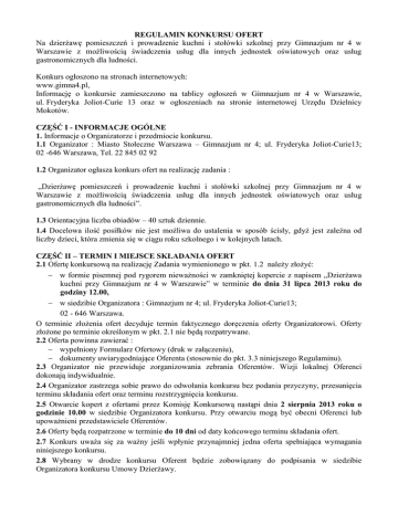 REGULAMIN KONKURSU OFERT Na dzierżawę pomieszczeń i prowadzenie kuchni i stołówki szkolnej przy Gimnazjum nr 4 w Warszawie z możliwością świadczenia usług dla innych jednostek oświatowych oraz usług gastronomicznych dla ludności. Konkurs ogłoszono na stronach internetowych: www.gimna4.pl, Informację o konkursie zamieszczono na tablicy ogłoszeń w Gimnazjum nr 4 w Warszawie, ul. Fryderyka Joliot-Curie 13 oraz w ogłoszeniach na stronie internetowej Urzędu Dzielnicy Mokotów. CZĘŚĆ I - INFORMACJE OGÓLNE 1. Informacje o Organizatorze i przedmiocie konkursu. 1.1 Organizator : Miasto Stołeczne Warszawa – Gimnazjum nr 4; ul. Fryderyka Joliot-Curie13; 02 -646 Warszawa, Tel. 22 845 02 92 1.2 Organizator ogłasza konkurs ofert na realizację zadania : „Dzierżawę pomieszczeń i prowadzenie kuchni i stołówki szkolnej przy Gimnazjum nr 4 w Warszawie z możliwością świadczenia usług dla innych jednostek oświatowych oraz usług gastronomicznych dla ludności”. 1.3 Orientacyjna liczba obiadów – 40 sztuk dziennie. 1.4 Docelowa ilość posiłków nie jest możliwa do ustalenia w sposób ścisły, gdyż jest zależna od liczby dzieci, która zmienia się w ciągu roku szkolnego i w kolejnych latach. CZĘŚĆ II – TERMIN I MIEJSCE SKŁADANIA OFERT 2.1 Ofertę konkursową na realizację Zadania wymienionego w pkt. 1.2 należy złożyć: w formie pisemnej pod rygorem nieważności w zamkniętej kopercie z napisem „Dzierżawa kuchni przy Gimnazjum nr 4 w Warszawie” w terminie do dnia 31 lipca 2013 roku do godziny 12.00, w siedzibie Organizatora : Gimnazjum nr 4; ul. Fryderyka Joliot-Curie13; 02 - 646 Warszawa. O terminie złożenia ofert decyduje termin faktycznego doręczenia oferty Organizatorowi. Oferty złożone po terminie określonym w pkt. 2.1 nie będą rozpatrywane. 2.2 Oferta powinna zawierać : wypełniony Formularz Ofertowy (druk w załączeniu), dokumenty uwiarygodniające Oferenta (stosownie do pkt. 3.3 niniejszego Regulaminu). 2.3 Organizator nie przewiduje zorganizowania zebrania Oferentów. Wizji lokalnej Oferenci dokonają indywidualnie. 2.4 Organizator zastrzega sobie prawo do odwołania konkursu bez podania przyczyny, przesunięcia terminu składania ofert oraz terminu rozstrzygnięcia konkursu. 2.5 Otwarcie kopert z ofertami przez Komisję Konkursową nastąpi dnia 2 sierpnia 2013 roku o godzinie 10.00 w siedzibie Organizatora konkursu. Przy otwarciu mogą być obecni Oferenci lub upoważnieni przedstawiciele Oferentów. 2.6 Oferty będą rozpatrzone w terminie do 10 dni od daty końcowego terminu składania ofert. 2.7 Konkurs uważa się za ważny jeśli wpłynie przynajmniej jedna oferta spełniająca wymagania niniejszego konkursu. 2.8 Wybrany w drodze konkursu Oferent będzie zobowiązany do podpisania w siedzibie Organizatora konkursu Umowy Dzierżawy. 2.9 Wybrany w konkursie Oferent, który zrezygnuje z podpisania Umowy Dzierżawy może zostać wykluczony z udziału w ponownie ogłoszonym konkursie. CZĘŚĆ III – WARUNKI WYMAGANE OD OFERENTÓW I DOKUMENTY UWIARYGODNIAJĄCE 3.1 Maksymalna cena obiadu dla uczniów i pracowników Gimnazjum nr 4 i Zespołu Szkól nr 3 wynosi 8.50 zł. brutto (słownie : osiem złotych pięćdziesiąt groszy brutto). 3.2 Obsługa gastronomiczna uroczystości szkolnych nie obejmuje niniejszego konkursu i może być realizowana na podstawie odrębnych umów. 3.3 Oferent zobowiązany jest dostarczyć jako załączniki do Formularza Ofertowego: Aktualne zaświadczenie o wpisie działalności gospodarczej lub aktualny odpis z Krajowego Rejestru Sądowego wystawiony nie wcześniej niż 6 miesięcy przed upływem terminu składania ofert, Oświadczenie lub dokumenty potwierdzające prawo do prowadzenia żywienia zbiorowego i usług gastronomicznych. CZĘŚĆ IV – OBOWIĄZKI DZIERŻAWCY 4.1 Dzienny jadłospis w gimnazjum obejmuje: obiad (zupa, drugie danie, surówka bądź gotowane jarzyny, kompot lub sok). Obiady powinny być urozmaicone, przygotowane zgodnie z zasadami racjonalnego żywienia, sporządzone z pełnowartościowych produktów posiadających aktualne terminy ważności. 4.2 Dzierżawca będzie żywił: uczniów Gimnazjum nr 4 i Zespołu Szkół nr 3, uczniów, których obiady finansowane są przez OPS i będzie prowadził stosowne rozliczenia finansowe z OPS-ami, pracowników Gimnazjum nr 4 i Zespołu Szkół nr 3. 4.3 Dzierżawca będzie mógł sprzedawać obiady innym osobom w cenie jednostkowej ustalonej przez siebie. 4.4 Obiady będą gotowane w kuchni Gimnazjum nr 4 w Warszawie i wydawane od poniedziałku do piątku z wyłączeniem okresu przerw świątecznych, wakacji, ferii szkolnych i dni ustawowo wolnych od nauki, w godz. od 12:20 do 14:30. 4.5 Dzierżawca od dnia obowiązywania umowy dzierżawy pokrywa wszelkie koszty utrzymania kuchni i stołówki związane z jej funkcjonowaniem (w tym ze sprawnością urządzeń, przeglądami technicznymi, stanem technicznym pomieszczeń, zatrudnieniem pracowników, zakupem środków czystości, zakupem środków i produktów żywnościowych, utylizacją odpadów, zużyciem mediów). 4.6 Dzierżawca płaci Wynajmującemu miesięczny koszt czynszu za dzierżawę pomieszczeń kuchni i stołówki. 4.7 Dzierżawca może prowadzić w pomieszczeniach kuchni Gimnazjum nr 4 w Warszawie gastronomiczną działalność usługową z zachowaniem wszelkich przepisów BHP, P.POŻ i HACCP oraz przepisów dotyczących żywienia zbiorowego i prowadzenia działalności gospodarczej. 4.8 W ramach wykonywania Zadania Dzierżawca zobowiązany jest do prowadzenia zapisów na obiady oraz do przyjmowania opłat od: opiekunów uczniów, samych uczniów, innych osób korzystających z wyżywienia. Załącznik nr 1 Dyrektor Gimnazjum nr 4 ul. Fryderyka Joliot-Curie 13 02-646 Warszawa FORMULARZ OFERTOWY Ja niżej podpisana/y deklaruję chęć przystąpienia do konkursu ofert na : „Dzierżawę pomieszczeń i prowadzenie kuchni i stołówki szkolnej przy Gimnazjum nr 4 w Warszawie 