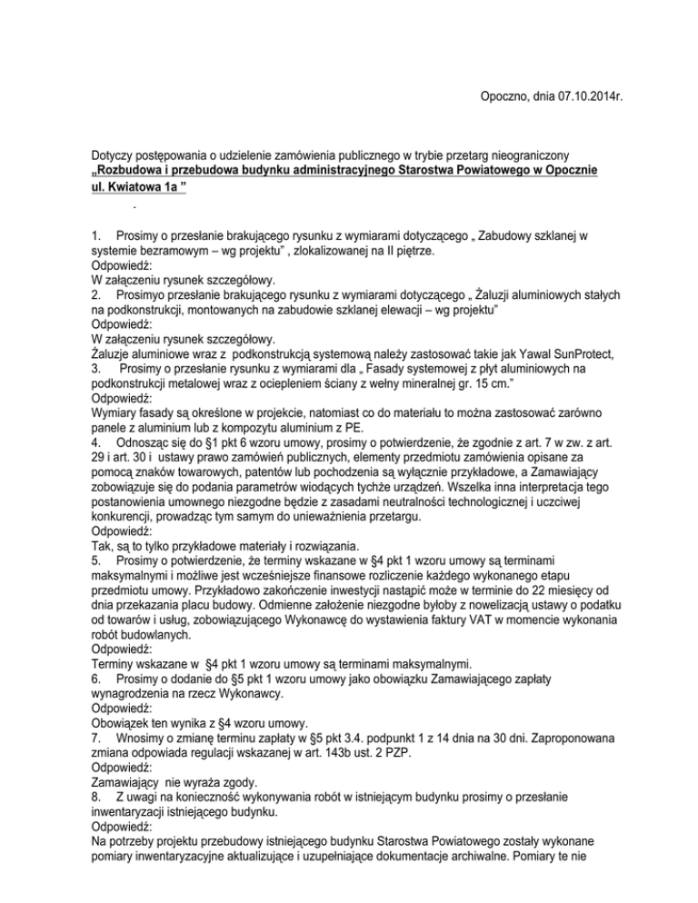 Opoczno, dnia 07.10.2014r. Dotyczy postępowania o udzielenie zamówienia publicznego w trybie przetarg nieograniczony „Rozbudowa i przebudowa budynku administracyjnego Starostwa Powiatowego w Opocznie ul. Kwiatowa 1a ” . 1. Prosimy o przesłanie brakującego rysunku z wymiarami dotyczącego „ Zabudowy szklanej w systemie bezramowym – wg projektu” , zlokalizowanej na II piętrze. Odpowiedź: W załączeniu rysunek szczegółowy. 2. Prosimyo przesłanie brakującego rysunku z wymiarami dotyczącego „ Żaluzji aluminiowych stałych na podkonstrukcji, montowanych na zabudowie szklanej elewacji – wg projektu” Odpowiedź: W załączeniu rysunek szczegółowy. Żaluzje aluminiowe wraz z podkonstrukcją systemową należy zastosować takie jak Yawal SunProtect, 3. Prosimy o przesłanie rysunku z wymiarami dla „ Fasady systemowej z płyt aluminiowych na podkonstrukcji metalowej wraz z ociepleniem ściany z wełny mineralnej gr. 15 cm.” Odpowiedź: Wymiary fasady są określone w projekcie, natomiast co do materiału to można zastosować zarówno panele z aluminium lub z kompozytu aluminium z PE. 4. Odnosząc się do §1 pkt 6 wzoru umowy, prosimy o potwierdzenie, że zgodnie z art. 7 w zw. z art. 29 i art. 30 i ustawy prawo zamówień publicznych, elementy przedmiotu zamówienia opisane za pomocą znaków towarowych, patentów lub pochodzenia są wyłącznie przykładowe, a Zamawiający zobowiązuje się do podania parametrów wiodących tychże urządzeń. Wszelka inna interpretacja tego postanowienia umownego niezgodne będzie z zasadami neutralności technologicznej i uczciwej konkurencji, prowadząc tym samym do unieważnienia przetargu. Odpowiedź: Tak, są to tylko przykładowe materiały i rozwiązania. 5. Prosimy o potwierdzenie, że terminy wskazane w §4 pkt 1 wzoru umowy są terminami maksymalnymi i możliwe jest wcześniejsze finansowe rozliczenie każdego wykonanego etapu przedmiotu umowy. Przykładowo zakończenie inwestycji nastąpić może w terminie do 22 miesięcy od dnia przekazania placu budowy. Odmienne założenie niezgodne byłoby z nowelizacją ustawy o podatku od towarów i usług, zobowiązującego Wykonawcę do wystawienia faktury VAT w momencie wykonania robót budowlanych. Odpowiedź: Terminy wskazane w §4 pkt 1 wzoru umowy są terminami maksymalnymi. 6. Prosimy o dodanie do §5 pkt 1 wzoru umowy jako obowiązku Zamawiającego zapłaty wynagrodzenia na rzecz Wykonawcy. Odpowiedź: Obowiązek ten wynika z §4 wzoru umowy. 7. Wnosimy o zmianę terminu zapłaty w §5 pkt 3.4. podpunkt 1 z 14 dnia na 30 dni. Zaproponowana zmiana odpowiada regulacji wskazanej w art. 143b ust. 2 PZP. Odpowiedź: Zamawiający nie wyraża zgody. 8. Z uwagi na konieczność wykonywania robót w istniejącym budynku prosimy o przesłanie inwentaryzacji istniejącego budynku. Odpowiedź: Na potrzeby projektu przebudowy istniejącego budynku Starostwa Powiatowego zostały wykonane pomiary inwentaryzacyjne aktualizujące i uzupełniające dokumentacje archiwalne. Pomiary te nie zostały wyedytowane w postaci odrębnej części dokumentacji jako inwentaryzacja. Części budynku istniejące z podziałem na pozostawione bez zmian i podlegające rozbiórkom i przebudowie zostały graficznie oznaczone na rysunkach projektu. 9. Wykonanie pokrycia dachu budynku istniejącego w odporności EI30 wiąże się z tym że istniejąca konstrukcja dachu powinna spełniać wymagania R30. Prosimy o potwierdzenie że istniejąca konstrukcja dachu spełnia wymagania R30 lub też dopisanie poz. kosztorysowej Poz. koszt. Nr …. – Zabezpieczenie istniejącej konstrukcji dachu do klasy R30 – 1 m2. Odpowiedź: Przedmiotowa konstrukcja pokrycia dachu oddzielona jest od pomieszczeń ZL przegrodą – stropem R60, a poddasze jest nieużytkowe. W związku z tym nie zachodzi konieczność zabezpieczania konstrukcji pod pokrycie dachu do R30. 10. Zgodnie z poz. kosztorysową 177 w kosztorysie robót budowlanych należy dostarczyć „Nagłośnienie, rzutnik wideo wraz z konstrukcją mocującą, połączenie urządzeń za pomocą okablowania lub Wi-Fi. Taki sposób opisu pozycji jest bardzo szeroki. Prosimy od przesłanie dokumentacji projektowej pozwalającej na precyzyjną i jednoznaczna wycenę poz. Odpowiedź: Wykonanie takiej dokumentacji, która precyzyjnie określa parametry wiązałoby się z jednoznacznym określeniem urządzeń audio co jest sprzeczne z ustawą PZP. W ofercie należy uwzględnić urządzenia odpowiednie dla przewidywanej funkcji i zaprojektowanego pomieszczenia. 11. Zgodnie z opisem PZT należy dokonać wycinki drzew. Prosimy o informację czy Inwestor posiada zgodę na wycinką oraz prosimy o dopisanie poz. kosztorysowej Poz. koszt. Nr . … - Wycinka drzew o średnicy … - szt. 1 Odpowiedź: Decyzja na wycinkę drzew leży po stronie Zamawiającego, którą uzyska po rozstrzygnięciu przetargu. Pozycja kosztorysowa wycięcie drzew wraz z karczowaniem korzeni i wywozem szt – 5 została uwzględniona w przedmiarze robót – zagospodarowanie terenu dział 7 – zieleń poz. 48. 12. Zgodnie z opisem technicznym robót budowlanych rozmieszczenie gaśnic i oznakowania należy wykonać wg INSTRUKCJI BEZPIECZEŃSTWA POŻAROWEGO – wg. odrębnego opracowania. Prosimy o przekazanie tej instrukcji i dopisanie poz. kosztorysowej Poz. koszt. Nr …- Wyposażenie obiektu w podręczny sprzęt gaśniczy (gaśnica proszkowa 4 kg) – szt. 1 Poz. koszt. Nr …- Wyposażenie obiektu w podręczny sprzęt gaśniczy (gaśnica śniegowa 5 kg) – szt. 1 Poz. koszt. Nr …. – wyposażenie obiektu w oznakowanie ewakuacyjne (tabliczki , piktogramy) – szt. 1 Odpowiedź: Zgodnie z projektem umowy § 5 ust. 2 pkt. 2.10. wyposażenie budynku w podręczny sprzęt gaśniczy jak również opracowanie leży po stronie Wykonawcy robót. W związku z tym Wykonawca robót w swojej ofercie winien uwzględnić zarówno opracowanie jak i wyposażenie budynku w ilość sprzętu gaśniczego i oznakowania