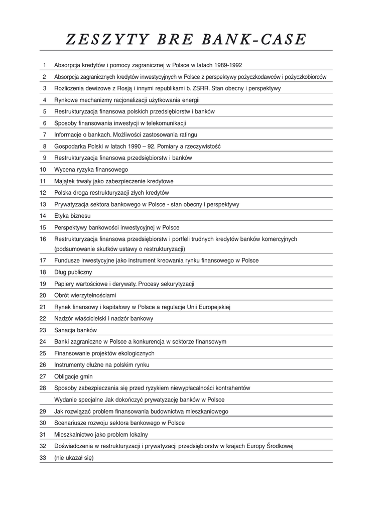 ZESZYTY BRE BANK-CASE 1 Absorpcja kredytów i pomocy zagranicznej w Polsce w latach 1989-1992 2 Absorpcja zagranicznych kredytów inwestycyjnych w Polsce z perspektywy pożyczkodawców i pożyczkobiorców 3 Rozliczenia dewizowe z Rosją i innymi republikami b. ZSRR. Stan obecny i perspektywy 4 Rynkowe mechanizmy racjonalizacji użytkowania energii 5 Restrukturyzacja finansowa polskich przedsiębiorstw i banków 6 Sposoby finansowania inwestycji w telekomunikacji 7 Informacje o bankach. Możliwości zastosowania ratingu 8 Gospodarka Polski w latach 1990 – 92. Pomiary a rzeczywistość 9 Restrukturyzacja finansowa przedsiębiorstw i banków 10 Wycena ryzyka finansowego 11 Majątek trwały jako zabezpieczenie kredytowe 12 Polska droga restrukturyzacji złych kredytów 13 Prywatyzacja sektora bankowego w Polsce - stan obecny i perspektywy 14 Etyka biznesu 15 Perspektywy bankowości inwestycyjnej w Polsce 16 Restrukturyzacja finansowa przedsiębiorstw i portfeli trudnych kredytów banków komercyjnych (podsumowanie skutków ustawy o restrukturyzacji) 17 Fundusze inwestycyjne jako instrument kreowania rynku finansowego w Polsce 18 Dług publiczny 19 Papiery wartościowe i derywaty. Procesy sekurytyzacji 20 Obrót wierzytelnościami 21 Rynek finansowy i kapitałowy w Polsce a regulacje Unii Europejskiej 22 Nadzór właścicielski i nadzór bankowy 23 Sanacja banków 24 Banki zagraniczne w Polsce a konkurencja w sektorze finansowym 25 Finansowanie projektów ekologicznych 26 Instrumenty dłużne na polskim rynku 27 Obligacje gmin 28 Sposoby zabezpieczania się przed ryzykiem niewypłacalności kontrahentów Wydanie specjalne Jak dokończyć prywatyzację banków w Polsce 29 Jak rozwiązać problem finansowania budownictwa mieszkaniowego 30 Scenariusze rozwoju sektora bankowego w Polsce 31 Mieszkalnictwo jako problem lokalny 32 Doświadczenia w restrukturyzacji i prywatyzacji przedsiębiorstw w krajach Europy Środkowej 33 (nie ukazał się) ZESZYTY BRE BANK-CASE 34 Rynek inwestycji energooszczędnych 35 Globalizacja rynków finansowych 36 Kryzysy na rynkach finansowych – skutki dla gospodarki polskiej 37 Przygotowanie polskiego systemu bankowego do liberalizacji rynków kapitałowych 38 Docelowy model bankowości spółdzielczej 39 Czy komercyjna instytucja finansowa może skutecznie realizować politykę gospodarczą państwa? 40 Perspektywy gospodarki światowej i polskiej po kryzysie rosyjskim 41 Jaka reforma podatkowa jest potrzebna dla szybkiego wzrostu gospodarczego? 42 Fundusze inwestycyjne na polskim rynku – znaczenie i tendencje rozwoju 43 Strategia walki z korupcją – teoria i praktyka 44 Kiedy koniec złotego? 45 Fuzje i przejęcia bankowe 46 Budżet 2000 47 Perspektywy gospodarki rosyjskiej po kryzysie i wyborach 48 Znaczenie kapitału zagranicznego dla polskiej gospodarki 49 Pierwszy rok sfery euro – doświadczenia i perspektywy 50 Finansowanie dużych przedsięwzięć o strategicznym znaczeniu dla polskiej gospodarki 51 Finansowanie budownictwa mieszkaniowego 53 Dlaczego Niemcy boją się rozszerzenia strefy euro? 54 Doświadczenia i perspektywy rozwoju sektora finansowego w Europie Środkowo-Wschodniej 55 Portugalskie doświadczenia w restrukturyzacji i prywatyzacji banków 56 Czy warto liczyć inflację bazową? 57 Nowy system emerytalny w Polsce – wpływ na krótko- i długoterminowe perspektywy gospodarki i rynków finansowych 58 Wpływ światowej recesji na polską gospodarkę 59 Strategia bezpośrednich celów inflacyjnych w Ameryce Łacińskiej 59/a Reformy gospodarcze w Ameryce Łacińskiej 60 (nie ukazał się) 61 Stan sektora bankowego w gospodarkach wschodzących – znaczenie prywatyzacji 62 Rola inwestycji zagranicznych w gospodarce