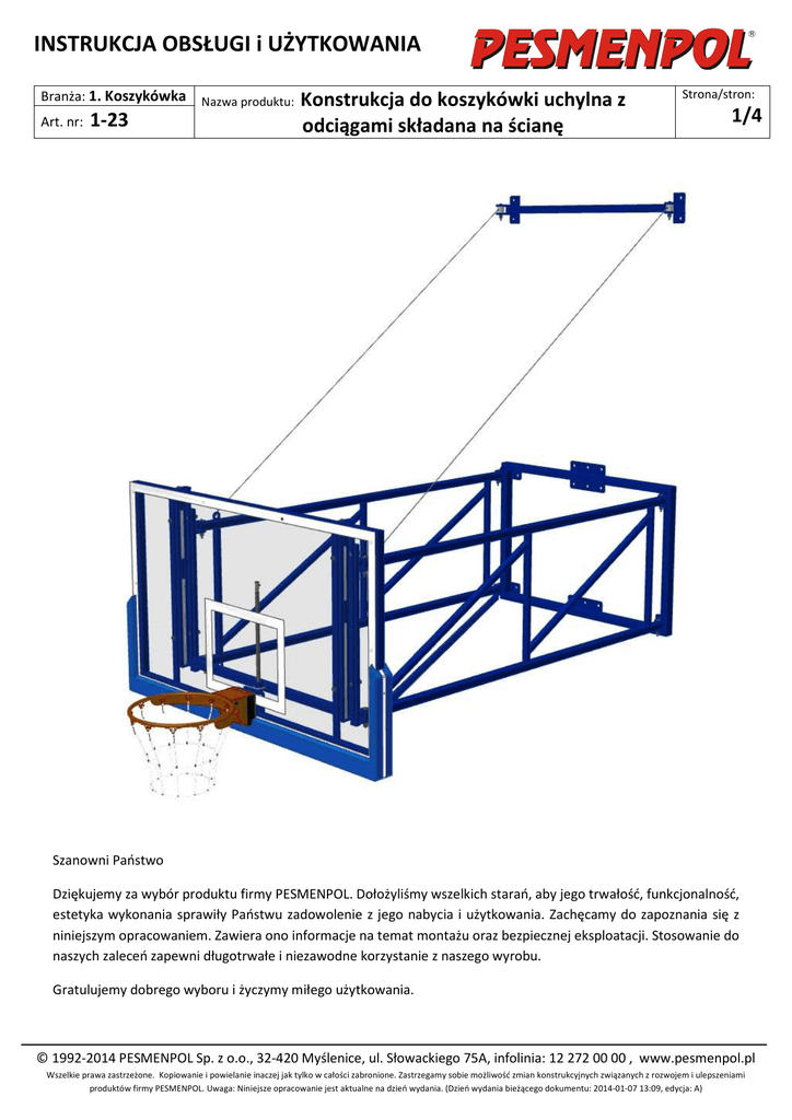 INSTRUKCJA OBSŁUGI i UŻYTKOWANIA Branża: 1. Koszykówka Art. nr: 1-23 Nazwa produktu: Konstrukcja do koszykówki uchylna z odciągami składana na ścianę Strona/stron: 1/4 Szanowni Państwo Dziękujemy za wybór produktu firmy PESMENPOL. Dołożyliśmy wszelkich starań, aby jego trwałość, funkcjonalność, estetyka wykonania sprawiły Państwu zadowolenie z jego nabycia i użytkowania. Zachęcamy do zapoznania się z niniejszym opracowaniem. Zawiera ono informacje na temat montażu oraz bezpiecznej eksploatacji. Stosowanie do naszych zaleceń zapewni długotrwałe i niezawodne korzystanie z naszego wyrobu. Gratulujemy dobrego wyboru i życzymy miłego użytkowania. © 1992-2014 PESMENPOL Sp. z o.o., 32-420 Myślenice, ul. Słowackiego 75A, infolinia: 12 272 00 00 , www.pesmenpol.pl Wszelkie prawa zastrzeżone. Kopiowanie i powielanie inaczej jak tylko w całości zabronione. Zastrzegamy sobie możliwość zmian konstrukcyjnych związanych z rozwojem i ulepszeniami produktów firmy PESMENPOL. Uwaga: Niniejsze opracowanie jest aktualne na dzień wydania. (Dzień wydania bieżącego dokumentu: 2014-01-07 13:09, edycja: A) INSTRUKCJA OBSŁUGI i UŻYTKOWANIA Branża: 1. Koszykówka Art. nr: Nazwa produktu: 1-23 Konstrukcja do koszykówki uchylna z odciągami składana na ścianę Strona/stron: 2/4 Informacje ogólne. Konstrukcja do koszykówki uchylna wykonana jest z profili stalowych. Tablica mocowana jest do dwóch ram bocznych uchylnych [2], te z kolei przymocowane są do ramy ściennej [1], która montowana jest bezpośrednio do konstrukcji nośnej obiektu (ściana, słup itp.). Zespół dwóch lin salowych [4] stanowiących odciąg, przenosi siły obciążające na dodatkową ramę [5]. Tablica [4] składana jest w poziomie na ścianę poprzez ręczne odblokowanie zabezpieczenia i odciągnięcie tablicy. Konstrukcja malowana jest proszkowo wg palety kolorów RAL. Lista części: 1. Rama ścienna 2. Rama boczna uchylna 3. Przekątna z blokadą 4. Linki odciągu 5. Rama odciągu 6. Tablica 7. Obręcz 8. Siatka 9. Uchwyt 5 4 2 1 6 7 3 8 Pozycja użytkowa WYSIĘG Pozycja złożona Konstrukcja może być składana w prawą jak i w lewą stronę. Wysięg konstrukcji mieści się w zakresie od 220cm do 550cm. © 1992-2014 PESMENPOL Sp. z o.o., 32-420 Myślenice, ul. Słowackiego 75A, infolinia: 12 272 00 00 , www.pesmenpol.pl Wszelkie prawa zastrzeżone. Kopiowanie i powielanie inaczej jak tylko w całości zabronione. Zastrzegamy sobie możliwość zmian konstrukcyjnych związanych z rozwojem i ulepszeniami produktów firmy PESMENPOL. Uwaga: Niniejsze opracowanie jest aktualne na dzień wydania. (Dzień wydania bieżącego dokumentu: 2014-01-07 13:09, edycja: A) INSTRUKCJA OBSŁUGI i UŻYTKOWANIA Branża: 1. Koszykówka Art. nr: Nazwa produktu: 1-23 Konstrukcja do koszykówki uchylna z odciągami składana na ścianę Strona/stron: 3/4 Składanie i rozkładanie Do składania oraz rozkładania konstrukcji służy specjalny uchwyt [9]. Za pomocą tego uchwytu należy złapać pierścień blokady i odciągnąć w dół. Pierścień ten umiejscowiony jest na końcu „przekątnej” [3], od strony tablicy. „Przekątna”[3] jest to teleskopowy układ dwóch profili, jeden pracuje wewnątrz drugiego, jej zadaniem jest zablokowanie konstrukcji i zabezpieczenie przed niekontrolowanym złożeniem. 9 3 Po odciągnięciu pierścienia w dół należy pociągnąć całą konstrukcję w kierunku ściany. Konstrukcję składamy w stronę na której znajduje się pierścień blokady. © 1992-2014 PESMENPOL Sp. z o.o., 32-420 Myślenice, ul. Słowackiego 75A, infolinia: 12 272 00 00 , www.pesmenpol.pl Wszelkie prawa zastrzeżone. Kopiowanie i powielanie inaczej jak tylko w całości zabronione. Zastrzegamy sobie możliwość zmian konstrukcyjnych związanych z rozwojem i ulepszeniami produktów firmy PESMENPOL. Uwaga: Niniejsze opracowanie jest aktualne na dzień wydania. (Dzień wydania bieżącego dokumentu: 2014-01-07 13:09, edycja: A) INSTRUKCJA OBSŁUGI i UŻYTKOWANIA Branża: 1. Koszykówka Art. nr: 1-23 Nazwa produktu: Konstrukcja do koszykówki uchylna z odciągami składana na ścianę Strona/stron: 4/4 UWAGI: 1. Zabronione jest wspinanie się na konstrukcje. 2. Zabronione jest przebywanie pod konstrukcją innych osób niż osoba rozkładająca, podczas składania oraz rozkładania. 3. Urządzenie zostało opracowane i przeznaczone do gry w koszykówkę i nie powinno być stosowane do innych celów. 4. Ze względów bezpieczeństwa konstrukcji nie wolno dodatkowo obciążać. 5. Wymiana podzespołów powinna być prowadzona z użyciem oryginalnych części przez osobę do tego odpowiednio przeszkoloną. 6. Przeglądy. Co 3 miesiące należy dokonać przeglądu sprawności elementów zestawu. W przypadku stwierdzenia usterki należy skontaktować się z producentem. 7. Konserwacja. Prace pielęgnacyjne mogą być prowadzone przy pomocy ogólnie dostępnych detergentów przeznaczone do danego rodzaju powierzchni. Ze względów bezpieczeństwa prace te powinna przeprowadzić osoba z uprawnieniami do pracy na wysokościach. © 1992-2014 PESMENPOL Sp. z o.o., 32-420 Myślenice, ul. Słowackiego 75A, infolinia: 12 272 00 00 , www.pesmenpol.pl Wszelkie prawa zastrzeżone. Kopiowanie i powielanie inaczej jak tylko w całości zabronione. Zastrzegamy sobie możliwość zmian konstrukcyjnych związanych z rozwojem i ulepszeniami produktów firmy PESMENPOL. Uwaga: Niniejsze opracowanie jest aktualne na dzień wydania. (Dzień wydania bieżącego dokumentu: 2014-01-07 13:09, edycja: A)