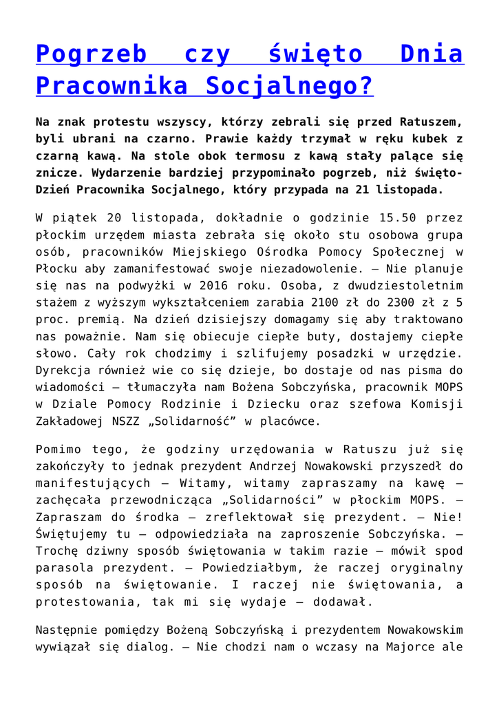Pogrzeb czy święto Pracownika Socjalnego? Dnia Na znak protestu wszyscy, którzy zebrali się przed Ratuszem, byli ubrani na czarno. Prawie każdy trzymał w ręku kubek z czarną kawą. Na stole obok termosu z kawą stały palące się znicze. Wydarzenie bardziej przypominało pogrzeb, niż świętoDzień Pracownika Socjalnego, który przypada na 21 listopada. W piątek 20 listopada, dokładnie o godzinie 15.50 przez płockim urzędem miasta zebrała się około stu osobowa grupa osób, pracowników Miejskiego Ośrodka Pomocy Społecznej w Płocku aby zamanifestować swoje niezadowolenie. – Nie planuje się nas na podwyżki w 2016 roku. Osoba, z dwudziestoletnim stażem z wyższym wykształceniem zarabia 2100 zł do 2300 zł z 5 proc. premią. Na dzień dzisiejszy domagamy się aby traktowano nas poważnie. Nam się obiecuje ciepłe buty, dostajemy ciepłe słowo. Cały rok chodzimy i szlifujemy posadzki w urzędzie. Dyrekcja również wie co się dzieje, bo dostaje od nas pisma do wiadomości – tłumaczyła nam Bożena Sobczyńska, pracownik MOPS w Dziale Pomocy Rodzinie i Dziecku oraz szefowa Komisji Zakładowej NSZZ „Solidarność” w placówce. Pomimo tego, że godziny urzędowania w Ratuszu już się zakończyły to jednak prezydent Andrzej Nowakowski przyszedł do manifestujących – Witamy, witamy zapraszamy na kawę – zachęcała przewodnicząca „Solidarności” w płockim MOPS. – Zapraszam do środka – zreflektował się prezydent. – Nie! Świętujemy tu – odpowiedziała na zaproszenie Sobczyńska. – Trochę dziwny sposób świętowania w takim razie – mówił spod parasola prezydent. – Powiedziałbym, że raczej oryginalny sposób na świętowanie. I raczej nie świętowania, a protestowania, tak mi się wydaje – dodawał. Następnie pomiędzy Bożeną Sobczyńską i prezydentem Nowakowskim wywiązał się dialog. – Nie chodzi nam o wczasy na Majorce ale o tak prozaiczne rzeczy jak opłacenie rachunków. Panie prezydencie opłaty za energię od czasu ostatniej naszej podwyżki wzrosły kilkakrotnie. Nie wszyscy w tym mieście- pana mieście – zaczęła Sobczyńska. – W naszym mieście – zaprotestował prezydent. – W naszym mieście! – podkreśliła rozmówczyni. – Nie wszyscy mają ciepłą wodę, żeby dzieci miały ciepłą wodę ludzie mają termy. Pan sobie wyobraża jaki to jest rachunek? – pytała. – Zgadzam się, ale nie każdy ma termę w mieszkaniu to po pierwsze. Po drugie jeśli chodzi o ceny prądu nie zależy to od prezydenta miasta. Dzisiaj możemy się zastanowić, żeby faktycznie państwa wynagrodzenie było wyższe. Żebyście nie tylko mieli państwo na rachunki ale także na godne życie. Rachunki to jest to minimum. Jeśli ktoś ma termę musi sobie z tym radzić. Z tego co mi wiadomo otrzymali państwo zapewnienie, że będziemy patrzeć na sytuację budżetową miasta. W poprzednim roku nie zaplanowaliśmy żadnych podwyżek dla pracowników sfery budżetowej. Natomiast mając świadomość, że faktycznie państwa wynagrodzenia należą do najniższych, uzyskali państwo informację od skarbnika miasta, że w pierwszej kolejności, jeśli będą środki na podwyżki, to będą one skierowane właśnie w stronę państwa.- spokojnie tłumaczył Andrzej Nowakowski. – Nie proponuję pani ani ciepłych słów, ani ciepłych butów, przede wszystkim bardzo państwu dziękuję, że państwo, dbając o swoich podopiecznych mają świadomość, jak ciężko żyje się w Płocku z różnych powodów. Dlatego zależy mi bardzo, abyście swoją pracę wykonywali w godnych warunkach za godziwe wynagrodzenie. Cieszę się, że tu się spotykamy, jednak proszę jeszcze o cierpliwość. Spotkamy się w marcu i sądzę, że będziemy mieli więcej konkretów – podsumował dyskusję prezydent. Protest przed Ratuszem na dzień przed świętem Dnień Pracownika Socjalnego zorganizował Niezależny Samorządny Związek Zawodowy „Solidarność”, działający w Miejskim Ośrodku Pomocy Społecznej w Płocku. Pracownicy jednostki chcieli zwrócić uwagę prezydenta Andrzeja Nowakowskiego na trudną sytuację finansową pracowników placówki. Pracownicy wyrazili swoje niezadowolenie z powodu szczególnie niskich płac oraz rozbieżności w zarobkach pomiędzy pracownikami innych jednostek budżetowych miasta, a urzędem miasta. Lena Rowicka