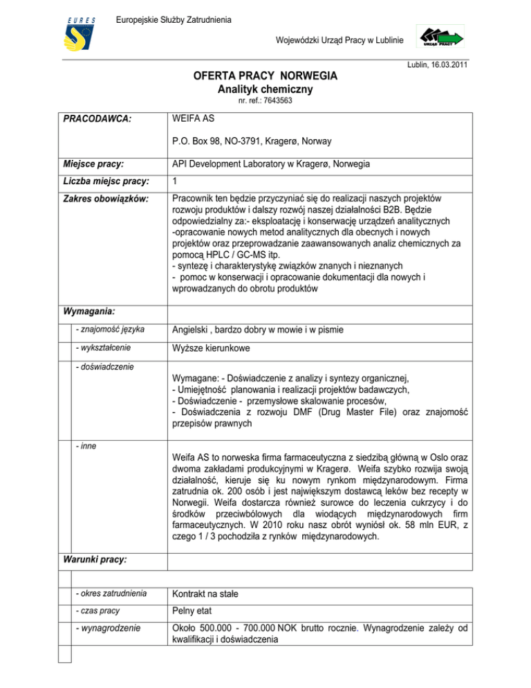 Europejskie SłuŜby Zatrudnienia Wojewódzki Urząd Pracy w Lublinie Lublin, 16.03.2011 OFERTA PRACY NORWEGIA Analityk chemiczny nr. ref.: 7643563 PRACODAWCA: WEIFA AS P.O. Box 98, NO-3791, Kragerø, Norway Miejsce pracy: API Development Laboratory w Kragerø, Norwegia Liczba miejsc pracy: 1 Zakres obowiązków: Pracownik ten będzie przyczyniać się do realizacji naszych projektów rozwoju produktów i dalszy rozwój naszej działalności B2B. Będzie odpowiedzialny za:- eksploatację i konserwację urządzeń analitycznych -opracowanie nowych metod analitycznych dla obecnych i nowych projektów oraz przeprowadzanie zaawansowanych analiz chemicznych za pomocą HPLC / GC-MS itp. - syntezę i charakterystykę związków znanych i nieznanych - pomoc w konserwacji i opracowanie dokumentacji dla nowych i wprowadzanych do obrotu produktów Wymagania: - znajomość języka Angielski , bardzo dobry w mowie i w pismie - wykształcenie WyŜsze kierunkowe - doświadczenie Wymagane: - Doświadczenie z analizy i syntezy organicznej, - Umiejętność planowania i realizacji projektów badawczych, - Doświadczenie - przemysłowe skalowanie procesów, - Doświadczenia z rozwoju DMF (Drug Master File) oraz znajomość przepisów prawnych - inne Weifa AS to norweska firma farmaceutyczna z siedzibą główną w Oslo oraz dwoma zakładami produkcyjnymi w Kragerø. Weifa szybko rozwija swoją działalność, kieruje się ku nowym rynkom międzynarodowym. Firma zatrudnia ok. 200 osób i jest największym dostawcą leków bez recepty w Norwegii. Weifa dostarcza równieŜ surowce do leczenia cukrzycy i do środków przeciwbólowych dla wiodących międzynarodowych firm farmaceutycznych. W 2010 roku nasz obrót wyniósł ok. 58 mln EUR, z czego 1 / 3 pochodziła z rynków międzynarodowych. Warunki pracy: - okres zatrudnienia Kontrakt na stałe - czas pracy Pelny etat - wynagrodzenie Około 500.000 - 700.000 NOK brutto rocznie. Wynagrodzenie zaleŜy od kwalifikacji i doświadczenia - dodatkowe informacje Rekrutacja: Kwalifikacje personalne: - Nowatorskie, entuzjastyczne podejście do realizacji projektów zgodnie z uzgodnionymi warunkami - wydajność pracy - osoba praktyczna posiadająca umiejętności komunikacyjne, niezaleŜna, sumienna, zorganizowana i zaangaŜowana CV i list motywacyjny drogą elektroniczną na adres e-mail: [email protected] lub tradycyjnie na adres: WEIFA AS, P.O. Box 98, NO3791 Kragerø, Norway Uwaga: Na podstawie ustawy o ochronie danych osobowych z dnia 29 sierpnia 1997 r. (Dz. U. z 2002 r. Nr 101, poz. 926 ze zm.) informujemy, Ŝe administratorem danych osobowych wskazanych w dokumentach przekazanych w odpowiedzi na ofertę pracy jest: WEIFA AS, P.O. Box 98, NO-3791 Kragerø, Norway Dane osobowe wskazane dobrowolnie w dokumentach będą przetwarzane i udostępniane publicznym słuŜbom zatrudnienia, pracodawcom lub podmiotom reprezentującym pracodawców do celów związanych z pośrednictwem pracy w ramach sieci EURES, na podstawie ustawy z dnia 20 kwietnia 2004 r. o promocji zatrudnienia i instytucjach rynku pracy (Dz. U. z 2008 r. Nr 69, poz. 415 ze zm.) przez okres konieczny do osiągnięcia celu określonego w przedmiotowej ustawie. Osobie, której dane osobowe dotyczą przysługuje prawo dostępu do ich treści i prawo ich poprawiania. Stosunek pracy z pracodawcą zagranicznym będzie zawarty w ramach prawa obowiązującego w kraju zatrudnienia. Oznacza to, Ŝe wszelkie roszczenie z tytułu nie wywiązywania się pracodawcy z warunków zawartych w umowie o pracę, dochodzić moŜna wyłącznie w sądzie pracy w kraju zatrudnienia. W sytuacjach losowych pomoc polskich placówek konsularnych ogranicza się do ewentualnego udzielenia doraźnej pomocy ( np. kredytu na zakup biletu powrotnego do Polski ). Urząd Pracy nie ma moŜliwości pośredniczenia ani reprezentowania pracownika przed sądem kraju zatrudnienia, w przypadku wystąpienia sporu z pracodawcą. Urząd Pracy dokłada wszelkich starań, aby oferty pracy będące w zasobach urzędu były rzetelne i wiarygodne. PoniewaŜ wszystkie oferty pracy pochodzą od osób trzecich Urząd Pracy zastrzega, Ŝe odpowiedzialność za ewentualne rozbieŜności pomiędzy warunkami pracy zaprezentowanymi w niniejszej ofercie a warunkami zaproponowanymi przez potencjalnego pracodawcę ponosi pracodawca. OFERTA WAśNA DO 20 marca 2011. Więcej ofert pracy za granicą: www.ec.europa.eu/eures www.eures.wup.lublin.pl