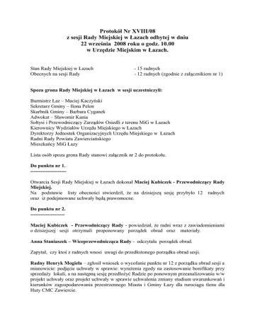 Protokół Nr XVIII/08 z sesji Rady Miejskiej w Łazach odbytej w dniu 22 września 2008 roku o godz. 10.00 w Urzędzie Miejskim w Łazach. Stan Rady Miejskiej w Łazach Obecnych na sesji Rady - 15 radnych - 12 radnych (zgodnie z załącznikiem nr 1) Spoza grona Rady Miejskiej w Łazach w sesji uczestniczyli: Burmistrz Łaz – Maciej Kaczyński Sekretarz Gminy – Ilona Pelon Skarbnik Gminy – Barbara Cyganek Adwokat – Sławomir Kania Sołtysi i Przewodniczący Zarządów Osiedli z terenu MiG w Łazach Kierownicy Wydziałów Urzędu Miejskiego w Łazach Dyrektorzy Jednostek Organizacyjnych Urzędu Miejskiego w Łazach Radni Rady Powiatu Zawierciańskiego Mieszkańcy MiG Łazy Lista osób spoza grona Rady stanowi załącznik nr 2 do protokołu. Do punktu nr 1. --------------------Otwarcia Sesji Rady Miejskiej w Łazach dokonał Maciej Kubiczek - Przewodniczący Rady Miejskiej. Na podstawie listy obecności stwierdził, że na dzisiejszą sesję przybyło 12 radnych oraz iż podejmowane uchwały będą prawomocne. Do punktu nr 2. -------------------Maciej Kubiczek - Przewodniczący Rady - powiedział, że radni wraz z zawiadomieniami o dzisiejszej sesji otrzymali proponowany porządek obrad oraz materiały. Anna Staniaszek – Wiceprzewodnicząca Rady - odczytała porządek obrad. Zapytał, czy ktoś z radnych wnosi uwagi do przedłożonego porządku obrad sesji. Radny Henryk Mogieła – zgłosił wniosek o wycofanie punktu nr 12 z porządku obrad sesji a mianowicie: podjęcie uchwały w sprawie: wyrażenia zgody na zastosowanie bonifikaty przy sprzedaży lokali, a na następną sesję przedłożyć Radzie po ponownym przeanalizowaniu w/w projekt uchwały oraz projekt uchwały w sprawie uchwalenia zmiany studium uwarunkowań i kierunków zagospodarowania przestrzennego Miasta i Gminy Łazy dla rurociągu tlenu dla Huty CMC Zawiercie. Maciej Kaczyński – Burmistrz Miasta Łaz- zaproponował, aby nie wycofywać z porządku obrad punktu dot. podjęcia uchwały w sprawie: wyrażenia zgody na zastosowanie bonifikaty przy sprzedaży lokali, dlatego, że kolejna ważna sprawa spowoduje opóźnienia w załatwianiu Spraw dla mieszkańców, którzy są chętni do wykupu mieszkań i ciągle pytają w tym temacie. Władysław Nowak – Przewodniczący Komisji Budżetowej – poparł prośbę Burmistrza w sprawie podjęcia omawianego projektu uchwały oraz zaapelował do Radnych o rozsądne podejście do tego tematu. Przewodniczący Rady poddał pod głosowanie wniosek radnego Henryka Mogieły, aby z porządku obrad sesji wycofać zgłosił wniosek o wycofanie punktu nr 12 z porządku obrad sesji a mianowicie: podjęcie uchwały w sprawie: wyrażenia zgody na zastosowanie bonifikaty przy sprzedaży lokali. W głosowaniu udział brało 12 radnych. Rada Miejska w Łazach odrzuciła wniosek radnego Henryka Mogieły w sprawie wycofania pkt 12 z porządku obrad sesji. W głosowaniu udział brało 12 radnych. Następnie Przewodniczący Rady - poddał pod głosowanie porządek obrad w przedstawionej formie radnym. W głosowaniu udział brało 12 radnych. Rada Miejska w Łazach jednogłośnie ( 12 głosów za ) przyjęła porządek obrad sesji Rady Miejskiej z dnia 22 września 2008 roku jak niżej: 1.Otwarcie sesji i stwierdzenie quorum. 2.Zatwierdzenie porządku obrad. 3.Przyjęcie protokołu z sesji z dnia 29 sierpnia 2008 r. 4.Informacja dotycząca działalności Burmistrza Łaz i Urzędu za okres między sesjami Rady. 5.Interpelacje i zapytania radnych. 6.Informacja z wykonania budżetu Gminy Łazy i planów finansowych gminnych osób prawnych za I półrocze 2008 roku. 7.Podjęcie uchwały w sprawie: zmian do budżetu Gminy Łazy na rok 2008. 8.Podjęcie uchwały w sprawie: zaciągnięcia pożyczki z Wojewódzkiego Funduszu Ochrony Środowiska i Gospodarki Wodnej w Katowicach. 9.Podjęcie uchwały w sprawie: udzielenia pomocy finansowej Gminie Blachownia. 10.Podjęcie uchwały w sprawie: udzielenia pomocy finansowej Powiatowi Zawierciańskiemu na realizację zadania w ciągu drogi powiatowej nr 14286 Łazy-Wysoka o nazwie „remont nawierzchni chodnika przy ul.Fabrycznej w Wysokiej”. 11.Podjęcie uchwały w sprawie: przystąpienia Gminy Łazy do Stowarzyszenia Lokalna Grupa Działania „Perła Jury” w Łazach. 12.Podjęcie uchwały w sprawie: wyrażenia zgody na zastosowanie bonifikaty przy sprzedaży lokali. 2 13.Podjęcie uchwały w sprawie: uchwalenia zmiany Studium uwarunkowań i kierunków zagospodarowania przestrzennego Miasta i Gminy Łazy dla rurociągu tlenu do Huty CMC Zawiercie. 14.Odpowiedzi na interpelacje. 15.Zapytania i wolne wnioski. 16.Zamknięcie sesji. Do punktu nr 3. Maciej Kubiczek – Przewodniczący Rady Miejskiej w Łazach – zapytał radnych, czy wnoszą uwagi do protokołu z sesji Rady Miejskiej w Łazach z dnia 29 sierpnia 2008 roku . Protokół były wyłożone do wglądu w Biurze Rady oraz przed sesją na sali obrad. Radni uwag nie wnieśli. Rada Miejska w Łazach przyjęła protokół Nr XVII/08 z sesji Rady Miejskiej w Łazach z dnia 29 sierpnia 2008 r. przez aklamację. Do punktu nr 4. Maciej Kaczyński – Burmistrz Łaz – przedstawił informację dotyczącą działalności Burmistrza Łaz i Urzędu za okres między sesjami Rady, która stanowi załącznik do protokołu. Radny Jan Hoffman – zapytał, jaki zakres prac z Dyrektorem Gajdą omawiali na spotkaniu, o który Burmistrz wspomniał w informacji, co będzie robione w Gminie Łazy w zakresie dróg powiatowych. Burmistrz udzieli odpowiedzi radnemu w odpowiedziach na interpelacje. Uwag i zapytań do przedłożonej informacji radni nie zgłosili. Przewodniczący Rady Miejskiej w Łazach stwierdził, że informacja dot. działalności Burmistrz Łaz i Urzędu za okres między sesjami Rady została przyjęta przez Radę przez aklamację. Do punktu nr 5. Radny Stefan Kubasik – powiedział, że na ostatniej komisji dowiedział się, że dzieci ze szkół wiejskich będą miały ograniczony dostęp do korz