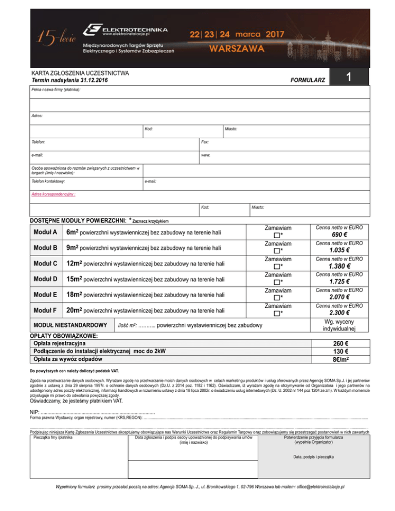 KARTA ZGŁOSZENIA UCZESTNICTWA Termin nadsyłania 31.12.2016 1 FORMULARZ Pełna nazwa firmy (płatnika): Adres: Kod: Miasto: Telefon: Fax: e-mail: www. Osoba upoważniona do rozmów związanych z uczestnictwem w targach (imię i nazwisko): Telefon kontaktowy: e-mail: Adres korespondencyjny : Kod: Miasto: DOSTĘPNE MODUŁY POWIERZCHNI: * Zaznacz krzyżykiem Moduł A Moduł B Moduł C 6m2 powierzchni wystawienniczej bez zabudowy na terenie hali 9m2 powierzchni wystawienniczej bez zabudowy na terenie hali 12m2 powierzchni wystawienniczej bez zabudowy na terenie hali Moduł D 15m2 powierzchni wystawienniczej bez zabudowy na terenie hali Moduł E 18m2 powierzchni wystawienniczej bez zabudowy na terenie hali Moduł F 20m2 powierzchni wystawienniczej bez zabudowy na terenie hali MODUŁ NIESTANDARDOWY Ilość m2: ……….. powierzchni wystawienniczej bez zabudowy OPŁATY OBOWIĄZKOWE: Opłata rejestracyjna Podłączenie do instalacji elektrycznej moc do 2kW Opłata za wywóz odpadów Zamawiam Cenna netto w EURO * 690 € Zamawiam Cenna netto w EURO * 1.035 € Zamawiam Cenna netto w EURO * 1.380 € Zamawiam Cenna netto w EURO * 1.725 € Zamawiam Cenna netto w EURO * 2.070 € Zamawiam Cenna netto w EURO * 2.300 € Wg. wyceny indywidualnej 260 € 130 € 8€/m2 Do powyższych cen należy doliczyć podatek VAT. Zgoda na przetwarzanie danych osobowych. Wyrażam zgodę na przetwarzanie moich danych osobowych w celach marketingu produktów i usług oferowanych przez Agencję SOMA Sp.J. i jej partnerów zgodnie z ustawą z dnia 29 sierpnia 1997r. o ochronie danych osobowych (Dz.U. z 2014 poz. 1182 i 1162). Oświadczam, iż wyrażam zgodę na otrzymywanie od Organizatora i jego partnerów na udostępniony adres poczty elektronicznej, informacji handlowych w rozumieniu ustawy z dnia 18 lipca 2002r. o świadczeniu usług internetowych (Dz. U. 2002 nr 144 poz 1204 ze zm). W każdym momencie przysługuje mi prawo do odwołania powyższej zgody. Oświadczamy, że jesteśmy płatnikiem VAT. NIP: .................................................................................... Forma prawna Wystawcy, organ rejestrowy, numer (KRS,REGON): …................................................................................................................................................................................................................ ................................................................................................................................................................................................................................................................................................................................ Podpisując niniejsza Kartę Zgłoszenia Uczestnictwa akceptujemy obowiązujące nas Warunki Uczestnictwa oraz Regulamin Targowy oraz zobowiązujemy się przestrzegać postanowień w nich zawartych Pieczątka fmy /płatnika Potwierdzenie przyjęcia formularza Data zgłoszenia i podpis osoby upoważnionej do podpisywania umów (wypełnia Organizator) (imię i nazwisko) Data, podpis i pieczątka Wypełniony formularz prosimy przesłać pocztą na adres: Agencja SOMA Sp. J., ul. Bronikowskiego 1, 02-796 Warszawa lub mailem: [email protected] ZAMÓWIENIE BUDOWY STOISKA U ORGANIZATORA Termin nadsyłania 31.12.2016 FORMULARZ 1A NAPIS NA FRYZIE (max. 25 znaków)* Osoba upoważniona do prowadzenia rozmów związanych z budową stoiska: Imię i nazwisko: Telefon kontaktowy: e-mail: ZAMAWIAMY TYP ZABUDOWY: TYP ZABUDOWY OBEJMUJE Cena zabudowy 1m2 netto w EURO Ilość pow. do zabudowy w m2 Wartość netto w EURO 40 € ________m 2 _____€ 55€ ________m 2 _____€ 65€ ________m 2 _____€ STANDARD zabudowę typu OCTANORMA w kolorze białym o wysokości 2,50 m, fryz biały od frontu stoiska,· wykładzinę podłogową w kolorze szarym, napis na fryzie, meble – dla zabudowy do 12 m2 : 1 stół i 4 krzesła tapicerowane, dodatkowo: 1 stół i 4 krzesła tapicerowane, na każde, następne pełne 12 m2 zabudowy, mini zaplecze (1 × 1 m) z drzwiami dla zabudowy od 12 m2, 2 punkty elektryczne po 2 gniazda, oświetlenie: 1 punkt świetlny na każde 3 m2 zabudowy, kosz na śmiecie, wieszak. FORMULARZ DODATKOWEGO WYPOSAŻENIA OTRZYMACIE PAŃSTWO PO ZŁOŻENIU ZAMÓWIENIA BUDOWY STOISKA STANDARD SILVER Ściany białe z płyty laminowanej 16 mm(nakładanej na stelaż) do wysokości 2,8 m oddzielające wynajętą powierzchnię od sąsiadujących z nią stoisk innych wystawców, konstrukcja stoiska z systemu MAXIMA, słupy wysokości 3 m, wypełnienie fryzowe z nazwą firmy oraz numerem stoiska na każdą otwartą stronę stoiska (nazwa firmy do 25 znaków), 1 podwójne gniazdo elektryczne na każde pełne 10m2 stoiska, 1 stół kwadratowy i 4 wyściełane krzesła na każde pełne 10m2 stoiska, zaplecze o powierzchni 1m2 z drzwiami uchylnymi, obudowane płytą, kosz na śmieci, wykładzina targowa w kolorze szarym FORMULARZ DODATKOWEGO WYPOSAŻENIA OTRZYMACIE PAŃSTWO PO ZŁOŻENIU ZAMÓWIENIA BUDOWY STOISKA STANDARD SILVER PLUS Ściany białe z płyty laminowanej 16 mm (nakładanej na stelaż) do wysokości 2,8 m oddzielające wynajętą powierzchnię od sąsiadujących z nią stoisk innych wystawców, konstrukcja stoiska z systemu MAXIMA, słupy wysokości 3 m, wypełnienie fryzowe z nazwą firmy oraz numerem stoiska na każdą otwartą stronę stoiska (nazwa firmy do 25 znaków), 1 podwójne gniazdo elektryczne na każde pełne 10m2 stoiska, 1 stół kwadratowy i 4 wyściełane krzesła na każde pełne 10m2 stoiska, zaplecze o powierzchni 1m2 z drzwiami uchylnymi, obudowane płytą, sufit rusztowy nad całym stoiskiem, kosz na śmieci, wykładzina targowa w kolorze szarym FORMULARZ DODATKOWEGO WYPOSAŻENIA OTRZYMACIE PAŃSTWO PO ZŁOŻENIU ZAMÓWIENIA BUDOWY STOISKA STANDARD COMFORT STANDARD COMFORT Z SUFITEM Oferujemy dwa typy standardu comfort: z sufitem do wieszania opraw lub ladą 100x50x100cm i podestem 100x100x100cm 75 € zabudowę z sytemu MAXIMA w kol