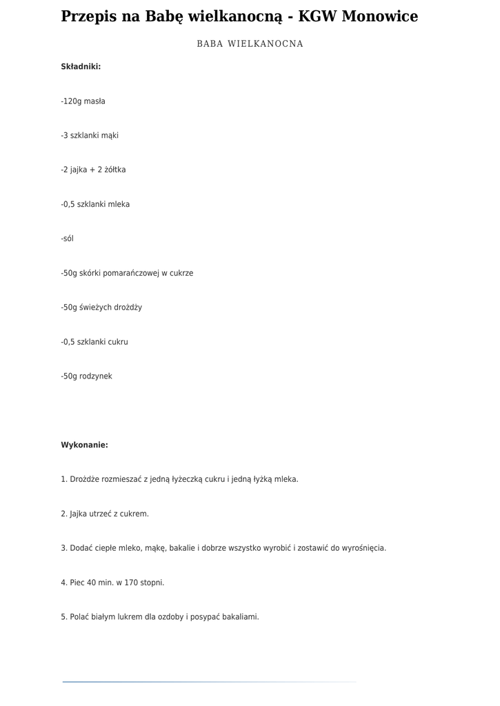 Przepis na Babę wielkanocną - KGW Monowice BA B A W IE L K A NOC NA Składniki: -120g masła -3 szklanki mąki -2 jajka + 2 żółtka -0,5 szklanki mleka -sól -50g skórki pomarańczowej w cukrze -50g świeżych drożdży -0,5 szklanki cukru -50g rodzynek Wykonanie: 1. Drożdże rozmieszać z jedną łyżeczką cukru i jedną łyżką mleka. 2. Jajka utrzeć z cukrem. 3. Dodać ciepłe mleko, mąkę, bakalie i dobrze wszystko wyrobić i zostawić do wyrośnięcia. 4. Piec 40 min. w 170 stopni. 5. Polać białym lukrem dla ozdoby i posypać bakaliami.
