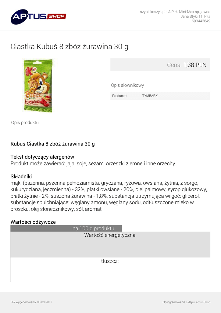 szybkikoszyk.pl - A.P.H. Mini-Max sp, jawna Jana Styki 11, Piła 693443849 Ciastka Kubuś 8 zbóż żurawina 30 g Cena: 1,38 PLN Opis słownikowy Producent TYMBARK Opis produktu Kubuś Ciastka 8 zbóż żurawina 30 g Tekst dotyczący alergenów Produkt może zawierać: jaja, soję, sezam, orzeszki ziemne i inne orzechy. Składniki mąki (pszenna, pszenna pełnoziarnista, gryczana, ryżowa, owsiana, żytnia, z sorgo, kukurydziana, jęczmienna) - 32%, płatki owsiane - 20%, olej palmowy, syrop glukozowy, płatki żytnie - 2%, suszona żurawina - 1,8%, substancja utrzymująca wilgoć: glicerol, substancje spulchniające: węglany amonu, węglany sodu, odtłuszczone mleko w proszku, olej słonecznikowy, sól, aromat Wartości odżywcze na 100 g produktu Wartość energetyczna tłuszcz: Plik wygenerowano: 08-03-2017 Oprogramowanie sklepu: AptusShop szybkikoszyk.pl - A.P.H. Mini-Max sp, jawna Jana Styki 11, Piła 693443849 w tym kwasy tłuszczowe nasycone węglowodany: w tym cukry błonnik białko sól Nazwa produktu uregulowana prawnie Wielozbożowe ciasteczka z żurawiną. Marka Kubuś Cechy 8 zbóż, źródło błonnika - pszenica, owies, gryka, żyto, sorgo, ryż, kukurydza, jęczmień Marka standaryzowana Marka: Kubuś Adres firmy ul. Chopina 39 34-100 Wadowice Plik wygenerowano: 08-03-2017 Oprogramowanie sklepu: AptusShop szybkikoszyk.pl - A.P.H. Mini-Max sp, jawna Jana Styki 11, Piła 693443849 Company Name MW-GMW Sp. z o.o. Sp. k. Oświadczenia żywieniowe źródło błonnika Zalecenia dla alergików Jęczmień: Zawiera Owies: Zawiera Pszenica: Zawiera Jaja: Może zawierać Mleko: Zawiera Orzechy: Może zawierać Orzeszki ziemne: Może zawierać Żyto: Zawiera Soja: Zawiera Sezam: Może zawierać Przechowywanie Przechowywać w suchym i chłodnym miejscu. Rodzaj przechowywania Typ: Przechowywać w temperaturze otoczenia Rozmiar opakowania 30 Jednostka (tekst opisowy) g Średnia miara Średnia miara (e) Jednostka (specyficzna) Jednostka (specyficzna): Gramów Rodzaj opakowania Plik wygenerowano: 08-03-2017 Oprogramowanie sklepu: AptusShop szybkikoszyk.pl - A.P.H. Mini-Max sp, jawna Jana Styki 11, Piła 693443849 Typ: Zgrzewane Wymiar liczbowy Wymiar liczbowy: 30 Wymiar Wymagana wysokość na półce: 161 Wymagana szerokość na półce: 99 Wymagana głębokość na półce: 24 Waga Waga brutto: 33 Sprzedaż jednostkowa Wysokość: 161 Szerokość: 99 Głębokość: 24 Opakowanie logistyczne GTIN: 05901067402583 Adres zwrotny MW-GMW Sp. z o.o. Sp. k. ul. Chopina 39 34-100 Wadowice www.kubus.pl Adres dystrybutora MW-GMW Sp. z o.o. Sp. k. ul. Chopina 39 34-100 Wadowice Adres internetowy www.kubus.pl Języki na opakowaniu polski Język produktu Główny język opisu: polski Język danych: polski Podzielony opis produktu Plik wygenerowano: 08-03-2017 Oprogramowanie sklepu: AptusShop szybkikoszyk.pl - A.P.H. Mini-Max sp, jawna Jana Styki 11, Piła 693443849 Nazwa funkcjonalna: Ciastka 8 zbóż Wariant: żurawina Plik wygenerowano: 08-03-2017 Powered by TCPDF (www.tcpdf.org) Oprogramowanie sklepu: AptusShop